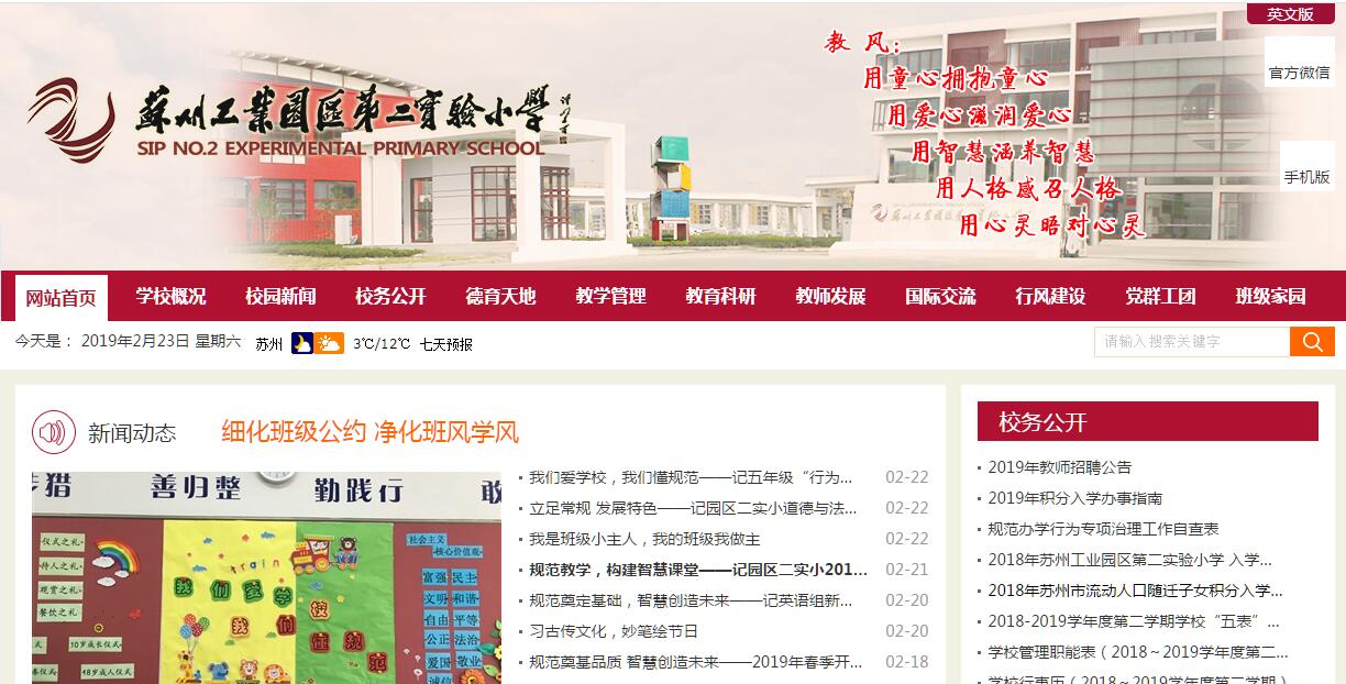 蘇州工業(yè)園區(qū)第二實驗小學是蘇州工業(yè)園區(qū)管委會投資建設的全日制公辦小學。學校座落于園區(qū)行政中心的東南方,占地面積為 39744 平方米,建筑面積為 23213 平方米,綠化面積為 16295 平方米。自 2004 年 9 月開辦以來,學校在園區(qū)管委會、園區(qū)教育局的關心和領導下,以優(yōu)良的師資隊伍,先進的辦學理念,獨特的人文管理,優(yōu)質(zhì)的教育服務贏得了社會各界的認可。學校始終秉承“志遠行近”的校訓,堅持“全心享受品質(zhì)教育,為人生奠基”的辦學理念,努力營造“重思考的學校,愛學習的群體”的校風,倡導“用童心擁抱童心,用愛心滋潤愛心,用智慧涵養(yǎng)智慧,用人格感召人格,用心靈晤對心靈”的教風,立志培養(yǎng)“會生存、會做人、會學習”的具有現(xiàn)代文明素養(yǎng)的國際小公民,努力把學校建設成為融東西方文化于一體的現(xiàn)代化、國際化、特色化的品質(zhì)學校。學校建有60個標準教室,配置了能滿足教學需要的信息、科學、美術、音樂等專業(yè)教室,建設了能容納300多人的報告廳,面積為3057平方米的室內(nèi)風雨操場,長250米的塑膠跑道。學校還根據(jù)自身特點建成了攀巖墻、網(wǎng)球場等先進的體育設施。學校圖書館已創(chuàng)建成為蘇州市一類圖書館,學校的教室和專用室場都配有多媒體教學設備,電子信息設備達到省標一類要求。學校有獨特的校園色彩,有濃郁的育人環(huán)境,文化建設的點點滴滴寓教于樂。學校目前有63個班級,有165名專任教師,其中江蘇省特級教師1名,大市級學科帶頭人2名,學校區(qū)級及以上的教學骨干比例在同類學校中名列前茅,已形成了一支由“知名教師引領,骨干教師支撐,新銳教師加盟”的師資隊伍。學校高舉“品質(zhì)教育”的旗幟,針對不同孩子的不同興趣,定制個性化社團揚長課程,開設了合唱、舞蹈、器樂、美術、輪滑、網(wǎng)頁制作、科技航模等校級揚長社團30余個。學校還系統(tǒng)開展禮儀規(guī)范教育、家族德育建設、大師同行活動、校園節(jié)日文化等特色活動,使學生的學習生活豐富多彩,特長興趣張揚凸現(xiàn),情感意識自信和諧,努力開拓學生視野,提高學生綜合素質(zhì),為學生的終生發(fā)展服務。學校積極開展國際理解教育,已與加拿大、新加坡、澳大利亞、英國等國家的教育管理機構及知名小學建立了友好關系,加拿大、新加坡的省市教育局長數(shù)次組織校長團到我校進行訪問交流。學校每年組織學生赴加拿大、澳大利亞進行為期四個月的浸濡修學和赴新加坡開展游學活動,每學期與英國德威學校園區(qū)校開展學生互訪互學活動或浸濡體驗活動。此外還開展了世界環(huán)保夏令營、中美學生夏令營、“世界看奧運,童眼看世界”等國際化活動。在上級領導的關心和指導下,在全體師生的努力和進取中,學校先后獲得了“蘇州市依法治校先進單位”“蘇州市雙語實驗學?!薄疤K州市語言文字規(guī)范化優(yōu)秀學校”“二類城市語言文字工作評估突出貢獻獎”“無邪教學校市級示范點”“廉潔文化進校園市級示范點”“蘇州市一類圖書館學?!薄疤K州市平安校園”“蘇州市信息化先進學校”“蘇州市中小學校藝術教育工作優(yōu)秀學?!薄疤K州市德育示范學校”“蘇州市信息化示范學?!薄疤K州市常規(guī)管理示范小學”“蘇州市教育現(xiàn)代化小學”“蘇州市文明單位”“江蘇省現(xiàn)代教育技術應用先進單位”“江蘇省標準化自然合格實驗室學校”“江蘇省綠色學?!薄敖K省健康促進學校(金獎)”“江蘇省體育傳統(tǒng)項目學校(乒乓球)”近50項榮譽,成為“蘇州市網(wǎng)上家長學校優(yōu)秀基地”“中國教育學會十一五立項課題研究中期總結教科研先進學?!薄靶W教育科研論壇理事單位”“中國教育學會教育專業(yè)委員會實驗學?!保群蠼哟私?00余批國內(nèi)外教育代表團的考察,成為蘇州市教育系統(tǒng)又一所窗口示范學校。教育部陳小婭副部長視察后說:“這樣的學校國內(nèi)少見,世界一流!”,江蘇省教育廳沈健廳長視察后欣然為學校題詞:“志存高遠須積厚流廣,堅持不懈定斗轉(zhuǎn)星移!”,國際教育專家贊譽學?!笆墙逃軐W與教育實踐的理想結合,是富有文化氣息的現(xiàn)代化小學,是一所沒有歷史但用心譜寫歷史的新建學?!薄LK州工業(yè)園區(qū)第二實驗小學全校教師致力于精心打造特色品牌,鑄教育輝煌;讓孩子們?nèi)南硎芷焚|(zhì)教育,為人生奠基!