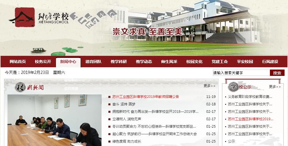 蘇州工業(yè)園區(qū)斜塘學校因園區(qū)教育布局的調整,2011年11月由原第七中學和原斜塘實小合并組建而成。學校位于園區(qū)湖東斜塘地區(qū)敦煌路,南接獨墅湖科教創(chuàng)新區(qū),北依斜塘老街,西靠美麗的金雞湖,交通便捷,環(huán)境優(yōu)美。學校占地面積65706平方米,建筑面積45000平方米,辦學規(guī)模為8軌72個班,是一所全日制九年一貫制學校,為管委會直屬事業(yè)單位。學?,F(xiàn)有45個教學班,1861名學生,教職員工173名,專任教師162名,擁有蘇州市學科帶頭人、蘇州市名教師、園區(qū)學科帶頭人等骨干教師53名。依托斜塘地區(qū)悠久的人文傳統(tǒng)和獨特的生態(tài)資源,在園區(qū)智慧教育理念的引領下,斜塘學校積極順應教育“現(xiàn)代化、均衡化、國際化、特色化”的趨勢,以“美好人生,在這里延伸”為核心辦學理念,內(nèi)涵是指“美好”是一種愿景,也是一種體驗?!叭松笔且粋€人完整的一生,也是所有人機會均等的一生,九年義務教育因此成為人的一生中重要而美麗的段落,如云上彩虹,如水上廊橋。九年義務教育,既是對既往生命生長的延續(xù),也是對未來生命生長的伸展。是終生教育和完整生命發(fā)展的一個極其重要的基礎段落,是兒童社會化和個性化峰值階段。斜塘學校,既是對百年斜塘豐厚人文的繼承與接續(xù),也是對當代社會文明的注解與擴展,更是對人類精神財富的播撒與創(chuàng)新。綠色斜塘,水墨校園,是全體師生美好人生的生態(tài)時空。這里催生著我們的希望,提升著我們的使命,點贊著我們的行動。“明德博學”。“明德”:出自《禮記?大學》:“大學之道,在明明德,在親民,在止于至善。”旨在強調現(xiàn)代教育中道德建設的重要性,寓意廣大師生員工對更高思想道德目標的追求?!安W”:孔子《禮記?中庸》記載:“博學之,審問之,慎思之,明辨之,篤行之”?!安W”既指廣泛學習,又指學問淵博。用“博學”二字,意在倡導師生員工博采眾長,追求廣博的學識和淵博的學問?!懊鞯? 博學”的校訓,涵蓋了品格修養(yǎng)、教育思想和時代精神,對師生都有指導意義,能夠起到塑造和提升學校魅力形象,凝聚人心,激勵師生員工奮進的作用) 。崇文求真,至善至美。我們理解教育是一種特定的以文化人的活動,即在文化的浸潤、傳遞、碰撞中孕育出人的精神活力與靈魂生長。依靠文化、信奉文化、創(chuàng)新文化,謀求人性之真的達成,這是通向終極仁愛、無上美好的唯一路徑。善教每一群學生,仁育每一個孩子,教育中的挑戰(zhàn),第一是教育能力(善于教育)與教育價值(仁愛教育)的融合,第二是始于一群止于一個的協(xié)調。優(yōu)秀教師就是要呈現(xiàn)均衡與適切的教育。培養(yǎng)立德、尚智、健體、唯美、樂群的新當代人。品德、智慧、健康、美好、交往,這是當代人五個方面的狀態(tài),也是五種不斷提升的能力。德要樹立、智待崇尚、體需保健、美必追求、群須融入。難求齊頭并進,但求各有千秋。蘇州工業(yè)園區(qū)斜塘學校追求以現(xiàn)代教育理念與精細化管理為支撐,以高素質的教師隊伍為依托,努力打造一所傳統(tǒng)文化與現(xiàn)代文明交相輝映、國際視野與中國情懷水乳交融、城市特色與學校個性相得益彰的精致蘇式校園。