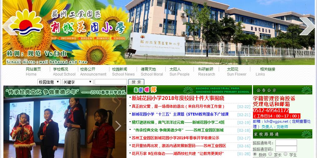 姑蘇東郊的金雞湖畔,矗立著醒目的大型雕塑——“圓融”,兩個(gè)靈動的圓自然相扣,標(biāo)志著傳統(tǒng)與現(xiàn)代、科技與人文的互融和共生。蘇州工業(yè)園區(qū)新城花園小學(xué)緊鄰“圓融”,是中新合作開發(fā)區(qū)內(nèi)第一所公辦小學(xué),是園區(qū)素質(zhì)教育的一張名片,它與古城區(qū)的學(xué)校具共性,但更顯個(gè)性,現(xiàn)代化、國際化、特色化教育的特征更明顯、更突出。她用自己的眼睛,一個(gè)是向外無限拓展自己的視野,一個(gè)是向內(nèi)不斷地去豐盈自己的心靈,思辨求索,和而不同!蘇州工業(yè)園區(qū)的入口屹立著一座標(biāo)志性雕塑,它的名字叫“窗口”,方方的一扇窗,被風(fēng)掀起的窗簾,讓人浮想聯(lián)翩:工業(yè)園區(qū)是改革開放的窗口,展示著獨(dú)特而和諧的魅力。新城花園小學(xué)作為園區(qū)素質(zhì)教育的窗口,不僅有現(xiàn)代化的教育教學(xué)設(shè)備,更有先進(jìn)的教育理念和高質(zhì)量的教育教學(xué)水平。學(xué)校走內(nèi)涵發(fā)展之路,從建校之初,就確立了“教師個(gè)體發(fā)展和學(xué)校整體發(fā)展雙贏”的培養(yǎng)理念,“教師專業(yè)發(fā)展共同體” 系列行動打造了一支德藝雙馨的教師隊(duì)伍,他們讓課堂綻放生活的魅力,讓課堂煥發(fā)生命的活力,全面激活課堂教學(xué)的“一池春水”,造就了“輕負(fù)擔(dān)高質(zhì)量”的教學(xué)特色,真正讓學(xué)生的學(xué)習(xí)生活幸福快樂。步入新城花園小學(xué),隨處可見紅、黃、藍(lán)三原色組成的“太陽花”,紅色象征熱情開朗,黃色象征溫文爾雅,藍(lán)色象征聰慧睿智。陽光、健康、靈動、美麗的“太陽家族”校園形象系列品牌深入人心。新城花園小學(xué)的學(xué)生具備與同齡人一樣的各種優(yōu)良品質(zhì),但性格更開朗、知識更豐富、做事更自信,大氣、膽氣、靈氣的“太陽娃”處處顯示出“地球村村民”的特質(zhì)。學(xué)?!拔奈洹碧厣珒墒植⒅兀骸皶阈@”造就了“太陽娃”的文化氣質(zhì),“輪滑特色”迸發(fā)出“太陽娃”的陽光活力。剛剛走過19年發(fā)展歷程的新城花園小學(xué),秉持開放的辦學(xué)理念,融合多元文化,在人本關(guān)懷中成長,在文化熏陶中跨越,成就了愛意濃濃的“心靈家園”、個(gè)性健康的“人性樂園”、人文凸顯的“文化圣園”。