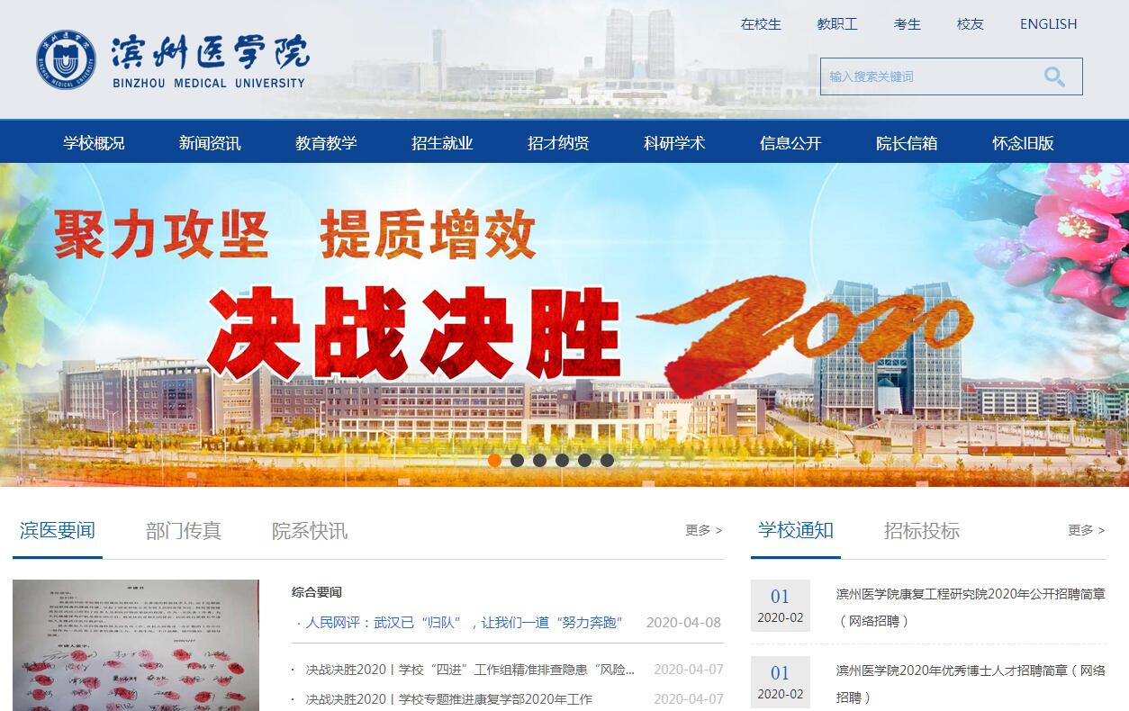 濱州醫(yī)學(xué)院是山東省應(yīng)用型人才培養(yǎng)特色名校,前身是始建于1946年的原國立山東大學(xué)醫(yī)學(xué)院,1956年3月獨立建制為青島醫(yī)學(xué)院,1970年10月整體搬遷至山東省惠民地區(qū)行署駐地北鎮(zhèn)辦學(xué),1974年11月設(shè)立青島醫(yī)學(xué)院北鎮(zhèn)分院,1981年9月改稱北鎮(zhèn)醫(yī)學(xué)院,1983年3月隨駐地更名為濱州醫(yī)學(xué)院,2002年煙臺校區(qū)投入使用。目前,學(xué)校已發(fā)展成為一所以醫(yī)學(xué)學(xué)科為優(yōu)勢,康復(fù)醫(yī)學(xué)、特殊教育為特色,醫(yī)、理、工、管、教等多學(xué)科門類滲透融合、協(xié)調(diào)發(fā)展的省屬本科醫(yī)學(xué)院校。學(xué)校有全日制在校生16100余人,其中本??粕?5300余人、碩士研究生600余人,面向29個省、自治區(qū)、直轄市招生;有留學(xué)生200余人?,F(xiàn)設(shè)有臨床醫(yī)學(xué)院、基礎(chǔ)醫(yī)學(xué)院、特殊教育學(xué)院、口腔醫(yī)學(xué)院、護(hù)理學(xué)院、人文與社會科學(xué)學(xué)院、馬克思主義學(xué)院、藥學(xué)院、中西醫(yī)結(jié)合學(xué)院、公共衛(wèi)生與管理學(xué)院、外國語與國際交流學(xué)院、葡萄酒學(xué)院、康復(fù)醫(yī)學(xué)院、老年醫(yī)學(xué)院、繼續(xù)教育學(xué)院等15個院(系)。學(xué)校始終以立德樹人為根本任務(wù)、以人才培養(yǎng)為中心、以提高質(zhì)量為核心,始終堅持“育人為本,德育為先”“教學(xué)第一,質(zhì)量至上”的辦學(xué)傳統(tǒng),秉承“仁心、妙術(shù)”的校訓(xùn)精神,弘揚“團(tuán)結(jié)、嚴(yán)謹(jǐn)、求實、創(chuàng)新”的校風(fēng),踐行“教書育人、為人師表、嚴(yán)謹(jǐn)治學(xué)、敬業(yè)奉獻(xiàn)”教風(fēng)和“崇尚科學(xué)、追求真理、勤奮學(xué)習(xí)、誠實守信”的學(xué)風(fēng),始終堅持“基礎(chǔ)理論知識與實踐創(chuàng)新能力、全面發(fā)展與個性發(fā)展、科學(xué)精神與人文精神”相統(tǒng)一的育人理念,獨立辦學(xué)40多年來,為社會培養(yǎng)了113000多名各類醫(yī)學(xué)及醫(yī)學(xué)相關(guān)人才,學(xué)生培養(yǎng)質(zhì)量得到了用人單位的充分肯定和社會各界的廣泛贊譽,打造了“作風(fēng)樸實、基礎(chǔ)扎實、工作踏實”的畢業(yè)生品牌,為區(qū)域和國家經(jīng)濟(jì)社會的發(fā)展特別是醫(yī)療衛(wèi)生事業(yè)的發(fā)展做出了積極貢獻(xiàn)。2006年,在教育部本科教學(xué)工作水平評估中獲得優(yōu)秀成績;2013年,在山東省高校中率先以“6年完全認(rèn)證”的優(yōu)異成績通過教育部臨床醫(yī)學(xué)專業(yè)認(rèn)證;2016年,通過教育部本科教學(xué)工作審核評估。學(xué)?,F(xiàn)為國家臨床、中醫(yī)執(zhí)業(yè)醫(yī)師資格分階段考試改革試點單位,教育部“本科教學(xué)工程”地方高校第一批本科專業(yè)綜合改革試點單位,卓越醫(yī)生教育培養(yǎng)計劃“5+3”臨床醫(yī)學(xué)教育綜合改革試點單位,卓越醫(yī)生中醫(yī)教育培養(yǎng)計劃改革試點高校;為國家級住院醫(yī)師規(guī)范化培訓(xùn)基地、萬名護(hù)理人才培訓(xùn)基地、臨床藥師培訓(xùn)基地、全科醫(yī)師培養(yǎng)基地。1985年,學(xué)校創(chuàng)辦了我國第一個專門招收殘疾青年的大學(xué)本科專業(yè)(醫(yī)學(xué)二系),開創(chuàng)了我國殘疾人高等醫(yī)學(xué)教育的先河,成為我國殘疾人教育發(fā)展史上的標(biāo)志性事件。2012年招收首批視障學(xué)生,填補了我國醫(yī)學(xué)院校和山東省開展本科層次視障生教育的空白。30多年來,探索形成了“殘健融合、教育與康復(fù)相結(jié)合”的殘疾人人才培養(yǎng)“濱州醫(yī)學(xué)院模式”,為社會培養(yǎng)了1105名殘疾人醫(yī)學(xué)人才,基本形成了“殘疾人人才培養(yǎng)和服務(wù)殘疾人事業(yè)專業(yè)人才培養(yǎng)”協(xié)調(diào)發(fā)展的格局,為促進(jìn)國家進(jìn)步文明事業(yè)作出了積極貢獻(xiàn)。學(xué)?,F(xiàn)為國家殘疾人高等教育基地、中國盲人醫(yī)療按摩規(guī)范化實訓(xùn)基地和山東省殘疾人大學(xué)生就業(yè)指導(dǎo)服務(wù)中心。學(xué)科專業(yè) 設(shè)有臨床醫(yī)學(xué)、口腔醫(yī)學(xué)、護(hù)理學(xué)、中醫(yī)學(xué)、醫(yī)學(xué)影像學(xué)、麻醉學(xué)、預(yù)防醫(yī)學(xué)、生物技術(shù)、藥學(xué)、應(yīng)用心理學(xué)、醫(yī)學(xué)檢驗、眼視光學(xué)、康復(fù)治療學(xué)、特殊教育、聽力與言語康復(fù)學(xué)、生物制藥、制藥工程、假肢矯形工程、中藥學(xué)等30個本科專業(yè)。是山東省博士學(xué)位授予立項建設(shè)單位,擁有碩士學(xué)位授權(quán)一級學(xué)科6個、二級學(xué)科39個,碩士專業(yè)學(xué)位授權(quán)點5個。有國家特色專業(yè)4個,山東省高水平應(yīng)用型立項建設(shè)專業(yè)群4個、省級特色專業(yè)8個;省部級重點學(xué)科8個,其中臨床醫(yī)學(xué)學(xué)科進(jìn)入ESI全球排名前1%,護(hù)理學(xué)、基礎(chǔ)醫(yī)學(xué)進(jìn)入“軟科中國最好學(xué)科排名”前50%。有國家中醫(yī)藥管理局重點研究室1個,省級重點實驗室5個、省級人文社科基地1個、省級高校協(xié)同創(chuàng)新中心2個、省級醫(yī)藥衛(wèi)生重點實驗室9個,直屬附屬醫(yī)院有省級