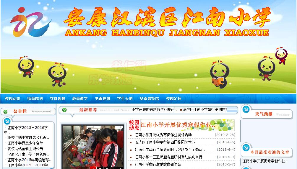 安康市漢濱區(qū)江南小學(xué)位于城區(qū)以南中心繁華區(qū)域,是一所具有現(xiàn)代辦學(xué)水平的全日制完全小學(xué)。學(xué)校占地面積4120㎡,建筑面積2571㎡?,F(xiàn)有教學(xué)班18個(gè),在校學(xué)生1216人。擁有一支素質(zhì)精良,學(xué)科齊全的師資隊(duì)伍,在崗教師69人,其中本科學(xué)歷22人,專科學(xué)歷40人,崗位合格率100%。獲中、省級(jí)各類獎(jiǎng)勵(lì)20余人次;省級(jí)骨干教師6人;市級(jí)教學(xué)能手、學(xué)科帶頭人、骨干教師25人;區(qū)級(jí)教學(xué)能手、優(yōu)秀教師、教學(xué)標(biāo)兵、學(xué)科帶頭人31人。創(chuàng)設(shè)良好的教學(xué)環(huán)境,讓每一個(gè)學(xué)生都能接受優(yōu)質(zhì)教育是全體教師不懈的追求。在各級(jí)領(lǐng)導(dǎo)的重視支持下,我校新建了968㎡的生活及綜合教學(xué)用房,裝備了多媒體教室、電子備課室,建立了閉路雙控網(wǎng)絡(luò)系統(tǒng)、接通了寬帶網(wǎng),開通了學(xué)校網(wǎng)站,充實(shí)了儀器實(shí)驗(yàn)室、微機(jī)室 、圖書、閱覽室、體音美活動(dòng)室、少先隊(duì)大隊(duì)部等。校園綠化600余㎡,三季有花,四季常青;文化長(zhǎng)廊、大小型繪畫;學(xué)生的“禮儀”教育、課間“古詩(shī)誦唱”等,處處彰顯著“小而精、置而當(dāng)、文而雅”的特色。辦學(xué)理念是學(xué)校發(fā)展的關(guān)鍵。我校堅(jiān)持“以人為本、發(fā)展教師、成就學(xué)生、服務(wù)社會(huì)”的辦學(xué)理念;以“構(gòu)建和諧校園、奠基幸福人生”為辦學(xué)目標(biāo);以“勤學(xué)習(xí)、做真人、善實(shí)踐、求創(chuàng)新”為校訓(xùn)。強(qiáng)化教師的職業(yè)道德教育,讓學(xué)生健康成長(zhǎng),讓教師專業(yè)水平不斷提高,促進(jìn)了學(xué)校和諧發(fā)展、可持續(xù)發(fā)展。學(xué)校先后榮獲“全國(guó)讀書育人特色學(xué)校”、“全國(guó)助殘先進(jìn)集體”、“蒲公英行動(dòng)教育部重點(diǎn)課題實(shí)驗(yàn)學(xué)?!?;陜西省“文明校園”、“素質(zhì)教育優(yōu)秀學(xué)?!薄ⅰ凹t領(lǐng)巾示范學(xué)?!薄ⅰ吧賰嚎苹美L畫先進(jìn)單位”;安康市“示范學(xué)?!薄捌桨残@”;漢濱區(qū)“綠色文明示范學(xué)?!薄ⅰ翱破帐痉秾W(xué)?!?、“小學(xué)教育先進(jìn)單位”“校本教研示范學(xué)?!薄叭思t旗集體”“基礎(chǔ)教育課改先進(jìn)學(xué)?!钡葮s譽(yù)稱號(hào)。