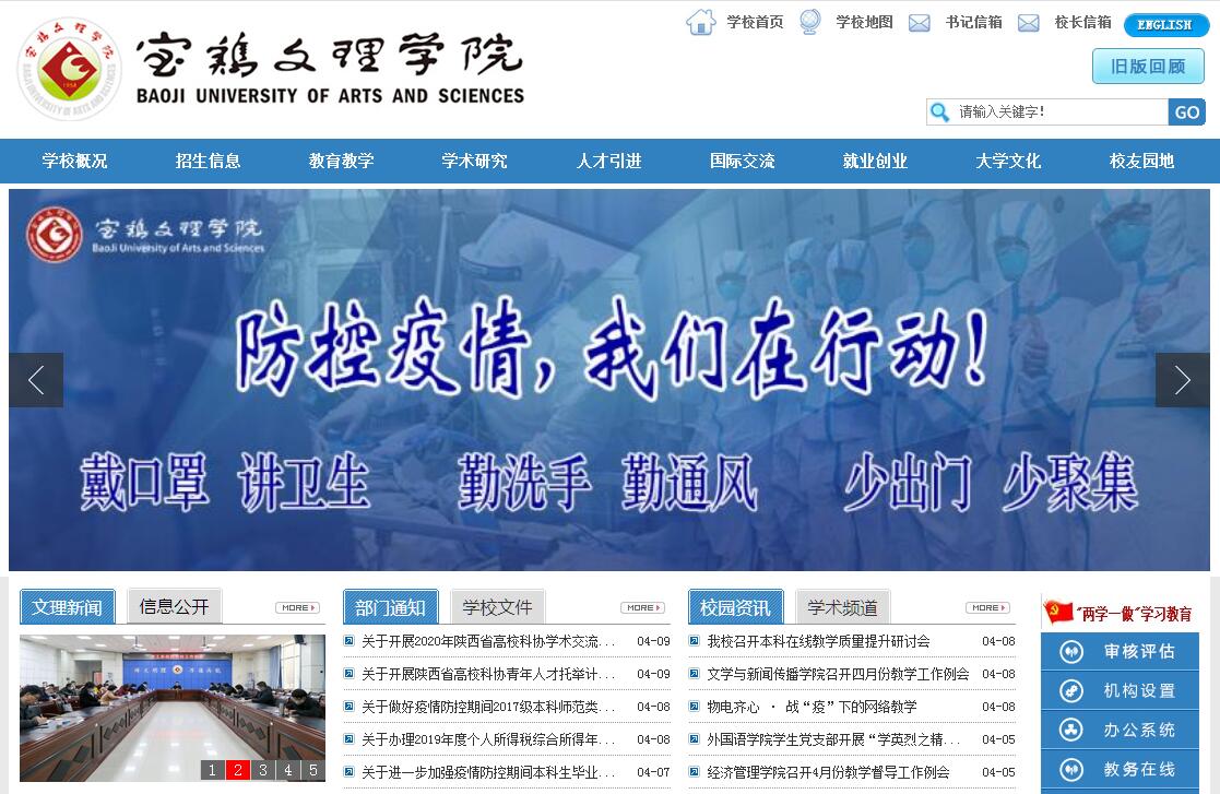寶雞文理學院(www.bjwlxy.cn或者www.bjwlxy.edu.cn)是一所省屬普通本科高等學校,前身為1958年創(chuàng)辦的寶雞大學(本科),1963年因國家經濟困難停辦,1975年恢復為陜西師范大學寶雞分校(本科),1978年經國務院批準定名為寶雞師范學院,1992年經原國家教委批準,與1984年新設立的寶雞大學合并,更名為寶雞文理學院。在近60年的奮斗歷程中,一代又一代寶雞文理人篳路藍縷、櫛風沐雨、奮勇開拓,文理精神薪火相傳,教澤留芳,學校事業(yè)康莊發(fā)展、闊步向前。2008年學校榮獲教育部“普通高等學校本科教學工作水平評估優(yōu)秀學?!狈Q號;2013年學校獲批為國務院學位委員會“碩士學位授予單位”;2017年學校被陜西省列入新增博士學位授予單位立項建設計劃;2017年10月陜西省教育廳、寶雞市人民政府簽署了共同推進學校建成寶雞大學協(xié)議書,使學校站在了新的發(fā)展起點上。學校堅持以教師教育和應用型工科為主要特色的多科性大學的辦學類型定位,堅持以本科教育為主,積極發(fā)展研究生教育的辦學層次定位,堅持立足寶雞、面向陜西、輻射西部及全國的服務面向定位。學?,F有新老兩個校區(qū),占地面積1100多畝;擁有固定資產7.9億多元;圖書館各類圖書累積量307余萬冊。擁有全日制在校生19137名,其中本科生18793名,碩士生330名,留學生14名;教職工1392名,其中高級職稱人員502名,博士312名。同時,聘請了120多位國內外著名的專家學者為我校兼職教授或特聘教授。有50多位教師分別獲得國務院有突出貢獻專家、全國優(yōu)秀教師、陜西省有突出貢獻專家、陜西省教學名師、陜西省優(yōu)秀教師等?。ú浚┘壱陨溪剟罘Q號。學校設有17個二級學院,66個本科專業(yè)?,F有1個國家級特色專業(yè),9個省級一流專業(yè)、3個省級名牌專業(yè),5個省級特色專業(yè),4個省級綜合改革試點專業(yè),5個省級實驗教學示范中心,2個省級虛擬仿真實驗教學中心,7個省級高校人才培養(yǎng)模式創(chuàng)新實驗區(qū)。學校現有中國語言文學、化學、地理學、數學、哲學、物理學、教育學7個一級學科學術型碩士授權點和教育碩士、機械工程、光學工程、旅游管理、藝術碩士(美術領域)5個專業(yè)碩士學位授權點;有1個省級一流學科、6個省級重點學科、2個省級重點實驗室、3個省級哲學社會科學重點研究基地?!笆濉币詠?,學校獲得國家級科研項目60項,省部級科研獎勵37項,尤其是近三年來,辦學水平和實力顯著提升,科研項目、科研經費、科研獲獎和高層次科研成果數量呈翻番增長趨勢。在長期的辦學歷程中,學校憑借寶雞厚重的歷史文化積淀,挖掘區(qū)域文化優(yōu)勢,汲取周秦文化精華,推進優(yōu)秀傳統(tǒng)文化與現代教育的有機結合,形成了“博文明理,厚德尚能”的校訓和把周秦優(yōu)秀傳統(tǒng)文化貫穿于育人全過程的鮮明特色。學校秉承歷史傳統(tǒng)和服務地方經濟社會發(fā)展的現實需要,始終強化教師教育和應用型工科兩個基本辦學特色,有力地促進了寶雞市、陜西省以及西部地區(qū)的基礎教育和經濟社會發(fā)展,已為社會培養(yǎng)了12萬多名的高素質應用型人才。學校面向全國31個省、市、自治區(qū)招生,擁有招收外國留學生的資格。近10年來畢業(yè)生一次性就業(yè)率連續(xù)保持在90%以上。學校先后榮獲“創(chuàng)佳評差”最佳單位、“文明校園”、“平安校園”等榮譽稱號?!笆濉睍r期,學校將緊抓國家“雙一流”和全省“四個一流”建設的重大機遇,圍繞“一帶一路”和創(chuàng)新驅動發(fā)展戰(zhàn)略,深化綜合改革,加快內涵發(fā)展,奮力追趕超越,實現更名寶雞大學,逐步推動學校由教學型院校向教學研究型大學發(fā)展轉型,躋身陜西省高水平大學行列;通過10—15年努力,獲批博士學位授予單位,建成教學研究型的高水平寶雞大學。