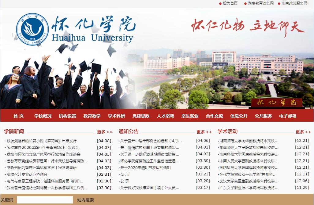 懷化學(xué)院創(chuàng)辦于1958年,前身為懷化師范高等??茖W(xué)校,2002年經(jīng)國家教育部批準(zhǔn)升格為全日制普通本科院校。2000年以來,學(xué)校先后被評為“湖南省文明單位”、“湖南省文明高?!?、“全國精神文明建設(shè)工作先進(jìn)單位”、“國家節(jié)約型公共機(jī)構(gòu)示范單位”。學(xué)校坐落于古有“滇黔門戶、全楚咽喉”之稱,現(xiàn)有滬昆高鐵,湘黔、枝柳、渝懷鐵路,及209、320國道、滬昆、包茂高速交匯的交通樞紐城市——懷化市。學(xué)校占地1100余畝,建筑面積42萬平方米,分東、西兩個校區(qū)辦學(xué)。學(xué)校擁有館藏圖書139萬冊,電子圖書55萬冊,中文期刊1712種;教學(xué)科研儀器設(shè)備總值達(dá)1.7億元。有教職工1171人,其中教授84人、副教授243人,具有博碩士學(xué)位的教師分別為132人、569人;有省級教學(xué)名師1人,省級學(xué)科帶頭人7人;15人獲得過曾憲梓教育基金獎,6人享受政府特殊津貼,8人分別獲得“全國五一勞動獎?wù)隆?、“全國?yōu)秀教師”、“全國教育系統(tǒng)勞動模范”稱號。學(xué)校面向全國25個省、市、自治區(qū)招生,有全日制在校學(xué)生16241人,成人學(xué)歷教育學(xué)生近4000人。學(xué)?,F(xiàn)有21個學(xué)院(部、中心),設(shè)投資學(xué)、國際經(jīng)濟(jì)與貿(mào)易、法學(xué)、社會工作、思想政治教育、科學(xué)教育、人文教育、學(xué)前教育、小學(xué)教育、體育教育、社會體育指導(dǎo)與管理、漢語言文學(xué)、英語、商貿(mào)英語、廣播電視學(xué)、網(wǎng)絡(luò)與新媒體、數(shù)學(xué)與應(yīng)用數(shù)學(xué)、信息與計算科學(xué)、物理學(xué)、化學(xué)、生物科學(xué)、工業(yè)設(shè)計、材料科學(xué)與工程、材料化學(xué)、通信工程、光電信息科學(xué)與工程、廣播電視工程、電子信息科學(xué)與技術(shù)、計算機(jī)科學(xué)與技術(shù)、軟件工程、網(wǎng)絡(luò)工程、制藥工程、食品科學(xué)與工程、食品質(zhì)量與安全、風(fēng)景園林、生物工程、電氣工程及自動化、生物制藥、機(jī)械設(shè)計制造及其自動化、園林、財務(wù)管理、公共事業(yè)管理、物流管理、旅游管理、酒店管理、土地資源管理、音樂表演、音樂學(xué)、舞蹈學(xué)、美術(shù)學(xué)、視覺傳達(dá)設(shè)計、環(huán)境設(shè)計、產(chǎn)品設(shè)計、服裝與服飾設(shè)計、數(shù)字媒體藝術(shù)等55個本科專業(yè),專業(yè)覆蓋經(jīng)、法、教、文、理、工、農(nóng)、管、藝等九大學(xué)科門類。擁有教育部特色專業(yè)1個,教育部專業(yè)綜合改革試點專業(yè)1個;省級特色專業(yè)7個,省級專業(yè)綜合改革試點專業(yè)4個,省級教學(xué)團(tuán)隊3個;教育部大學(xué)生校外實踐教育基地1個,省級實踐教學(xué)示范中心3個、省級大學(xué)生創(chuàng)新訓(xùn)練基地2個、省級校企合作人才培養(yǎng)示范基地4個、省優(yōu)秀實習(xí)教學(xué)基地8個;省級基礎(chǔ)課教學(xué)示范實驗室1個,中央與地方共建基礎(chǔ)實驗室9個、特色優(yōu)勢學(xué)科實驗室14個,省級虛擬仿真實驗教學(xué)中心1個;省級精品課程7門。學(xué)校已同美國、加拿大、西班牙、烏克蘭等國的高校建立了教學(xué)、科研及人才培養(yǎng)等方面的友好合作關(guān)系,并實現(xiàn)教師、留學(xué)生互派,形成了開放辦學(xué)格局。學(xué)校擁有中國現(xiàn)當(dāng)代文學(xué)、植物學(xué)省級重點建設(shè)學(xué)科2個。建有省、校級科研機(jī)構(gòu)(平臺)38個,含民族藥用植物資源研究與利用、武陵山片區(qū)生態(tài)農(nóng)業(yè)智能控制技術(shù)湖南省重點實驗室2個,聚乙烯醇纖維新材料與制品湖南省工程實驗室,湖南省民間非物質(zhì)文化研究基地、湖南省和平文化研究基地等2個省級哲學(xué)和社會科學(xué)研究基地,湘西藥用植物與民族植物學(xué)湖南省教育廳重點實驗室,民族民間文化藝術(shù)研究中心湖南省高校哲學(xué)社會科學(xué)重點研究基地,以及農(nóng)村學(xué)前教育研究基地、湖南文化遺產(chǎn)翻譯與傳播等4個省文化廳、省民委研究基地(中心)。近五年來,教師發(fā)表的論文被《SCI》、《EI》、《ISTP》收錄296篇,獲授權(quán)專利321項,出版學(xué)術(shù)專著和教材107部;主持省部級以上科研項目222項,其中國家自科基金項目16項,國家社科基金項目9項。近年來獲國家級教學(xué)成果獎、省部級教學(xué)成果獎13項;獲國家自然科學(xué)獎、教育部科技進(jìn)步獎、湖南省自然科學(xué)獎及科技進(jìn)步獎9項,湖南省社會科學(xué)成果獎4項。學(xué)校已為國家培養(yǎng)各類畢業(yè)生11萬人,其中一大批成為各級黨政機(jī)關(guān)領(lǐng)導(dǎo)干部或國內(nèi)外知名學(xué)府和科研單位的教學(xué)、科研骨干。中國科學(xué)院院士席南華、長江學(xué)者、國家“千人計劃”專家賈宗超、著名作家王躍文、青年歌唱家陳思思、“全國十大杰出青年法學(xué)家”蔣悟真等優(yōu)秀人才是其中的代表。面向未來,懷化學(xué)院將秉承“懷仁化物、立地仰天”的辦學(xué)理念及“厚德博學(xué)、唯實求新”的校訓(xùn),朝著建設(shè)區(qū)域性高水平應(yīng)用型大學(xué)的奮斗目標(biāo)穩(wěn)步邁進(jìn)。