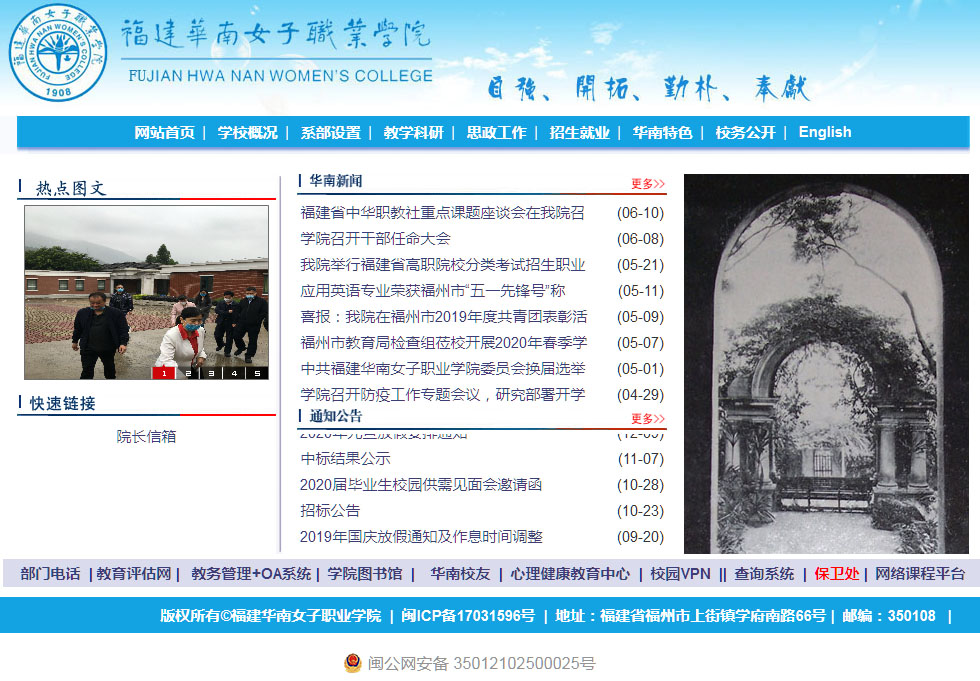 福建華南女子職業(yè)學(xué)院前身是創(chuàng)建于1908年的私立華南女子文理學(xué)院,1984年經(jīng)教育部批準(zhǔn)復(fù)辦。是全日制民辦普通高職院校。學(xué)制三年。學(xué)院分為旗山校區(qū)和煙臺(tái)山校區(qū)兩個(gè)部分,占地230畝,建筑總面積8.1萬(wàn)平方米?,F(xiàn)有在校生4000人,教職員工217人,其中專(zhuān)任教師187人,高級(jí)職稱(chēng)人數(shù)37人。學(xué)院有文化教育、健康服務(wù)、藝術(shù)設(shè)計(jì)、旅游服務(wù)及國(guó)際商務(wù)管理等5個(gè)系,下設(shè)學(xué)前教育、應(yīng)用英語(yǔ)(少兒英語(yǔ)方向)、食品營(yíng)養(yǎng)與檢測(cè)、食品營(yíng)養(yǎng)與衛(wèi)生、家政服務(wù)與管理、老年服務(wù)與管理、服裝與服飾設(shè)計(jì)、鞋類(lèi)設(shè)計(jì)與工藝、建筑室內(nèi)設(shè)計(jì)、工程造價(jià)、數(shù)字媒體藝術(shù)設(shè)計(jì)、藝術(shù)設(shè)計(jì)、人物形象設(shè)計(jì)、旅游管理、酒店管理、會(huì)展策劃與管理、空中乘務(wù)、國(guó)際經(jīng)濟(jì)與貿(mào)易、商務(wù)英語(yǔ)(跨境電商方向)、商務(wù)經(jīng)紀(jì)與代理、會(huì)計(jì)、公共事務(wù)管理(文秘與公關(guān)方向)、移動(dòng)商務(wù)等23個(gè)專(zhuān)業(yè)。學(xué)院始終堅(jiān)持不以營(yíng)利為目的,重視保持自身的辦學(xué)特色與教學(xué)教育質(zhì)量。 本著“培養(yǎng)一個(gè)好女子,造就一個(gè)小家庭,和諧一個(gè)大社會(huì)”的辦學(xué)理念,學(xué)院傳承“受當(dāng)施”精神,圍繞婦女、兒童、老年人群體優(yōu)先設(shè)置與現(xiàn)代服務(wù)業(yè)相關(guān)的應(yīng)用型專(zhuān)業(yè),與福建產(chǎn)業(yè)結(jié)構(gòu)調(diào)整轉(zhuǎn)型升級(jí)相適應(yīng),培養(yǎng)生產(chǎn)、建設(shè)、管理、服務(wù)一線的高素質(zhì)的行業(yè)、區(qū)域性技術(shù)技能型人才。2008年11月,學(xué)院以良好的成績(jī)通過(guò)了教育部高職高專(zhuān)人才培養(yǎng)工作水平評(píng)估。2011年初,學(xué)院被確定為教育部非營(yíng)利民辦高校辦學(xué)制度改革試點(diǎn)項(xiàng)目單位。2013年,學(xué)院完成事業(yè)單位法人登記。2015年,學(xué)院通過(guò)了第二輪高職高專(zhuān)人才培養(yǎng)工作評(píng)估。2016年,學(xué)院被評(píng)為首批“福建省家庭服務(wù)職業(yè)培訓(xùn)示范基地”。學(xué)院現(xiàn)有省級(jí)精品專(zhuān)業(yè)2個(gè),省級(jí)示范專(zhuān)業(yè)2個(gè),省級(jí)財(cái)政支持的實(shí)訓(xùn)基地1個(gè),省級(jí)精品課程3門(mén),省級(jí)教學(xué)名師1人,省級(jí)教學(xué)成果2項(xiàng)。學(xué)院曾獲得 “中國(guó)民辦教育創(chuàng)新與發(fā)展貢獻(xiàn)獎(jiǎng)”、“全國(guó)先進(jìn)民間組織”、“全國(guó)五四紅旗團(tuán)支部”、第十一屆、第十二屆 “福建省文明學(xué)?!?、福建省先進(jìn)基層黨組織等榮譽(yù)稱(chēng)號(hào)。學(xué)院理事長(zhǎng)陳鐘英、校教學(xué)督導(dǎo)馬秀發(fā)被評(píng)為“福建省杰出人民教師”。學(xué)院外籍教師Betts獲得“國(guó)家友誼獎(jiǎng)”、5位外籍教師獲得“福建省友誼獎(jiǎng)”。