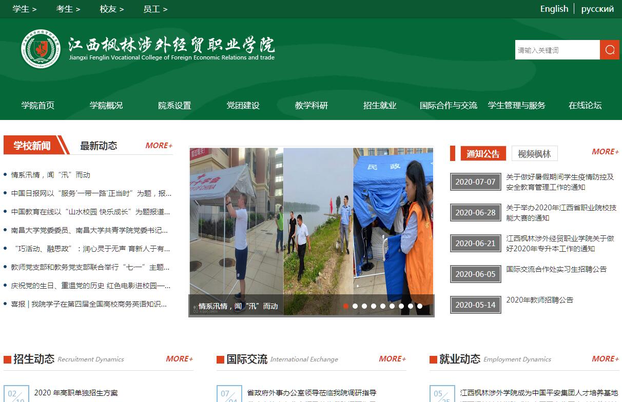 江西楓林涉外經(jīng)貿(mào)職業(yè)學(xué)院成立于2003年,是經(jīng)江西省人民政府批準(zhǔn)、國(guó)家教育部備案、以培養(yǎng)涉外型人才為特色的全日制普通高等??圃盒?。學(xué)院位于江西省贛江新區(qū)永修組團(tuán)境內(nèi),距離南昌市中心城區(qū)40分鐘車程。校內(nèi)各項(xiàng)學(xué)習(xí)、生活設(shè)施齊全,教學(xué)行政用房達(dá)7.6萬(wàn)余平方米。學(xué)院以服務(wù)一帶一路企業(yè)為宗旨,以引進(jìn)國(guó)際優(yōu)質(zhì)教育資源為辦學(xué)目標(biāo),突出涉外辦學(xué)特色,先后與加拿大、美國(guó)、俄羅斯、泰國(guó)、馬來(lái)西亞、韓國(guó)、格魯吉亞、烏克蘭、哈薩克斯坦、保加利亞等10個(gè)國(guó)家的20所高校建立了教育交流關(guān)系。學(xué)院秉承古代書院的教育模式,推崇修身養(yǎng)性的教育理念,踐行遠(yuǎn)離塵囂,褪去浮華,潛心修學(xué),成就自我的校訓(xùn),全面提倡博雅教育,著力培養(yǎng)學(xué)生批判性思維,努力實(shí)現(xiàn)強(qiáng)其骨,明其心,實(shí)其能之實(shí)用人才培養(yǎng)目標(biāo)。辦學(xué)以來(lái),學(xué)院積極探索和推行產(chǎn)教融合、工學(xué)交替的教學(xué)模式,有效地提升了學(xué)生的技能與個(gè)人能力。通過(guò)多年的發(fā)展建設(shè),學(xué)院已逐漸形成了以企業(yè)高級(jí)技師、海歸學(xué)者為主的中外教師隊(duì)伍,現(xiàn)有專任教師115人,兼職教師60人。專任教師中具有高級(jí)職稱教師23人,中級(jí)職稱教師39人,具有博士、碩士學(xué)位教師42人。新時(shí)代,新征程,新作為。發(fā)展中的江西楓林涉外經(jīng)貿(mào)職業(yè)學(xué)院,將不忘初心、牢記使命,全面貫徹落實(shí)黨的教育方針,堅(jiān)定社會(huì)主義辦學(xué)方向,堅(jiān)持立德樹人根本任務(wù),努力為區(qū)域經(jīng)濟(jì)發(fā)展做出新的更大貢獻(xiàn)。