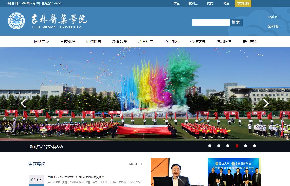 吉林醫(yī)藥學(xué)院始建于1952年,前身為中國人民解放軍第四軍醫(yī)大學(xué)吉林軍醫(yī)學(xué)院,共為軍隊和地方培養(yǎng)了3萬余名醫(yī)務(wù)人才,被譽為“白衣戰(zhàn)士的搖籃”。2004年8月,學(xué)校由軍隊整體移交吉林省,成為省屬公辦高等學(xué)校,是吉林省惟一獨立設(shè)置的西醫(yī)本科院校。2013年通過教育部本科教學(xué)工作合格評估。學(xué)校是國家綠化模范單位、吉林省園林式單位。校區(qū)位于吉林市吉林大街5號,校本部占地面積52.73萬平方米,建筑面積27.42萬平方米,固定資產(chǎn)10.32億元,教學(xué)、科研儀器設(shè)備總值2.01億元。館藏紙質(zhì)圖書88.66萬冊,中外文數(shù)據(jù)庫25個;文體活動中心建筑面積0.50萬平方米;室內(nèi)外體育運動場所占地面積5.52萬平方米;校園主干網(wǎng)為千兆帶寬。學(xué)?,F(xiàn)有16個黨政機關(guān)、3個群團組織、13個教學(xué)單位、5個教輔單位;2所附屬醫(yī)院(第一臨床醫(yī)學(xué)院附屬四六五醫(yī)院、第二臨床醫(yī)學(xué)院附屬梅河口市中心醫(yī)院)和3所非直屬附屬醫(yī)院(附屬吉林省吉林中西醫(yī)結(jié)合醫(yī)院、附屬吉林市人民醫(yī)院、附屬吉林油田總醫(yī)院),均為三級甲等醫(yī)院;各類實踐教學(xué)基地134家。校本部現(xiàn)有專任教師414人(含聘用制),其中碩士及以上學(xué)位教師342人,高級職稱203人。新世紀(jì)百千萬人才工程國家級人選1人,全國優(yōu)秀科技工作者1人,享受國務(wù)院政府特殊津貼專家1人,教育部新世紀(jì)優(yōu)秀人才支持計劃人選1人,長白山學(xué)者特聘教授1人,省拔尖創(chuàng)新人才6人(第一層次人選1人),省突出貢獻(xiàn)中青年專業(yè)技術(shù)人才3人,省青年科技獎1人,省高校首批學(xué)科領(lǐng)軍型教授1人,省教學(xué)名師5人,省教學(xué)新秀1人,省優(yōu)秀教師2人。學(xué)?,F(xiàn)開設(shè)19個本科專業(yè),6個??茖I(yè),分布于醫(yī)、理、工、管4個學(xué)科門類?,F(xiàn)有國家級特色專業(yè)1個,省級特色專業(yè)4個,省級品牌專業(yè)建設(shè)點2個,省級人才培養(yǎng)模式創(chuàng)新實驗區(qū)3個,省級優(yōu)秀教學(xué)團隊9個,省級實驗教學(xué)示范中心4個(建設(shè)單位2個),國家精品資源共享課1門,國家級精品課程1門,省級精品課程16門;獲吉林省教學(xué)成果獎一等獎1項。省高?!笆濉眱?yōu)勢特色重點立項建設(shè)二級學(xué)科2個,重點立項培育一級學(xué)科1個?,F(xiàn)有科研實驗平臺24個,其中省科技廳科技創(chuàng)新中心1個(抗體工程協(xié)同創(chuàng)新研發(fā)中心)、“院士工作站”1個、省科技廳攻關(guān)平臺1個,省教育廳重點實驗室3個、省教育人文社科重點研究基地1個、吉林特色新型高校智庫1個,省衛(wèi)生廳重點實驗室2個,省工信廳實驗中心1個,省中醫(yī)藥管理局實驗平臺10個,吉林市產(chǎn)業(yè)技術(shù)研究院3個。學(xué)校現(xiàn)有全日制在校生9264人(含留學(xué)生119人)。學(xué)校服務(wù)面向基層衛(wèi)生單位,努力契合地方經(jīng)濟社會發(fā)展需求,培養(yǎng)了大批醫(yī)療服務(wù)、藥品生產(chǎn)、銷售和衛(wèi)生管理的一線應(yīng)用型人才。近三年,畢業(yè)生初次就業(yè)率保持在82%以上?,F(xiàn)與吉林大學(xué)、第四軍醫(yī)大學(xué)、延邊大學(xué)、吉林師范大學(xué)聯(lián)合培養(yǎng)研究生,其中與延邊大學(xué)聯(lián)合培養(yǎng)碩士研究工作取得實質(zhì)性進展,2015年,學(xué)校成為省屬首批聯(lián)合培養(yǎng)碩士研究生工作試點單位,目前3個學(xué)科專業(yè)招收20名碩士研究生,現(xiàn)有博士研究生導(dǎo)師2人,碩士研究生導(dǎo)師42人。學(xué)?,F(xiàn)有客座教授29人,外籍教師3人。先后與美國、英國、澳大利亞、韓國、印度等10多個國家的高校、醫(yī)院建立了合作關(guān)系。同香港Maryknoll醫(yī)院合作開展1+5境外育才項目,與韓國大邱保健大學(xué)、加圖立大學(xué)簽訂合作協(xié)議。2014年學(xué)校啟動了留學(xué)生招生培養(yǎng)工作,現(xiàn)有留學(xué)生119人,來自5個國家。每年選派優(yōu)秀教師出國交流學(xué)習(xí),2014年以來,共34人相繼赴英國、澳大利亞、美國和加拿大等地學(xué)習(xí)。學(xué)??蒲谢A(chǔ)扎實。2011年以來,立項國家重大科技專項1項、國家自然科學(xué)基金項目19項、吉林省重大和重點科技項目36項;獲省科技成果獎15項(其中自然科學(xué)獎二等獎2項,科學(xué)技術(shù)進步獎二等獎1項),發(fā)明專利14項。堅持科研促教學(xué),重視培養(yǎng)學(xué)生創(chuàng)新精神,獲批國家級創(chuàng)新創(chuàng)業(yè)項目60項,省級創(chuàng)新創(chuàng)業(yè)項目140項。學(xué)校是全國科普教育基地、首批中醫(yī)類別實踐技能考試11個國家基地之一、國家執(zhí)業(yè)醫(yī)師考試吉林省基地、省農(nóng)村訂單定向免費醫(yī)學(xué)生培養(yǎng)單位、省村級醫(yī)療衛(wèi)生技術(shù)人才培訓(xùn)基地、吉林市衛(wèi)生技術(shù)人才培訓(xùn)基地。臨床技能中心是國家執(zhí)業(yè)醫(yī)師考試吉林地區(qū)考點、社區(qū)醫(yī)生培訓(xùn)基地。學(xué)校是中國微量元素科學(xué)研究會理事長單位,省解剖學(xué)會、省微量元素科學(xué)研究會理事長單位、省心理學(xué)會副理事長單位,省科學(xué)社會主義學(xué)會會長單位。學(xué