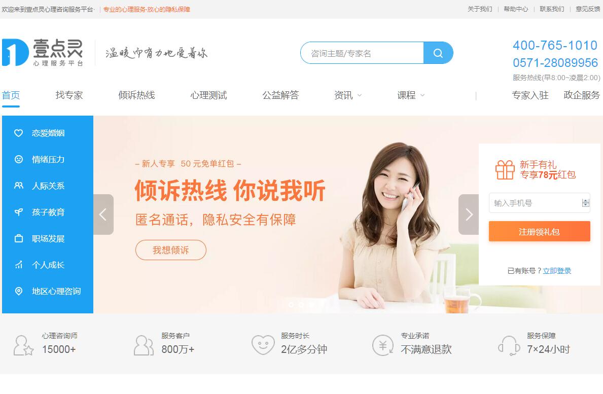 | 網(wǎng)站簡介: 壹點(diǎn)靈心理咨詢平臺匯聚全國知名千位咨詢師醫(yī)生,覆蓋上海,北京,深圳,杭州,武漢,臺州等城市,24小時提供免費(fèi)在線心理咨詢服務(wù)和心理測試,幫助需要心理咨詢的客戶梳理親子教育、婚姻戀愛、職場人際方面的困擾以及解決失眠、抑郁癥、焦慮癥、婚姻、挽回愛情等問題,專業(yè)情感咨詢和婚姻咨詢服務(wù),找心理醫(yī)生,上壹點(diǎn)靈。 |