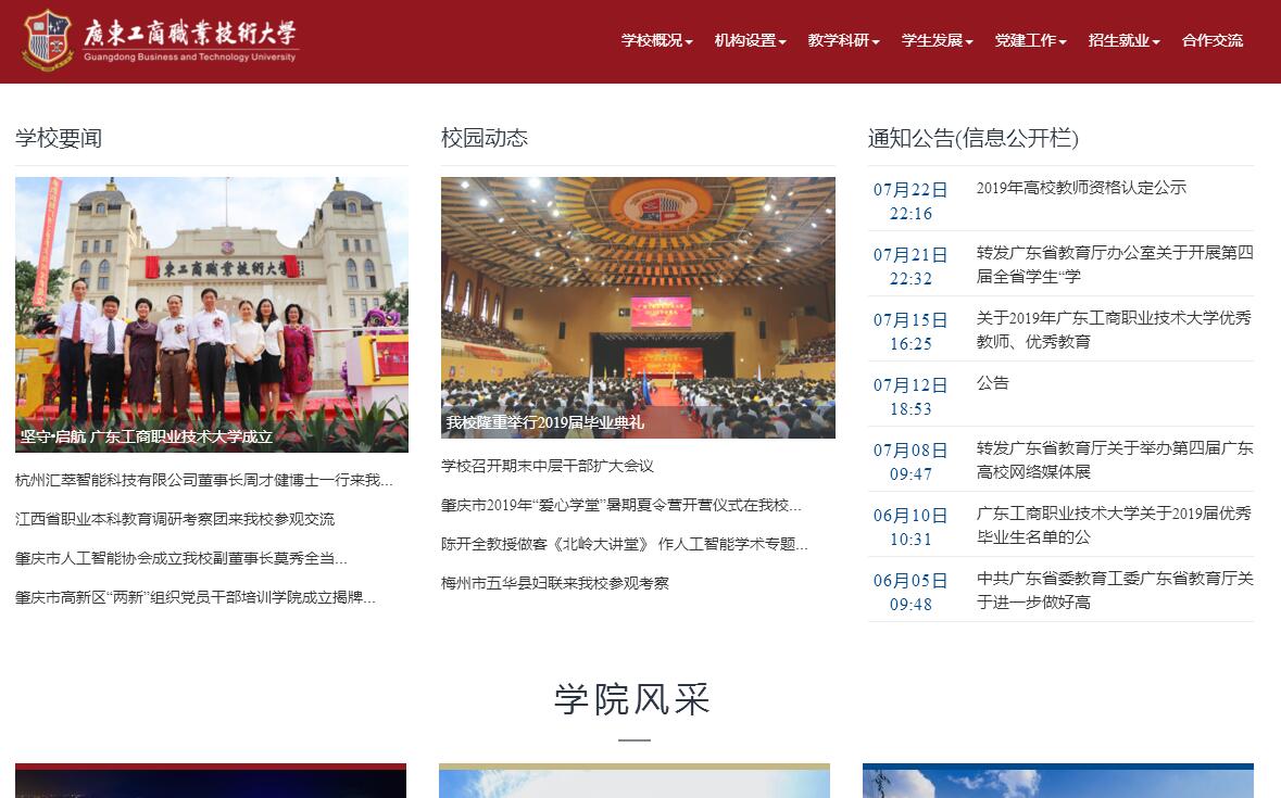 廣東工商職業(yè)技術(shù)大學(xué)的辦學(xué)前身是創(chuàng)辦于1996年的東方人才學(xué)校,1997年學(xué)校更名為肇慶市工商職業(yè)學(xué)校。2004年3月經(jīng)廣東省人民政府批準(zhǔn)成立、國(guó)家教育部備案,學(xué)校升格為肇慶工商職業(yè)技術(shù)學(xué)院,2014年更名為廣東工商職業(yè)學(xué)院。2018年獲批升格為本科院校。2019年5月教育部正式批準(zhǔn)命名為廣東工商職業(yè)技術(shù)大學(xué),是國(guó)內(nèi)首批本科層次職業(yè)教育試點(diǎn)學(xué)校。學(xué)?,F(xiàn)有星湖和大旺兩個(gè)校區(qū),分別坐落在七星巖國(guó)家級(jí)重點(diǎn)風(fēng)景名勝區(qū)和肇慶國(guó)家級(jí)高新技術(shù)產(chǎn)業(yè)開發(fā)區(qū)。學(xué)校占地面積1283畝,總建筑面積44.32萬平方米。校園環(huán)境優(yōu)雅,景色秀麗,氣候宜人,交通便捷。辦學(xué)23年來,學(xué)校已成為工、管雙輪驅(qū)動(dòng),工、管、經(jīng)、文、藝多學(xué)科協(xié)調(diào)發(fā)展的普通高等院?!,F(xiàn)設(shè)有智能制造學(xué)院、體育與健康學(xué)院、建筑工程系、計(jì)算機(jī)應(yīng)用技術(shù)系、經(jīng)濟(jì)管理系、工商管理系、財(cái)會(huì)系、應(yīng)用外語系、藝術(shù)設(shè)計(jì)系、文化傳播系、公共教學(xué)部和思政教學(xué)部等2院8系2部,開設(shè)48個(gè)專業(yè)(方向)。建有智能制造、電子信息、建筑、財(cái)經(jīng)商貿(mào)、藝術(shù)創(chuàng)意等五大實(shí)驗(yàn)實(shí)訓(xùn)中心,各類實(shí)驗(yàn)實(shí)訓(xùn)室157個(gè),教學(xué)科研儀器設(shè)備總值1.15億元。圖書總數(shù)為116萬冊(cè),中外文期刊1100多種?,F(xiàn)有省級(jí)重點(diǎn)專業(yè)1個(gè),省級(jí)財(cái)政資助專業(yè)6個(gè),專業(yè)建有省級(jí)大學(xué)生校外實(shí)踐教學(xué)基地2個(gè),專業(yè)建有省級(jí)公共實(shí)訓(xùn)中心1個(gè);校級(jí)重點(diǎn)專業(yè)7個(gè)、品牌專業(yè)2個(gè)、特色專業(yè)4個(gè);省級(jí)工程研究中心1個(gè);省級(jí)決策咨詢基地1個(gè)。學(xué)校專任教師661人,具有碩士學(xué)位和副高以上職稱的教師分別占專任教師的41.15%和32.38%,“雙師型”教師占33.74%。教師隊(duì)伍中有國(guó)家級(jí)優(yōu)秀教師1人、省級(jí)優(yōu)秀教師3人、省級(jí)教學(xué)名師1人。此外,還聘請(qǐng)來自行業(yè)、企業(yè)的兼職教師164人。學(xué)?,F(xiàn)有全日制在校生1萬多人。近年來,學(xué)校人才培養(yǎng)質(zhì)量逐年提高,受到用人單位認(rèn)可,就業(yè)率一直持續(xù)保持在98%以上。2018年我校獲廣東省教學(xué)成果獎(jiǎng)二等獎(jiǎng)。學(xué)校堅(jiān)持產(chǎn)教融合、校企合作、協(xié)同發(fā)展理念,實(shí)施“一園一鏈”發(fā)展戰(zhàn)略,在大旺校區(qū)重點(diǎn)發(fā)展新工科,并與肇慶國(guó)家高新區(qū)、長(zhǎng)春理工大學(xué)及相關(guān)企業(yè)合作創(chuàng)建“長(zhǎng)春理工大學(xué)國(guó)家大學(xué)科技園肇慶分園”,共建技術(shù)創(chuàng)新、研發(fā)、轉(zhuǎn)化平臺(tái),并建設(shè)企業(yè)孵化園;在星湖主校區(qū)采取“政、企、校、行業(yè)”協(xié)同發(fā)展的運(yùn)行機(jī)制,打造適應(yīng)粵港澳大灣區(qū)發(fā)展、適應(yīng)廣東經(jīng)濟(jì)社會(huì)發(fā)展、適應(yīng)肇慶產(chǎn)業(yè)發(fā)展的經(jīng)管類特色專業(yè)鏈,為區(qū)域經(jīng)濟(jì)發(fā)展提供高質(zhì)量的人才資源和社會(huì)服務(wù)。近些年,學(xué)校緊緊圍繞培養(yǎng)未來中小企業(yè)家的人才培養(yǎng)特色,構(gòu)建文化素質(zhì)、專業(yè)知識(shí)、職業(yè)技能、創(chuàng)業(yè)創(chuàng)業(yè)精神四位一體的人才培養(yǎng)模式,推進(jìn)產(chǎn)教融合、校企合作,不斷提高人才培養(yǎng)質(zhì)量;推行教師“雙師型”和學(xué)生“雙證書”制,工學(xué)結(jié)合、育訓(xùn)并重,提高學(xué)業(yè)職業(yè)能力和可持續(xù)發(fā)展能力;開設(shè)“百名教授專家系列講座”、“百名企業(yè)家系列講座”,激發(fā)學(xué)生學(xué)習(xí)熱情;引進(jìn)清華科技園素質(zhì)拓展訓(xùn)練項(xiàng)目,培養(yǎng)學(xué)生團(tuán)隊(duì)合作意識(shí)和體育鍛煉習(xí)慣;大力支持學(xué)生社團(tuán)活動(dòng),深入貫徹學(xué)生發(fā)展和服務(wù)學(xué)生理念;搭建大學(xué)生創(chuàng)業(yè)教學(xué)、創(chuàng)業(yè)培訓(xùn)、創(chuàng)業(yè)孵化三級(jí)平臺(tái),培養(yǎng)學(xué)生創(chuàng)業(yè)意識(shí)、創(chuàng)業(yè)精神和創(chuàng)業(yè)能力。學(xué)校先后被教育部科教所、廣東省教育廳等評(píng)為“人民滿意的民辦大學(xué)”、“中國(guó)最佳工商類大學(xué)”、“中國(guó)最具前景的大學(xué)”、“廣東省肇慶職教基地建設(shè)先進(jìn)單位”、“改革開放30年中國(guó)十大品牌高等職業(yè)院?!?、“廣東省十佳民辦高校”、“廣東省民辦高等職業(yè)教育競(jìng)爭(zhēng)力10強(qiáng)單位”、“廣東省大學(xué)生創(chuàng)新創(chuàng)業(yè)示范學(xué)?!?。目前學(xué)校正積極推進(jìn)創(chuàng)新強(qiáng)校工程、本科層次職業(yè)教育改革工程,不斷深化辦學(xué)特色和教育教學(xué)改革,全面提升辦學(xué)實(shí)力和人才培養(yǎng)質(zhì)量,努力辦成人民滿意