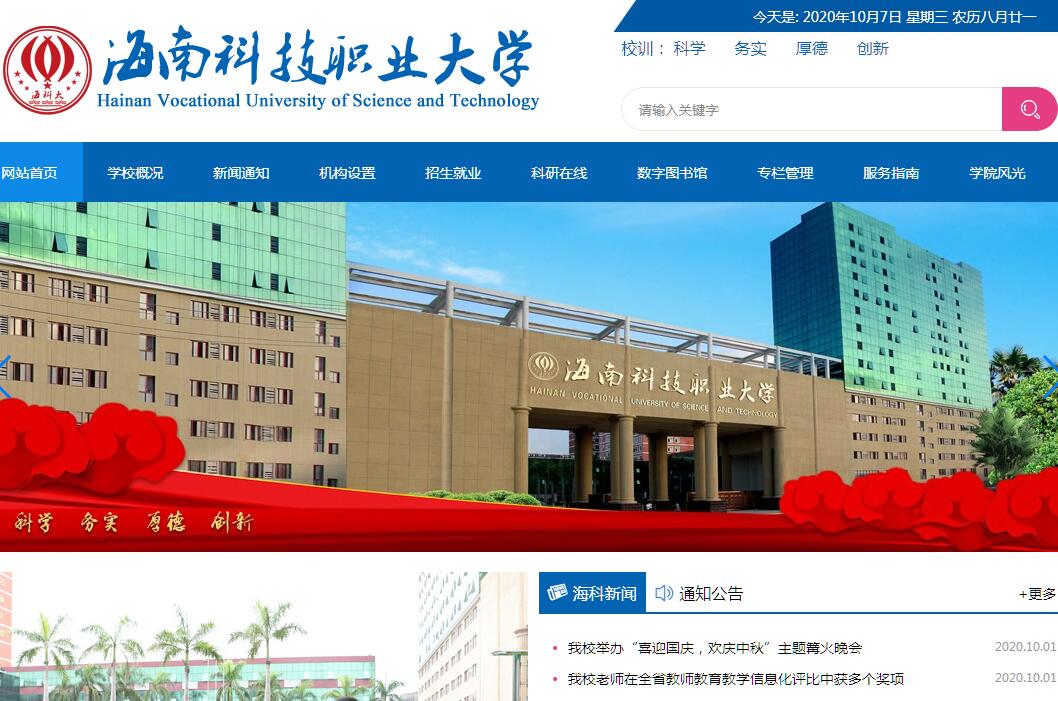海南科技職業(yè)大學(xué)原名海南科技職業(yè)學(xué)院,2008年海南省建省20年并向國際旅游島華麗蛻變之際、在原中央美術(shù)學(xué)院??谛^(qū)的基礎(chǔ)上創(chuàng)建。經(jīng)過十多年的努力,正值海南全面建設(shè)自由貿(mào)易區(qū)(港)時,學(xué)校成功升格并更名為海南科技職業(yè)大學(xué)。學(xué)校現(xiàn)有??谑忻捞m和云龍兩個校區(qū),美蘭校區(qū)位于海南自貿(mào)區(qū)的重點先行區(qū)海口江東新區(qū),以“海洋強(qiáng)校”為特色;云龍校區(qū)位于風(fēng)景優(yōu)美的海口瓊山區(qū)云龍鎮(zhèn),以“醫(yī)養(yǎng)結(jié)合”為特色。兩個校區(qū)共占地1000多畝,其中??谠讫埿^(qū)占地面積507畝。學(xué)?,F(xiàn)有教學(xué)科研儀器設(shè)備總值1.55億元,圖書館紙質(zhì)圖書145萬冊、電子圖書135萬冊、中外期刊100余種。兩個校區(qū)還將根據(jù)在校生規(guī)模的擴(kuò)大,逐年增加教學(xué)設(shè)備和圖書期刊。2020年9月,學(xué)校全日制在校生達(dá)16000人。學(xué)校秉承“科學(xué)、務(wù)實、厚德、創(chuàng)新”的校訓(xùn),堅持“人才強(qiáng)校,質(zhì)量立校,特色興?!钡霓k學(xué)理念,立足海南,面向全國,著眼行業(yè)發(fā)展,關(guān)注社會需求,以立德樹人為根本,以服務(wù)海南經(jīng)濟(jì)社會發(fā)展為宗旨,以創(chuàng)業(yè)就業(yè)為導(dǎo)向,致力于培養(yǎng)高素質(zhì)高層次的技術(shù)技能型人才。