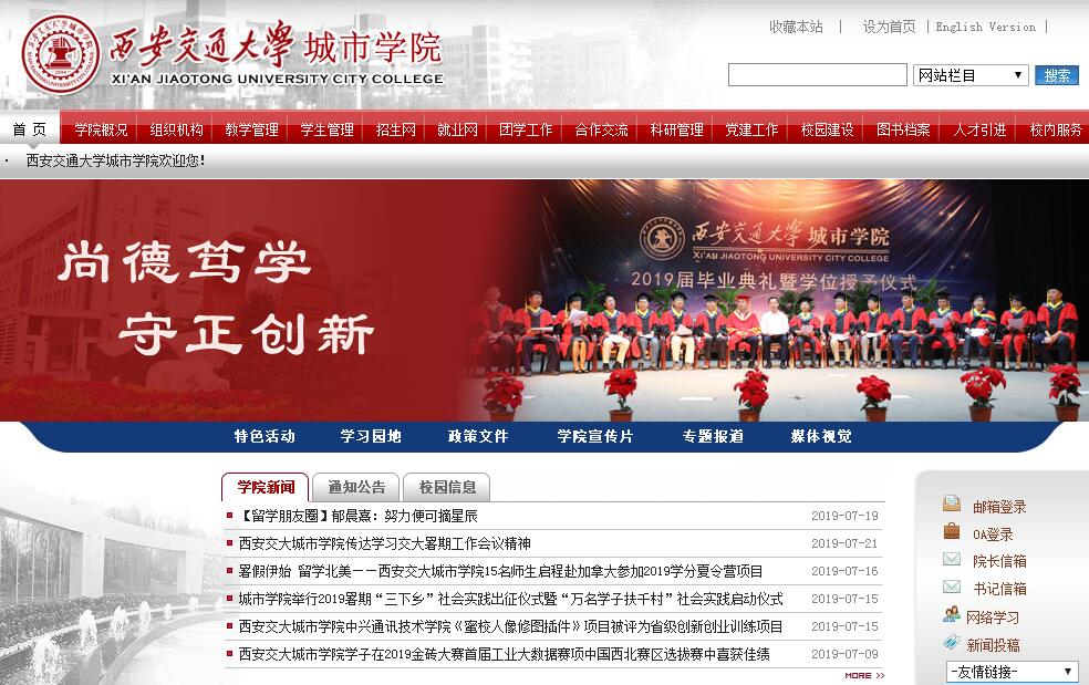 西安交通大學(xué)城市學(xué)院成立于2004年,是經(jīng)國家教育部批準(zhǔn)、由西安交通大學(xué)和西安博通資訊股份有限公司共同舉辦的新型全日制普通本科高校。院長是西安交通大學(xué)博士生導(dǎo)師陳光德教授。學(xué)院的校訓(xùn)是:尚德篤學(xué),守正創(chuàng)新。辦學(xué)定位是:服務(wù)陜西,國內(nèi)一流,國際知名。學(xué)院依托西安交通大學(xué)百年名校優(yōu)質(zhì)的學(xué)科資源、雄厚的師資力量、規(guī)范而嚴(yán)格的教學(xué)管理優(yōu)勢,根據(jù)現(xiàn)代科學(xué)技術(shù)發(fā)展趨勢和地方經(jīng)濟社會發(fā)展需求設(shè)置專業(yè)。學(xué)院面向全國招生,現(xiàn)設(shè)有電氣與信息工程系、計算機科學(xué)與信息管理系、機械工程系、經(jīng)濟系、管理系、外語系、藝術(shù)系、護理系、傳播系、土木建筑工程系等10個系,4個教學(xué)部,16個研究所,44個本科專業(yè),形成了以工科類、經(jīng)管類專業(yè)為支撐,以藝術(shù)、文學(xué)、醫(yī)學(xué)類專業(yè)相配合協(xié)調(diào)的多學(xué)科結(jié)構(gòu)。目前有全日制本科學(xué)生8708名。學(xué)院秉承西安交通大學(xué)優(yōu)良的辦學(xué)傳統(tǒng),通過改革傳統(tǒng)的教學(xué)計劃,構(gòu)建了新的人才培養(yǎng)方案,實施了新的人才培養(yǎng)模式,按照“以學(xué)生為主體,以教師為主導(dǎo),以育人為宗旨,以教學(xué)為中心”的辦學(xué)指導(dǎo)思想,確立了“保證基礎(chǔ),強化實踐,注重能力,提升素質(zhì)”的人才培養(yǎng)指導(dǎo)思想,以培養(yǎng)基礎(chǔ)好、技能強、素質(zhì)高的可持續(xù)發(fā)展應(yīng)用型人才為目標(biāo),著力構(gòu)建按社會需求設(shè)置專業(yè),按學(xué)科大類打好基礎(chǔ),按就業(yè)方向安排模塊,使學(xué)生橫向可轉(zhuǎn)移、縱向可提升,形成了“理論教學(xué)體系、實踐教學(xué)體系、素質(zhì)拓展提升體系”三位一體的應(yīng)用型人才培養(yǎng)方案。注重培養(yǎng)學(xué)生的應(yīng)用能力、創(chuàng)新意識和綜合素質(zhì),努力將學(xué)生培養(yǎng)成為具有合理知識結(jié)構(gòu)、較高綜合素質(zhì)、持續(xù)發(fā)展能力、社會責(zé)任感和競爭力強的優(yōu)秀人才。學(xué)院坐落于西安經(jīng)濟開發(fā)區(qū)草灘生態(tài)產(chǎn)業(yè)園,校園占地523畝,規(guī)劃建筑面積30萬平方米。校園周圍綠水環(huán)繞、花果飄香、空氣清新,基本設(shè)施先進,辦學(xué)條件齊備?,F(xiàn)建有多媒體教室、語音實驗室、電工電子、計算機、物理等教學(xué)實驗中心,以及電氣信息類、機械能動類、土木建筑類、藝術(shù)設(shè)計類、醫(yī)學(xué)護理類和經(jīng)管類等六大類100余個專業(yè)實驗室,此外還有110多個校外實習(xí)實訓(xùn)基地,與中興通訊、中航聯(lián)盟等國內(nèi)著名企業(yè)開展聯(lián)合辦學(xué),為學(xué)生實踐能力和創(chuàng)新能力的培養(yǎng)奠定了基礎(chǔ)。學(xué)院還有5.5萬平方米的籃球、足球、田徑、體操等體育設(shè)施以及大型學(xué)生活動中心等,為學(xué)生德、智、體、美全面發(fā)展提供了良好的條件。學(xué)院圖書館現(xiàn)有面積4347平方米,建設(shè)有4個借閱一體的圖書借閱室,1個擁有65臺計算機的電子閱覽室,共有1106個閱覽座位;已形成以經(jīng)濟、管理、外語、工程技術(shù)類紙質(zhì)圖書為主體的藏書體系。館藏圖書現(xiàn)有83.69萬冊,數(shù)字圖書15265GB,期刊1000余種,全文數(shù)字期刊8300多種,有萬方、維普、超星、讀秀等7個電子數(shù)據(jù)文獻庫,所有資料全天候全開架。學(xué)院自成立之初就非常重視信息化建設(shè),投入了大量資金建設(shè)校園網(wǎng)絡(luò)及管理信息系統(tǒng),目前已建成覆蓋現(xiàn)有園區(qū)的校園網(wǎng)信息點11275個,園區(qū)內(nèi)鋪設(shè)光纜25000余米,實現(xiàn)樓與樓之間主干千兆光纜連接,百兆到桌面的網(wǎng)絡(luò)基礎(chǔ)應(yīng)用環(huán)境。學(xué)院建有多媒體教室82間,座位數(shù)12749個;語音室5間,座位數(shù)238個;計算機教學(xué)機房10間,座位數(shù)766個。于2007年開通了電信(Chinanet)及中國教育網(wǎng)(Cernet)兩條校園網(wǎng)出口,實現(xiàn)了與互聯(lián)網(wǎng)的連接與資源共享,學(xué)院中心機房現(xiàn)有60多臺專用服務(wù)器,為全院師生提供了多項信息應(yīng)用服務(wù)。學(xué)院已經(jīng)建立起一支學(xué)術(shù)帶頭人、教學(xué)名師為龍頭,以中青年教學(xué)骨干為主體,專兼結(jié)合、素質(zhì)優(yōu)良、整體結(jié)構(gòu)合理且發(fā)展趨勢良好的師資隊伍。學(xué)院現(xiàn)有教師530余名,45%具有高級技術(shù)職務(wù),85%具有碩士以上學(xué)歷。享有國務(wù)院政府特殊津貼專家4人,省級教學(xué)名師4人,教育部教學(xué)指導(dǎo)委員會委員5人,國家級教學(xué)成果獎獲得者11人,國家級精品課程負責(zé)人4人,省級精品課程負責(zé)人5人,外籍教師2人,“雙師雙能”型教師150余人。2014年起,學(xué)院在省內(nèi)本科第二批次進行招生,招生質(zhì)量位居陜西省同類院校第一,處于全國同類院校前列。近三年就業(yè)率均達到95%以上。學(xué)院的綜合聲譽不斷提高,在社會上逐步樹立起了良好的形象與品牌,學(xué)院曾被評為“全國先進獨立學(xué)院”“中國民辦