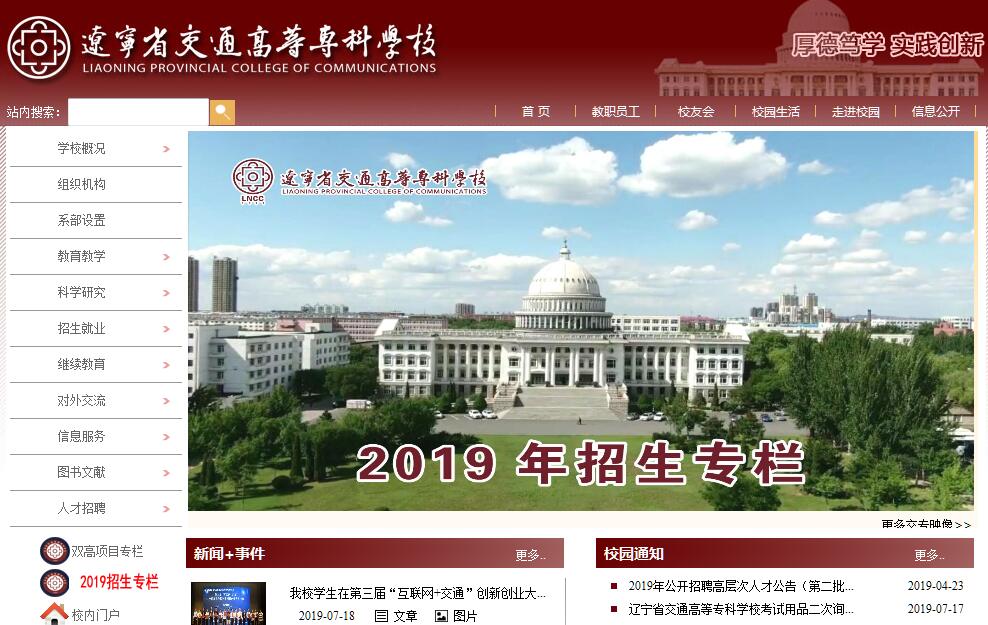 遼寧省交通高等專(zhuān)科學(xué)校坐落于歷史文化名城沈陽(yáng),創(chuàng)建于1951年,為新中國(guó)第一所公路交通類(lèi)專(zhuān)門(mén)學(xué)校。學(xué)校占地60萬(wàn)平方米(900畝),建筑面積27萬(wàn)平方米,教學(xué)儀器設(shè)備總值1.6億元,固定資產(chǎn)7.8億元,館藏紙質(zhì)圖書(shū)64萬(wàn)冊(cè)。全日制在校生10744人,年平均培訓(xùn)2萬(wàn)人次。在職教職工640人,其中專(zhuān)任教師475人。正高級(jí)職稱(chēng)99人,副高級(jí)職稱(chēng)169人,博士32人(其中博士后5人),碩士391人。擁有全國(guó)教學(xué)名師1名、全國(guó)模范教師1名、國(guó)家“萬(wàn)人計(jì)劃”教學(xué)名師2名、遼寧省教學(xué)名師9名,全國(guó)交通職業(yè)教育教學(xué)名師3人,遼寧省和全國(guó)交通高等職業(yè)教育專(zhuān)業(yè)帶頭人11名、遼寧省優(yōu)秀青年骨干教師6名,交通運(yùn)輸部交通運(yùn)輸青年科技英才1名,黃炎培杰出教師2名;國(guó)家級(jí)優(yōu)秀教學(xué)團(tuán)隊(duì)2個(gè)、省級(jí)優(yōu)秀教學(xué)團(tuán)隊(duì)10個(gè);國(guó)家級(jí)教育先進(jìn)集體1個(gè),省級(jí)教育先進(jìn)集體2個(gè)。目前開(kāi)設(shè)44個(gè)專(zhuān)業(yè)(方向),專(zhuān)業(yè)布局以交通為主,地方支柱產(chǎn)業(yè)為輔,主干專(zhuān)業(yè)覆蓋公路建設(shè)與管理、汽車(chē)后市場(chǎng)、道路運(yùn)輸與物流、軌道交通等交通行業(yè)和工程機(jī)械、機(jī)電裝備制造、信息技術(shù)等地方支柱產(chǎn)業(yè)。省級(jí)品牌和示范專(zhuān)業(yè)13個(gè)。設(shè)置9系2部1院,分別為道路橋梁工程系、汽車(chē)工程系、物流管理系、機(jī)電工程系、建筑工程系、測(cè)繪工程系、信息工程系、管理工程系、軌道交通工程系、思政部、體育教學(xué)部、繼續(xù)教育培訓(xùn)學(xué)院。擁有國(guó)家級(jí)教學(xué)成果二等獎(jiǎng)4項(xiàng)、省級(jí)教學(xué)成果21項(xiàng)(一等獎(jiǎng)7項(xiàng));國(guó)家級(jí)精品資源共享課6個(gè)、省級(jí)精品課程33門(mén)。學(xué)校初次就業(yè)率98%以上,一直位居全省同類(lèi)院校前列,連續(xù)多年第一志愿錄取、錄取分?jǐn)?shù)位居全省同類(lèi)院校首位。良好的品牌效應(yīng)使學(xué)校形成了“報(bào)考率高、錄取分?jǐn)?shù)高、報(bào)到率高、就業(yè)率高、就業(yè)質(zhì)量高”的良性循環(huán)。學(xué)校擁有道橋、汽車(chē)、機(jī)電、物流、軌道、信息、測(cè)繪等大型綜合實(shí)訓(xùn)中心,省級(jí)橋梁安全工程中心、交通部甲級(jí)檢測(cè)中心、交通部甲級(jí)監(jiān)理公司等研發(fā)和技術(shù)服務(wù)機(jī)構(gòu)。學(xué)?,F(xiàn)為全國(guó)首批28所國(guó)家示范性高等職業(yè)院校,全國(guó)畢業(yè)生就業(yè)工作50強(qiáng)院校,全國(guó)首屆高等職業(yè)院校服務(wù)貢獻(xiàn)50強(qiáng)院校。中央財(cái)政重點(diǎn)支持建設(shè)的高等職業(yè)院校、國(guó)家汽車(chē)檢測(cè)維修類(lèi)和國(guó)家建設(shè)類(lèi)技能型緊缺人才培養(yǎng)培訓(xùn)基地、全國(guó)職業(yè)院校就業(yè)競(jìng)爭(zhēng)力示范校、全國(guó)高職教育道橋?qū)I(yè)資源開(kāi)發(fā)牽頭單位、全國(guó)職業(yè)教育地下與隧道工程技術(shù)專(zhuān)業(yè)教學(xué)資源庫(kù)建設(shè)牽頭院校、全國(guó)交通運(yùn)輸行業(yè)繼續(xù)教育培訓(xùn)示范基地、教育部高等學(xué)校繼續(xù)教育示范基地、教育部依法治校示范校、全國(guó)職業(yè)院校魅力校園、黃炎培優(yōu)秀學(xué)校獎(jiǎng),遼寧省交通運(yùn)輸業(yè)校企聯(lián)盟牽頭單位、遼寧省汽車(chē)職教集團(tuán)建設(shè)牽頭單位。學(xué)校弘揚(yáng)“厚德、篤學(xué)、實(shí)踐、創(chuàng)新”的校訓(xùn),秉承“腳踏實(shí)地、追求卓越”的學(xué)校精神,堅(jiān)持“立足交通、融入市場(chǎng)、立德樹(shù)人、創(chuàng)育品牌”的特色辦學(xué)理念,在“服務(wù)為宗旨,就業(yè)為導(dǎo)向,產(chǎn)學(xué)研結(jié)合”方針的指導(dǎo)下,以“合作辦學(xué)、合作育人、合作就業(yè)、合作發(fā)展”為工作主線,以“加強(qiáng)內(nèi)涵建設(shè),提高師資水平,推行國(guó)際化教育和教學(xué)標(biāo)準(zhǔn)化建設(shè),培養(yǎng)一線高素質(zhì)、高技能、高技術(shù)人才”為目標(biāo),堅(jiān)持服務(wù)一線不動(dòng)搖,堅(jiān)持交通特色不動(dòng)搖,堅(jiān)持內(nèi)涵建設(shè)不動(dòng)搖,強(qiáng)化優(yōu)勢(shì)特色專(zhuān)業(yè)建設(shè),全面提升核心競(jìng)爭(zhēng)力,建設(shè)遼寧領(lǐng)軍、國(guó)內(nèi)一流前列、國(guó)際知名的高職名校。