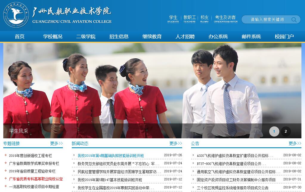 廣州民航職業(yè)技術學院直屬中國民用航空局,是民航內最早一所獨立設置實施高等職業(yè)教育的全日制公辦普通高校。學校1994年被國家教育部確定為全國首批十所試辦五年制高職教育的學校之一;1999年經教育部、民航局批準成立;2010年被教育部、財政部確定為國家示范性高等職業(yè)院校,是全國百所、廣東省四所之一,民航唯一一所國家示范性高等職業(yè)院校;2013年正式成為民航局與廣東省“省部共建”院校;2016年被廣東省教育廳、財政廳確定為“廣東省一流高職院校建設計劃立項建設單位”。學?!傲⒆忝窈?,服務地方,面向世界”,堅持職業(yè)教育類型的辦學定位,在全國率先提出并實施了基于行業(yè)標準的技術技能人才培養(yǎng)模式,形成了“依托行業(yè)、產學合作、雙師雙證、國際通用”的辦學特色。學?,F有機場路校區(qū)、白云機場校區(qū)、花都赤坭校區(qū)三個校區(qū),共占地1112畝?,F有固定資產總值約10.05億元,其中,教學、科研儀器設備資產值約2.39億元,33架大中小型教學用飛機,140臺飛機發(fā)動機,5萬多臺(件)飛機零部件和一大批專業(yè)設備。學校教職工規(guī)模689人,其中,專任教師549人,具有碩士以上學位的教師425人,占專任教師比例為77%;具有雙師素質的專業(yè)教師224人,占專業(yè)課教師數的比例為64%;具有行業(yè)企業(yè)一線工作經歷的教師比例為44.8%;具有民航行業(yè)特有工種職業(yè)資格證書、職業(yè)技能鑒定考評員及教員證書、其他工種職業(yè)資格證書的教師比例為41%。學校下設飛機維修工程學院、航空港管理學院、民航經營管理學院、人文社科學院、繼續(xù)教育學院五個二級學院。面向31個省、市、自治區(qū)招生,現有21個專業(yè)26個專業(yè)方向,覆蓋了民航維修和服務的關鍵崗位,在校生1.2余萬人。新生報到率、畢業(yè)生就業(yè)率、專業(yè)對口率等方面均走在同類院校前列,其中,飛機機電設備維修、飛機結構修理、航空電子設備維修、航空地面設備維修、通用航空器維修等民航特有專業(yè)對口率均超過90%,優(yōu)秀畢業(yè)生已成為技術骨干與管理人才。學校以現代民用航空體系和航空產業(yè)鏈建設需求為導向,以飛機維修、民航運輸等民航特有專業(yè)崗位(群)核心能力培養(yǎng)為主線,創(chuàng)新了“課證一體、中外融通、校企融合”的民航特有專業(yè)人才培養(yǎng)模式。制定了基于行業(yè)標準的民航特有專業(yè)課程教學標準,做到“行業(yè)標準入體系、職業(yè)標準入課程”,與民航行業(yè)企業(yè)合作共建民航飛機維修工程、航空港安全檢查、航空服務、通用航空等民航特有專業(yè)的校企共享型“公共實訓平臺”,為全國其他院校的民航專業(yè)教學起到引領作用。學校不斷加強與美國、英國、加拿大、新加坡、香港等境外院校和航空企業(yè)合作,提升辦學國際化水平;與斯里蘭卡等“一帶一路”沿線國家開展民航職業(yè)教育合作,實現教育資源對外輸出;先后與美國西敏學院、馬來西亞建設大學、臺灣中華科技大學開展本科層次職業(yè)教育合作,搭建人才成長“立交橋”,實現民航職業(yè)教育體系中外銜接;通過國際合作與對外交流,促進了人才培養(yǎng)標準、師資、教材和管理國際化,實現了學校教育與國際接軌,提升了民航職業(yè)教育軟實力。