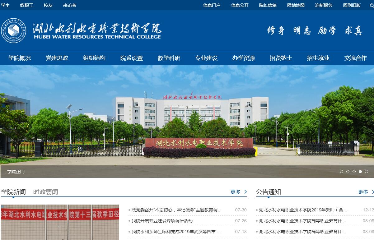 湖北水利水電職業(yè)技術學院是2002年經湖北省人民政府批準組建的公辦普通高等職業(yè)院校。辦學60 年來,累計為國家培養(yǎng)和輸送各類中高級專業(yè)技術人才4萬多名,并逐步發(fā)展成為全國重要的水利水電人才培養(yǎng)基地、水利部行業(yè)定點培訓中心和行業(yè)職業(yè)技能鑒定中心。2012年,被水利部確認為首批“全國水利高等職業(yè)教育示范院?!?。被省教育廳授予“省級平安校園”,被湖北省委、省政府授予“全省最佳文明單位” 光榮稱號。2013年,被湖北省總工會授予“湖北五一勞動獎狀”。學院共有兩個校區(qū),總占地面積600畝,在校生8600余人。學院現有在職教工430人,其中專任教師242名,正、副高級職稱教師 95名,“湖北名師”1名,湖北省“楚天技能名師”特聘教學崗位6個。學院設有院辦、黨辦等11個職能處室和職業(yè)技能鑒定所、后勤服務中心、教材中心等3 個管理及服務單位;開設有水利工程系、建筑工程系、機電工程系、電力電子系、商貿管理系、基礎課部、繼續(xù)教育部等7個教學系部;開辦了設計院、監(jiān)理公司等 3個產業(yè)實體。學院開設高職專業(yè)39個,其中全國水利職業(yè)教育示范專業(yè)2個、湖北省高職教育重點專業(yè)2個,省級重點及教學改革試點專業(yè)4個。學院現有國家級精品課程1門、省級精品課程5門、教指委精品課程2門,擁有國家及省級實訓基地5個。學院現有資產總值3億多元,其中教學儀器設備總值達5500萬元。圖書館建筑面積2.2萬多平方米,館藏圖書50余萬冊。學院主動適應市場經濟形勢,堅持服務水利行業(yè)、服務“三農”、服務區(qū)域經濟發(fā)展的辦學方向,以服務為宗旨,以就業(yè)為導向,以培養(yǎng)高素質技能型人才為目標。