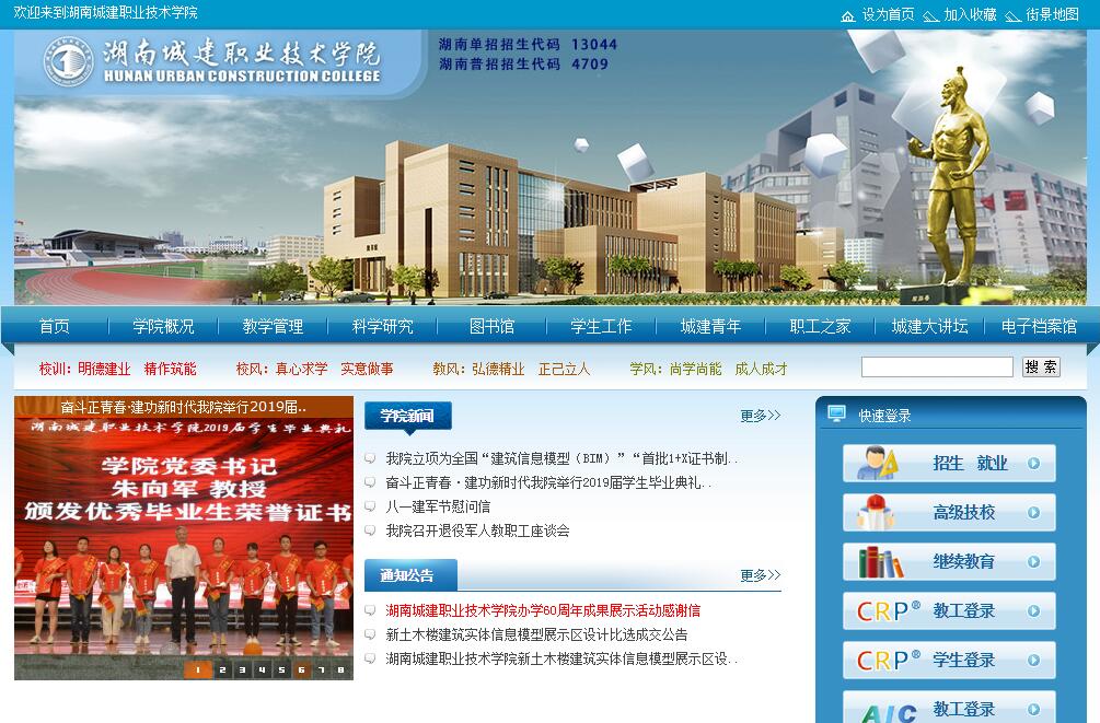 湖南城建職業(yè)技術(shù)學(xué)院前身是1958年成立的湖南省土木建筑學(xué)校,1972年更名為湖南省建筑學(xué)校,2003年,經(jīng)湖南省人民政府批準(zhǔn),由湖南省建筑學(xué)校與湖南省建材工業(yè)學(xué)校合并組建湖南城建職業(yè)技術(shù)學(xué)院。2008年,原長沙職工大學(xué)(湖南建筑高級技工學(xué)校)并入學(xué)院。2011年成為湖南省示范性高職院校。2018年立項湖南省高等職業(yè)教育卓越高職院校建設(shè)單位。在60年辦學(xué)歷程中,學(xué)院勵精圖治,艱苦奮斗,為社會培養(yǎng)了十二萬多名高素質(zhì)技術(shù)技能人才,培訓(xùn)了數(shù)萬名企業(yè)經(jīng)理、項目經(jīng)理和建筑業(yè)專業(yè)技術(shù)人員,被譽為湖南建設(shè)人才的搖籃和百萬建筑湘軍的“黃埔軍?!薄,F(xiàn)有全日制高職在校生10135人。學(xué)院秉承“明德建業(yè)、精作筑能”的校訓(xùn),堅持“塑造人格,培養(yǎng)技能,張揚個性,服務(wù)社會”的辦學(xué)理念,確立“具有自主知識產(chǎn)權(quán)、城建高職教育特色鮮明、省內(nèi)領(lǐng)先、國內(nèi)一流、國際有影響的卓越高職院?!钡陌l(fā)展目標(biāo),以“真心求學(xué)、實意做事”為校風(fēng),以“弘德精業(yè)、正己立人”為教風(fēng),以“尚學(xué)尚能、成人成才”為學(xué)風(fēng),培養(yǎng)德智體美勞全面發(fā)展,基礎(chǔ)扎實,技能過硬,素質(zhì)優(yōu)良,適應(yīng)城鄉(xiāng)建設(shè)行業(yè)生產(chǎn)、建設(shè)、服務(wù)、管理第一線需要的“首選高素質(zhì)技術(shù)技能人才”。學(xué)院現(xiàn)設(shè)有建筑系、建筑工程系、建筑設(shè)備工程系、管理工程系、市政與路橋工程系、公共基礎(chǔ)課教學(xué)部、思想政治理論課教學(xué)部和1所建筑高級技校、1所繼續(xù)教育學(xué)院。學(xué)院開設(shè)23個高職專業(yè),建筑工程技術(shù)專業(yè)群、建筑設(shè)計技術(shù)專業(yè)群、建筑工程管理專業(yè)群為湖南省一流特色專業(yè)群;以建筑工程技術(shù)專業(yè)為核心的建筑工程施工與管理專業(yè)群為省級示范性特色專業(yè)群;工程造價、建筑設(shè)計技術(shù)專業(yè)為省級特色專業(yè)和省級精品專業(yè);建筑工程技術(shù)實習(xí)實訓(xùn)基地為中央財政支持的職教實訓(xùn)基地、湖南省職教重點實習(xí)實訓(xùn)基地;建筑設(shè)備工程技術(shù)專業(yè)為省級生產(chǎn)性實習(xí)實訓(xùn)(教師認(rèn)證培訓(xùn))基地項目;工程造價專業(yè)為省級校企合作生產(chǎn)性實習(xí)實訓(xùn)基地項目;學(xué)院牽頭組建的湖南建筑職業(yè)教育集團為省級示范性職教集團。學(xué)院現(xiàn)有教職工628人,其中教師429人,正高職稱14人,副高職稱151人;博士研究生3人,具有研究生學(xué)歷或碩士學(xué)位300人。省級專業(yè)帶頭人3人,省級青年骨干教師8人,省級優(yōu)秀教學(xué)團隊2個,國家一級注冊建筑師、一級注冊結(jié)構(gòu)工程師、一級注冊建造師等“雙師素質(zhì)”教師258名;多名教師在教育部、住建部、中國建設(shè)教育協(xié)會和省教育廳、省住建廳、省建設(shè)人力資源協(xié)會等部門(機構(gòu))擔(dān)任專家。學(xué)院受省教育廳委托主持編制了《湖南省中等職業(yè)學(xué)校專業(yè)教師培訓(xùn)與考核標(biāo)準(zhǔn)·建筑工程技術(shù)類標(biāo)準(zhǔn)》和湖南省高職院校建筑工程技術(shù)、工程造價、建筑裝飾工程技術(shù)三個專業(yè)的學(xué)生專業(yè)技能抽查標(biāo)準(zhǔn),牽頭負(fù)責(zé)全省高職院校建筑工程技術(shù)和工程造價專業(yè)學(xué)生專業(yè)技能抽考工作;受省住建廳委托主持編制了《湖南省土建類中、初級專業(yè)技術(shù)職務(wù)任職資格考試大綱》、《建筑業(yè)農(nóng)民工培訓(xùn)指南》和湖南省建筑業(yè)企業(yè)專業(yè)技術(shù)管理人員(八大員十崗位)崗位資格考試大綱、遠程考試試題庫、培訓(xùn)教材;先后完成了一、二級注冊建造師繼續(xù)教育培訓(xùn)、建設(shè)行業(yè)職業(yè)技能鑒定考評員培訓(xùn)和全省職業(yè)院校建筑工程技術(shù)專業(yè)教師企業(yè)頂崗實踐培訓(xùn)等多個培訓(xùn)項目,是湖南建設(shè)行業(yè)和建設(shè)類職業(yè)院校教學(xué)指導(dǎo)中心、實習(xí)實訓(xùn)中心、師資培訓(xùn)中心、職業(yè)資格鑒定培訓(xùn)中心。在推進建設(shè)行業(yè)技術(shù)進步、提高建筑業(yè)從業(yè)人員技能水平、引領(lǐng)建設(shè)職業(yè)教育創(chuàng)新發(fā)展等方面發(fā)揮了巨大作用,在行業(yè)內(nèi)和同類院校中享有良好聲譽。學(xué)院2006年12月通過第一輪教育部高職高專院校人才培養(yǎng)工作水平評估并獲優(yōu)秀等級,2011年12月高票通過第二輪教育部高等職業(yè)院校人才培養(yǎng)工作評估,是湖南建筑職業(yè)教育集團理事長單位、湖南省建設(shè)人力資源協(xié)會職業(yè)院校委員會主任單位、湖南省職業(yè)教育與成人教育學(xué)會高職土木建筑類專業(yè)委員會主任單位、全國裝配式建筑科技創(chuàng)新基地(湖南省裝配式建筑技術(shù)培訓(xùn)中心)、中國建筑工業(yè)出版社中南地區(qū)職業(yè)教育教材出版研發(fā)基地、全國建設(shè)行業(yè)技能型緊缺人才培養(yǎng)培訓(xùn)基地、全國建材工業(yè)人才培訓(xùn)基