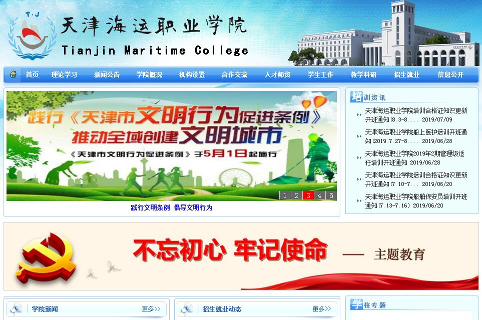 天津海運職業(yè)學(xué)院是天津市教委直屬的以培養(yǎng)海運人才為主,具有工學(xué)、經(jīng)濟學(xué)、管理學(xué)等學(xué)科門類的綜合性公辦全日制高等職業(yè)院校,其辦學(xué)歷史可追溯到1962年成立的天津市科學(xué)技術(shù)進修學(xué)院。學(xué)院是我國海事局向國際海事組織申報船員培訓(xùn)機構(gòu)之一,是天津海事局在華北地區(qū)最先開辦海員對外適任證書培訓(xùn)的機構(gòu)之一,也是華北地區(qū)首批通過國家海事局《船員教育和培訓(xùn)質(zhì)量體系》認證的教育培訓(xùn)單位,被教育部和天津市政府授予“濱海新區(qū)航海運輸技能型緊缺人才培養(yǎng)基地”。2009年,學(xué)院順利通過教育部對學(xué)院人才培養(yǎng)工作的評估;2016年,學(xué)院被確定為天津市國內(nèi)一流校(優(yōu)質(zhì)校)建設(shè)單位;2017年,學(xué)院被確定為天津市世界先進水平高職院校建設(shè)單位。學(xué)院位于國家職業(yè)教育改革創(chuàng)新示范區(qū)——天津海河教育園區(qū),總占地面積43萬余平方米,建筑面積20萬余平方米,建有現(xiàn)代化的教學(xué)樓、圖書館、電子閱覽室、體育場館以及設(shè)施設(shè)備先進的專業(yè)實驗、實訓(xùn)室等。現(xiàn)有館藏各類書刊近70萬冊。學(xué)院全日制在校生近八千人,教職工近五百人。學(xué)院緊緊圍繞國家海洋強國、“一帶一路”倡議和“京津冀協(xié)同發(fā)展”戰(zhàn)略,堅持大力發(fā)展適應(yīng)海運特色和環(huán)渤海地區(qū)建設(shè)所需專業(yè),形成以水上運輸類專業(yè)為核心,以現(xiàn)代服務(wù)業(yè)類專業(yè)為主干,以裝備制造類和電子信息類專業(yè)為兩翼的“一核一干兩翼”專業(yè)構(gòu)架。現(xiàn)有航海技術(shù)、輪機工程技術(shù)、國際郵輪乘務(wù)管理、港口與航運管理、船舶通信與導(dǎo)航、游艇設(shè)計與制造、理化測試與質(zhì)檢技術(shù)(無損檢測技術(shù))等27個專業(yè)。其中,國際郵輪乘務(wù)管理專業(yè)被教育部等五部委確定為全國職業(yè)院校交通運輸大類示范專業(yè)點,航海技術(shù)、輪機工程技術(shù)、國際郵輪乘務(wù)管理3個專業(yè)被確定為天津市高職院校提升辦學(xué)能力建設(shè)項目優(yōu)質(zhì)骨干專業(yè),航海技術(shù)、國際郵輪乘務(wù)管理、輪機工程技術(shù)、理化測試與質(zhì)檢技術(shù)(無損檢測技術(shù))和港口與航運管理5個專業(yè)被確定為天津市高職院校提升辦學(xué)能力建設(shè)項目骨干專業(yè)。同時,學(xué)院還承擔(dān)完成了天津市航海技術(shù)、國際郵輪乘務(wù)管理、輪機工程技術(shù)、理化測試與質(zhì)檢技術(shù)(無損檢測技術(shù))等4個國際化專業(yè)教學(xué)標(biāo)準(zhǔn)項目的開發(fā)工作。學(xué)院下設(shè)航海技術(shù)系、輪機工程系、航運經(jīng)濟系、國際郵輪乘務(wù)和旅游管理系、工程技術(shù)系、信息工程系、社科部(體育部)等7個教學(xué)部門。學(xué)院堅持以立德樹人為根本,以服務(wù)發(fā)展為宗旨,以促進就業(yè)為導(dǎo)向,秉承“工學(xué)結(jié)合、三證融通、軍事化管理、禮儀教育”辦學(xué)方針,融“學(xué)歷教育、職業(yè)技能培訓(xùn)和職業(yè)資格證書培訓(xùn)”于一體,把思想政治工作貫穿教育教學(xué)全過程,致力于培養(yǎng)具有國際視野與家國情懷、海洋意識與社會責(zé)任、創(chuàng)新精神與實踐能力的高素質(zhì)技術(shù)技能人才。在學(xué)生管理過程中,結(jié)合海運特色,采取準(zhǔn)軍事化管理模式,強化對學(xué)生的素質(zhì)訓(xùn)練和養(yǎng)成教育。近年來,學(xué)生就業(yè)率一直保持在98%以上。學(xué)院高度注重學(xué)生實踐能力培養(yǎng),建有適用夠用、適度超前,以中央財政投資建設(shè)的船舶操縱模擬實訓(xùn)室、輪機模擬器實訓(xùn)室、集裝箱運輸管理實訓(xùn)室等為代表的校內(nèi)實驗實訓(xùn)室97個和校外水上訓(xùn)練基地,與社會共建校外實訓(xùn)基地117個。成為目前華北地區(qū)規(guī)模最大、培訓(xùn)資質(zhì)最全、功能最具領(lǐng)先性的海船船員學(xué)歷教育和培訓(xùn)基地。學(xué)院發(fā)揮自身特色優(yōu)勢,不斷豐富服務(wù)內(nèi)容,努力創(chuàng)新服務(wù)形式,依靠科研和專項職業(yè)能力培訓(xùn),全方位服務(wù)區(qū)域行業(yè)經(jīng)濟社會發(fā)展。近年來,學(xué)院承擔(dān)各級各類科研課題近200項,積極開展基本安全培訓(xùn)、保安員培訓(xùn)、船長培訓(xùn)、輪機長培訓(xùn)、大副培訓(xùn)、大管輪培訓(xùn)、客船船員特殊培訓(xùn)、履約培訓(xùn)、會計電算化培訓(xùn)、商務(wù)管理培訓(xùn)等90余項培訓(xùn)項目,培訓(xùn)人次數(shù)達到13萬余人次。學(xué)院按照航海教育國際化標(biāo)準(zhǔn)、國際化課程、國際化就業(yè)的特點,瞄準(zhǔn)培養(yǎng)適應(yīng)國際人才市場競爭,滿足國際品牌企業(yè)用人需要的國際化技術(shù)技能型人才,先后與美國皇家加勒比游輪公司等多家國際企業(yè)以及荷蘭海事大學(xué)、斯里蘭卡科倫坡大學(xué)、英國達德利學(xué)院、法國勒摩尼耶學(xué)院、波蘭馬拉帕斯卡酒店管理學(xué)院、新加坡海聯(lián)海事學(xué)院、歐洲職業(yè)教育中心、歐亞商業(yè)教育基金會等20所院校和機構(gòu)簽訂合