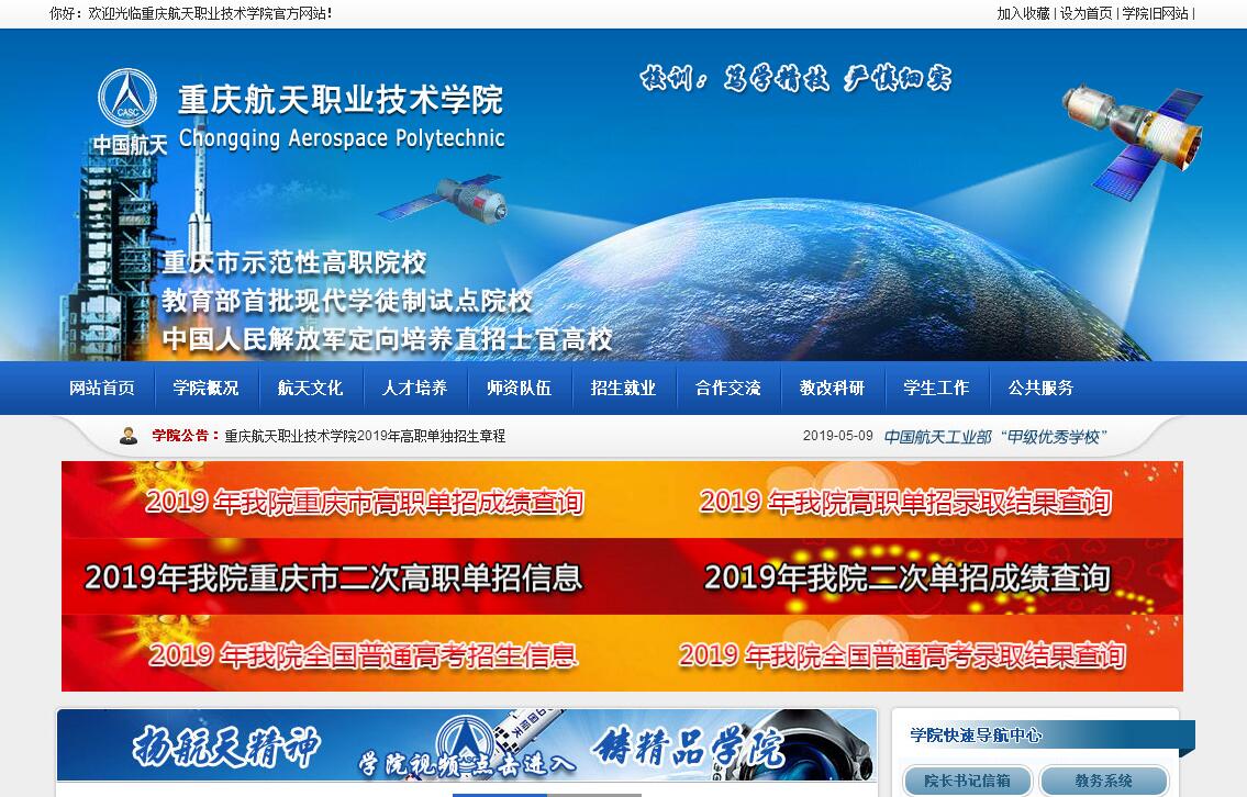 美麗的山城重慶,一個(gè)有三千年巴渝文化底蘊(yùn)的歷史名城,山青水秀,豐姿卓越,孕育了重慶市第一所獨(dú)立設(shè)置的高等職業(yè)技術(shù)學(xué)院——重慶航天職業(yè)技術(shù)學(xué)院。重慶航天職業(yè)技術(shù)學(xué)院是中國航天科技集團(tuán)公司主辦,重慶市教委主管的公辦全日制普通高等職業(yè)院校。其前身是西南航天職工大學(xué),始建于1983年4月;1999年7月經(jīng)教育部批準(zhǔn),轉(zhuǎn)制為重慶電子職業(yè)技術(shù)學(xué)院,是重慶市第一所獨(dú)立設(shè)置的高等職業(yè)技術(shù)院校;2008年3月更名為重慶航天職業(yè)技術(shù)學(xué)院;2013年被重慶市教委、重慶市財(cái)政局確立為“重慶市市級(jí)示范性高等職業(yè)院?!埃?015年被教育部確定為“中國人民解放軍定向培養(yǎng)直招士官高?!焙汀叭珖着F(xiàn)代學(xué)徒制試點(diǎn)院?!?;2016年被教育部確立為“全國首批職業(yè)院校內(nèi)部質(zhì)量保證體系診斷與改進(jìn)試點(diǎn)院?!?;2018年被確定為“重慶市優(yōu)質(zhì)高等職業(yè)院校建設(shè)單位”。 在重慶市委、市政府、市教委和中國航天科技集團(tuán)公司、中國航天科技集團(tuán)公司第七研究院的關(guān)懷和指導(dǎo)下,歷經(jīng)三十年的辦學(xué)實(shí)踐,學(xué)院以“敢為人先、嚴(yán)謹(jǐn)務(wù)實(shí)”的作風(fēng),逐步形成了“開放辦學(xué)、科學(xué)管理、質(zhì)量立校、特色強(qiáng)?!钡霓k學(xué)理念,樹立了“勤學(xué)、自強(qiáng)、敬業(yè)、創(chuàng)新”的優(yōu)良校風(fēng)。學(xué)院現(xiàn)有江北校區(qū)和江津校區(qū),共占地400余畝,建筑面積25余萬平方米。學(xué)院面向全國17個(gè)省市招生,高職在校學(xué)生9300余人。固定資產(chǎn)總值2.5億余元,教學(xué)儀器設(shè)備總值7246萬元,各類館藏紙質(zhì)圖書 60萬余冊,并配有先進(jìn)的電子閱覽室。學(xué)院擁有16個(gè)校內(nèi)實(shí)訓(xùn)基地,其中“電工電子與自動(dòng)化實(shí)訓(xùn)基地”、“數(shù)控技術(shù)實(shí)訓(xùn)基地”、 “酒店管理實(shí)訓(xùn)基地” 、“計(jì)算機(jī)應(yīng)用與軟件技術(shù)實(shí)訓(xùn)基地”是中央財(cái)政支持的職業(yè)教育實(shí)訓(xùn)基地,園林工程技術(shù)實(shí)訓(xùn)基地和會(huì)計(jì)電算化實(shí)訓(xùn)基地是重慶市財(cái)政支持的職業(yè)教育實(shí)訓(xùn)基地。學(xué)院依托航天企業(yè)、重慶地方企業(yè)和國防部隊(duì),建設(shè)了200余個(gè)校外實(shí)訓(xùn)實(shí)習(xí)基地。學(xué)院設(shè)有機(jī)電工程系、電子工程系、計(jì)算機(jī)工程系、管理工程系、人文社科系、藝術(shù)設(shè)計(jì)系、學(xué)前教育系、繼續(xù)教育學(xué)院、基礎(chǔ)學(xué)科部等教學(xué)單位,開設(shè)有無人機(jī)應(yīng)用技術(shù)、智能控制技術(shù)、云計(jì)算技術(shù)與應(yīng)用、會(huì)計(jì)、空中乘務(wù)、園林工程技術(shù)、學(xué)前教育等37個(gè)專業(yè)。電子信息工程技術(shù)、應(yīng)用電子技術(shù)和通信技術(shù)是中國人民解放軍定向培養(yǎng)直招士官專業(yè)。學(xué)院已建成國家級(jí)重點(diǎn)(支持)專業(yè)6個(gè),重慶市財(cái)政支持的重點(diǎn)或特色專業(yè)20個(gè),重慶市高職示范專業(yè)4個(gè),重慶市高職特色專業(yè)2個(gè)。學(xué)院現(xiàn)有國家級(jí)精品課程1門,市級(jí)精品課程12門,市級(jí)精品課程和在線精品開放課程等20門。教師主、參編教材200余部,15部列入國家規(guī)劃教材;承擔(dān)各級(jí)科研、教研項(xiàng)目300余項(xiàng),取得教科研成果134項(xiàng),獲國家授權(quán)專利110余項(xiàng);科研教研成果獲得省部級(jí)及以上獎(jiǎng)勵(lì)50余項(xiàng)。學(xué)院有教職工478人,其中專任教師308人,教授25人,副教授、高級(jí)工程師110人,講師、工程師154人,博士、碩士研究生162人,雙師型教師271人。其中享受國家政府特殊津貼專家1人,全國職教先進(jìn)個(gè)人1人,重慶市教學(xué)名師2人,重慶市中青年骨干教師6人,國家和市級(jí)專家?guī)斐蓡T13人。學(xué)院還從中國航天科技集團(tuán)聘任3位兩院院士擔(dān)任特聘教授,聘請航天軍工等企事業(yè)單位百余名技術(shù)、管理骨干和能工巧匠擔(dān)任兼職教師。目前,學(xué)院還有專兼結(jié)合的專業(yè)教學(xué)團(tuán)隊(duì)37個(gè)和8個(gè)通識(shí)課程教研室。其中有6個(gè)重慶市高等學(xué)校市級(jí)教學(xué)團(tuán)隊(duì),航天七院優(yōu)秀班組6個(gè)。學(xué)院堅(jiān)持培養(yǎng)面向生產(chǎn)、建設(shè)、服務(wù)和管理第一線需要的“下得去、留得住、用得上”,實(shí)踐能力強(qiáng)、具有良好職業(yè)道德的高素質(zhì)技術(shù)技能型人才;構(gòu)建了“校企一體、產(chǎn)學(xué)結(jié)合、職業(yè)導(dǎo)向、立體培養(yǎng)”的人才培養(yǎng)模式;確立了“建設(shè)以電子信息、智能制造技術(shù)為主,適應(yīng)航天航空事業(yè)、國防事業(yè)和重慶經(jīng)濟(jì)發(fā)展的專業(yè)體系,積極開展應(yīng)用技術(shù)研究、社會(huì)職業(yè)培訓(xùn)及其他社會(huì)服務(wù),成為國內(nèi)知名、業(yè)內(nèi)有影響力的航天特色鮮明的一流高等職業(yè)院校”的辦學(xué)定位。建校以來,為航天和社會(huì)