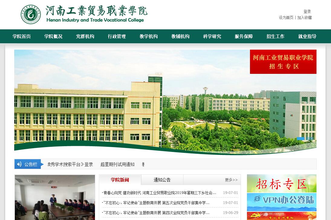 河南工業(yè)貿易職業(yè)學院是一所省屬公辦高等職業(yè)學院。學院具有具有悠久歷史和深厚文化底蘊,1950年,學院的前身——河南省財政廳糧食干部訓練班在當時的省會開封市組建。1953年省會遷鄭之際,已更名為河南省糧食干部學校的新校也隨之落戶于鄭州市優(yōu)勝北路4號。1965年,河南省糧食學校宣告成立,與河南省糧食干部學校共同承擔著全省糧食行業(yè)人才培養(yǎng)、干部培訓的任務。1997年,學校再度易名為河南省經濟貿易學校。2004年,經河南省人民政府批準,2005年,經國家教育部備案,在河南省經濟貿易學校的基礎上,組建河南工業(yè)貿易職業(yè)學院,學校由此邁入了普通高等院校行列。目前,學院分南北兩個校區(qū),占地面積35萬平方米,總建筑面積21萬平方米。現有8個教學系部,35個專業(yè)(方向),其中省級重點專業(yè)1個,省級特色專業(yè)1個。擁有校內實驗實訓中心(室)52個,其中國家級實訓基地1個,省級示范性實訓基地4個;校外實習基地54個。是全國營銷員資格考試、全國物流師資格考試、全國計算機等級考試等8個能力考點及培訓點,設有全國糧食行業(yè)特有工種技能培訓中心和國家職業(yè)技能鑒定所。學院現有固定資產總值20009.2萬元,教學儀器設備總值4130萬元。學院圖書館館藏圖書50余萬冊。學院擁有設施齊全的公寓式學生宿舍、學生和教工食堂、標準體育運動場等。良好的辦學條件為學院提高人才培養(yǎng)質量奠定了堅實的物質基礎。學院始終把加強師資隊伍建設作為首要的戰(zhàn)略任務,堅持“持久抓,抓持久”。學院現有教職工412人,其中,高級專業(yè)技術職務教師64,碩士研究生以上學歷教師72人,“雙師型”教師159人,有6名教師被命名為省級學術技術帶頭人,10名教師被評選為省級骨干教師、省級優(yōu)秀教師,10余名教師在省級以上學術團體中擔任會長、理事、主任、副主任、秘書長等職務。一支結構合理、師德高尚、業(yè)務精通、治學嚴謹的高素質師資隊伍,為不斷提升學院教育教學質量提供了可靠保障。學院始終堅持把嚴格嚴謹的辦學傳統滲透在日常教育教學的方方面面,突出加強專業(yè)建設,不斷完善教學質量評估和監(jiān)督制度、督導巡視制度、信息反饋制度,形成了富有成效的人才培養(yǎng)質量監(jiān)控體系。 學院始終堅持 “以教學帶科研,以科研促教學,以教研科研育人才”的方針,使教師隊伍擁有較強的教研科研能力,并取得了豐碩的教學科研成果。近兩年來,全院教職工承擔省部級、廳局級教科研課題90余項,在公開刊物上發(fā)表學術論文800余篇,公開出版專著、教材、教輔讀物近160部,有3項教科研成果獲省部級獎勵。學院積極面向國內外實施開放辦學戰(zhàn)略,先后與四川大學、南開大學、首都師范大學開展遠程本科教育、在職人員攻讀碩士研究生學位教育等合作項目,與加拿大麥迪遜·海特學院、德國F+U薩克森職業(yè)培訓學院、英國哈珀·亞當斯大學等海外高校開展交流合作,形成了立足河南,面向全國,走向世界的開放型辦學格局。在辦學思想上,學院把提高學生的就業(yè)創(chuàng)業(yè)能力,視作學校的聲譽和生命力之所系;在辦學模式上實施“訂單式”培養(yǎng),確保人才培養(yǎng)與社會需求同步;在辦學機制上實行更加靈活的教學管理制度,開展工學交替實驗,重視復合型技能型人才培養(yǎng),注重提高學生的綜合素質和職業(yè)技能。堅持走產學合作之路。一是堅持大力推進校企合作,建立和不斷完善產學合作教育的領導體制和運行機制,增強學院辦學活力;二是積極實施“雙證書”、“多證書”制度,強化學生職業(yè)能力培養(yǎng);三是高度重視實踐性教學,積極推行“仿真實訓”、“生產型實訓”和“頂崗實習”,有效地提高了學生的職業(yè)技能。學院被國家人力資源和社會保障部授予“國家技能人才培育突出貢獻獎”,被國家糧食局授予“糧食行業(yè)技能人才培育突出貢獻獎”、“全國糧食系統四五普法先進單位”,被教育部評為“全國職業(yè)技術學校職業(yè)指導工作先進學校”,被中國教育學會授予“全國職業(yè)教育管理創(chuàng)新學校”稱號,被社會公眾評為“河南省最具影響力的十佳職業(yè)院校”。2008年,在全國高職高專人才培養(yǎng)水平評估中,我院被評為“優(yōu)秀”等級。被中共河南省委、河南省人民政府命名為“省級文明單位”。雄厚的師資、一流的設施、優(yōu)美的環(huán)境、濃厚的育人氛圍,使學院成為師生理想的學園、舒適的家園、育人的樂園、優(yōu)美的花園、安全的校園。
