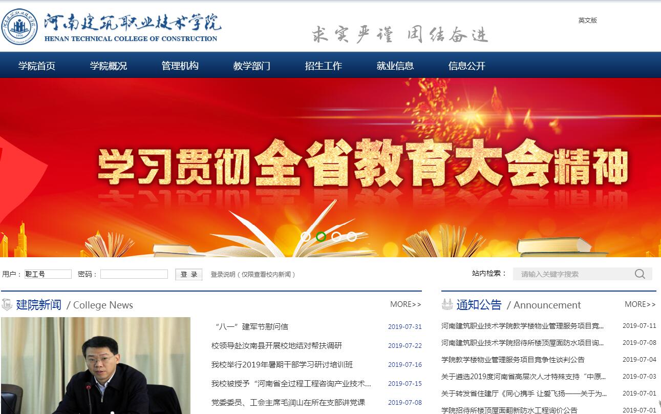 河南建筑職業(yè)技術(shù)學院(以下簡稱河南建院)成立于1956年,占地600余畝,教職工663人,在校生14000余人,是河南省住房和城鄉(xiāng)建設(shè)廳直屬的全省唯一一所建筑類高等職業(yè)院校,是河南省職業(yè)教育品牌示范院校、國家中等職業(yè)教育改革發(fā)展示范學校、河南省語言文字規(guī)范化示范學校、河南省依法治校示范校、河南省現(xiàn)代學徒制省級試點院校、河南省民族團結(jié)進步創(chuàng)建示范單位,是河南省建設(shè)行業(yè)職業(yè)教育校企合作指導委員會秘書長單位和河南省建筑職教集團理事長單位,連續(xù)兩年獲得河南省住房和城鄉(xiāng)建設(shè)廳“五好”黨委、先進單位等榮譽稱號,榮獲省教育廳創(chuàng)新創(chuàng)業(yè)優(yōu)秀單位、畢業(yè)生就業(yè)創(chuàng)業(yè)工作先進單位等多項榮譽稱號,連續(xù)兩年在全省教育系統(tǒng)“兩創(chuàng)兩爭”群眾性精神文明創(chuàng)建活動中獲多個獎項,連續(xù)三年在河南日報集團組織開展的全省高校社會評議中榮獲“河南高等教育就業(yè)質(zhì)量最佳示范院?!睒s譽稱號,形成了“求實嚴謹,團結(jié)奮進”的校風。河南建院人才培養(yǎng)定位和方向是建設(shè)行業(yè)高素質(zhì)高技能型專業(yè)人才,城市建設(shè)和管理的高素質(zhì)實用型人才。61年的發(fā)展過程中,學校向省內(nèi)外建設(shè)行業(yè)和各行各業(yè)的建設(shè)領(lǐng)域輸送了成千上萬的優(yōu)秀人才,成就了一大批建設(shè)決策管理者和大型建筑企業(yè)的領(lǐng)軍人物,有些畢業(yè)生已經(jīng)成為各級黨委政府和黨政部門的主要領(lǐng)導。在河南省住房和城鄉(xiāng)建設(shè)廳的行業(yè)管理和指導下,學校與省內(nèi)外建設(shè)規(guī)劃、勘察設(shè)計、工程施工與管理、市政工程建設(shè)與管理及各行各業(yè)的建設(shè)與管理部門和企業(yè)建立了廣泛的聯(lián)系,為學生的學習、就業(yè)和發(fā)展營造了良好的專業(yè)氛圍,打下了堅實的社會基礎(chǔ),開辟了廣闊的發(fā)展空間。學校設(shè)有土木工程系、建筑系、工程管理系、設(shè)備工程系、建設(shè)信息工程系等8個教學系(部),開設(shè)有42個專業(yè),已建成建筑工程技術(shù)、工程造價、建筑裝飾工程技術(shù)3個省級特色專業(yè),建筑工程技術(shù)、工程造價、建筑裝飾工程技術(shù)、樓宇智能化工程技術(shù)、市政工程技術(shù)等5個河南省專業(yè)綜合改革試點,省教育廳批準成立了建筑工程施工專業(yè)秦繼英工作室、工程造價專業(yè)王輝工作室兩個技能名師工作室。專業(yè)建設(shè)上既強調(diào)按照各個專業(yè)的規(guī)律打造專業(yè)特色,又強調(diào)以專業(yè)群建設(shè)為重點加強各個專業(yè)之間的聯(lián)系和貫通培養(yǎng)。同時,充分滿足建筑產(chǎn)業(yè)專業(yè)化分工的需要,開設(shè)有穩(wěn)定的市場定向需求的特色專業(yè)。學?,F(xiàn)有全日制在校生1.4萬余人,已經(jīng)成為中職、高職和應(yīng)用本科貫通培養(yǎng),學歷教育、繼續(xù)教育和社會培訓于一體的建筑職業(yè)教育基地。學校擁有一支高素質(zhì)師資隊伍,現(xiàn)有教職工663人,其中專任教師465人,高級職稱教師84人,國家住房城鄉(xiāng)建設(shè)部專業(yè)指導委員會委員6人,省級職業(yè)教育教學專家4人,省級學術(shù)技術(shù)帶頭人17人,省教學名師1人,具有國家注冊建筑師、注冊結(jié)構(gòu)工程師、注冊建造師、注冊造價師、注冊設(shè)備工程師等資格雙師素質(zhì)教師300余人。學校教學實踐條件優(yōu)越,校區(qū)占地600余畝,建筑面積30余萬平方米,其中實驗實訓場地3.9萬平方米。圖書館藏書55萬冊,中外文期刊720種,實現(xiàn)了校園無線網(wǎng)絡(luò)全覆蓋。建有85個校內(nèi)實驗、實訓場所。校屬建筑規(guī)劃設(shè)計室、建筑工程質(zhì)量檢測站、國家職業(yè)技能鑒定站、物業(yè)公司等科研生產(chǎn)機構(gòu)、社會服務(wù)機構(gòu)及126個穩(wěn)定的校外實習實訓基地,合作企業(yè)達116家,為學生的實驗、實習、技能培訓和各種社會實踐活動開辟了廣闊舞臺。學校與省內(nèi)外數(shù)百家用人單位建立了長期穩(wěn)定的校企合作關(guān)系,就業(yè)率連年保持在95%以上。“高質(zhì)量、高就業(yè)、高成才”已成為學院人才培養(yǎng)的響亮品牌。學校貫徹落實中央和省委城市工作會議精神,在推進新型城鎮(zhèn)化進程和建筑業(yè)轉(zhuǎn)型升級中,積極服務(wù)于全省建設(shè)行業(yè)的規(guī)劃、建設(shè)、管理工作,服務(wù)于百城建設(shè)提質(zhì)工程等重點工作,培養(yǎng)建設(shè)行業(yè)高素質(zhì)高技能型專業(yè)人才、城市建設(shè)和管理的高素質(zhì)實用型人才,成為集學歷教育、繼續(xù)教育、社會培訓于一體的建設(shè)類職業(yè)教育基地,全省建設(shè)行業(yè)一線技術(shù)技能人才培養(yǎng)基地,城市規(guī)劃建設(shè)管理基層干部的繼續(xù)教育培訓基地,建設(shè)領(lǐng)域大眾創(chuàng)業(yè)、萬眾創(chuàng)新的實踐基地,建設(shè)領(lǐng)域科技推廣基地,城市規(guī)劃建設(shè)管理的應(yīng)用型智庫。