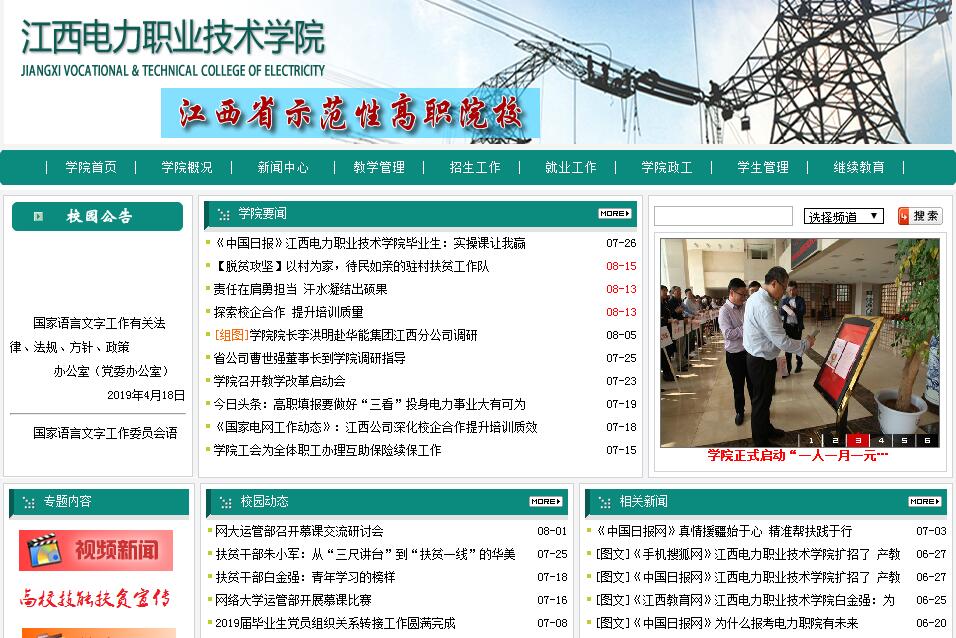 江西電力職業(yè)技術(shù)學(xué)院為江西省示范性高等職業(yè)院校,坐落在“物華天寶、人杰地靈”盛譽的歷史文化名城——南昌。學(xué)院創(chuàng)建于1958年,隸屬于國網(wǎng)江西省電力有限公司,是江西省唯一的一所公辦全日制電力類高職院校。建校六十年來,學(xué)院堅持“以服務(wù)為宗旨,以就業(yè)為導(dǎo)向,辦人民滿意教育”的辦學(xué)理念,面向全國招生,為電力行業(yè)和社會培養(yǎng)了大批管理和高技能人才,被譽為“電力高技能人才培養(yǎng)的搖籃”。校園總面積319633.3平方米,建筑總面積306164.28平方米。教學(xué)行政用房面積75981.64平方米,生均35.50平方米。學(xué)生宿舍面積74590平方米。學(xué)生宿舍11棟,建筑面積59620.93平方米,共有5476鋪位,均為4-6人間,以4人間為主,生活設(shè)施齊備。學(xué)院有著得天獨厚的校內(nèi)外實訓(xùn)條件,實訓(xùn)資源十分豐富,全省電力系統(tǒng)所有供電公司及火力、水力發(fā)電公司都是我院固定的校外實訓(xùn)基地,到目前為止學(xué)院已經(jīng)與全國1000多家企業(yè)建立了合作關(guān)系,形成了穩(wěn)固的開展校外實習(xí)實訓(xùn)教學(xué)的基礎(chǔ),合作建設(shè)校外實習(xí)實訓(xùn)基地53個。學(xué)院建有國內(nèi)首條500 kV /220 kV /110 kV超高壓混合模擬教學(xué)輸電線路。架設(shè)了10KV/0.4KV配電線路。安裝了室外臺架式教學(xué)型變壓器并配備了配套設(shè)備。建設(shè)了繼電保護和自動化實訓(xùn)基地、變電修試實訓(xùn)基地、營業(yè)用電實訓(xùn)基地、變電仿真實訓(xùn)基地,并建有PLC、電能表校驗、DCS控制系統(tǒng)、300MW、600MW火電機組、變電站仿真系統(tǒng)等一大批技術(shù)先進的實訓(xùn)室(場)。利用中央財政支持項目,學(xué)院建設(shè)了電工電子類綜合實訓(xùn)基地。2014年,由省電力公司出資約7000萬元,在校園內(nèi)建成220kV全真實訓(xùn)變電站,專門用于實訓(xùn)教學(xué),極大地改善了學(xué)院實訓(xùn)教學(xué)條件和培訓(xùn)教學(xué)實力。各基地功能齊備、性能先進、軟硬件配套齊全,覆蓋全院所有已開設(shè)專業(yè),具有真實職業(yè)氛圍,校內(nèi)實踐基地整體規(guī)模、技術(shù)水平領(lǐng)先國內(nèi)同類院校,實訓(xùn)(驗)開出率100%,既可很好地滿足學(xué)院各專業(yè)的實踐教學(xué)需求,亦能滿足行業(yè)企業(yè)職業(yè)技能培訓(xùn)的需要。學(xué)院以培養(yǎng)專業(yè)帶頭人和骨干教師為建設(shè)重點,以服務(wù)高技能電力專業(yè)人才培養(yǎng)和行業(yè)企業(yè)員工職業(yè)培訓(xùn)為要求,采取多種措施和建立激勵機制,大力推動師資隊伍建設(shè),建有一支師德高尚、業(yè)務(wù)精湛的高水平“雙師型”教師隊伍。一是全面施行專業(yè)教師“講師+高級工、副教授+技師、教授+高級技師”雙證制;二是通過統(tǒng)一組織的培訓(xùn)考核或社會化考核,教師獲得高校教師資格證和企業(yè)培訓(xùn)師證;三是組織基礎(chǔ)課教師開展系統(tǒng)化專業(yè)知識培訓(xùn),促進基礎(chǔ)課教師的專業(yè)化;四是校企合作,借助國家電網(wǎng)有限公司雄厚的企業(yè)技術(shù)平臺和專家人才庫,選派骨干教師到電力生產(chǎn)、管理一線掛職鍛煉,聘請企業(yè)專家擔(dān)任兼職教師,實行雙向掛職鍛煉培養(yǎng)。學(xué)院師資隊伍建設(shè)取得了可喜成果,共有專兼職教師258人,具有正高職稱14人,副高職稱125人,具有高級技師、技師148人,“雙師型”教師比例達90%以上,教師已有225人獲企業(yè)培訓(xùn)師資格。學(xué)院高度重視師德師風(fēng)建設(shè),組織教師深入學(xué)習(xí)領(lǐng)會《中共中央國務(wù)院關(guān)于全面深化新時代教師隊伍建設(shè)改革的意見》、《公民道德建設(shè)實施綱要》、《教育部關(guān)于進一步加強和改進師德建設(shè)的意見》、《江西省教育廳關(guān)于加強教師職業(yè)道德建設(shè)的意見》等一系列文件和法律法規(guī),制定了《教師職業(yè)道德規(guī)范》,深入開展師德教育系列活動,進一步完善師德建設(shè)長效機制,培育了愛崗敬業(yè)、從嚴治教、為人師表的良好風(fēng)氣。近年來,學(xué)院教師隊伍中涌現(xiàn)出一批思想覺悟高、業(yè)務(wù)能力強,教書育人業(yè)績突出的優(yōu)秀教師和先進教育工作者:“江西省先進工作者”2人、“江西省優(yōu)秀教學(xué)名師”3人、“江西省能工巧匠”1人、“江西省師德先進個人”1人、 “江西省中青年骨干教師”11人、“江西省教學(xué)團隊”1個、國家電網(wǎng)有限公司“十大”專業(yè)領(lǐng)軍人才2人、優(yōu)秀專家人才后備1人、江西省電力有限公司專業(yè)領(lǐng)軍人才2人、教育培訓(xùn)技術(shù)專家人才4人、專家人才后備2人。每年教師及帶隊參加全國電力職業(yè)教育教學(xué)指導(dǎo)委員會、江西省教育廳、國家電網(wǎng)有限公司及江西省電力有限公司組織的各類業(yè)務(wù)競賽均取得優(yōu)異成績,獲得多項榮譽。學(xué)院主要招收全日制普通三年制高職學(xué)生,開設(shè)有發(fā)電廠及電力系統(tǒng)、電氣自動化技術(shù)(中澳合作辦學(xué))、電力系統(tǒng)自動化技術(shù)、高壓輸配電線路施工運行與維護、供用電技術(shù)、火電廠集控運行、電廠熱能動力裝置等7個專業(yè),專業(yè)涉及電力