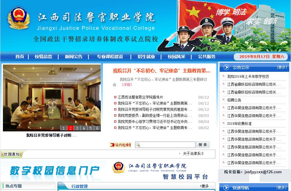 江西司法警官職業(yè)學(xué)院前身是1958年成立的江西政法學(xué)院(后分為三個學(xué)校,即江西省公安??茖W(xué)校、江西省勞改警察學(xué)校和江西省司法學(xué)校),2000年江西省司法學(xué)校和江西省司法警官學(xué)校成建制合并為江西司法警官學(xué)校,2002年4月經(jīng)省人民政府批準(zhǔn)成立江西司法警官職業(yè)學(xué)院,并保留江西省政法干校的職能,因此,2009年,被中央政法委、中央組織部、教育部等15部委確定為“全國政法干警招錄培養(yǎng)體制改革試點(diǎn)院校”。2013年5月,江西省機(jī)構(gòu)編制委員會同意學(xué)院增掛“江西省司法廳警察訓(xùn)練總隊”牌子。正所謂:大學(xué)者非大樓之謂。學(xué)院雖占地僅175畝,但校園設(shè)施完善,布局合理,綠化美化,十分宜人。學(xué)院教學(xué)科研設(shè)備完善,擁有現(xiàn)代化教學(xué)監(jiān)控系統(tǒng),建有汽車駕駛訓(xùn)練場、警務(wù)技能訓(xùn)練中心、法律職業(yè)技能實訓(xùn)中心、多媒體教室、刑偵實驗室、語音室、計算機(jī)中心、塑膠田徑場、籃球場、排球場等教學(xué)、生活配套設(shè)施,館藏圖書60余萬余冊?,F(xiàn)有在編教職工229人;現(xiàn)有在校學(xué)生7400余人。更有一支優(yōu)良的教師隊伍:有副高以上職稱資格的教師114人,有律師、會計師、心理咨詢師等“雙師型”教師86人。有江西省高等學(xué)校教學(xué)名師4名,江西省高校中青年學(xué)科帶頭人1名,江西省高校中青年骨干教師8名,2個省級教學(xué)團(tuán)隊(行政原理與實務(wù)和行政管理)。學(xué)院自升格以來,以“博學(xué)、明法、求實、創(chuàng)新”為校訓(xùn),注重內(nèi)涵建設(shè),無論專業(yè)、課程還是教學(xué)科研均有不錯的建樹:專業(yè)建設(shè):有1個教育部、財政部重點(diǎn)建設(shè)專業(yè)(書記官),有3個省級示范專業(yè)(法律事務(wù)、刑事執(zhí)行、司法警務(wù)),有5個省級特色專業(yè)(法律事務(wù)、刑事執(zhí)行、書記官、司法警務(wù)、法律文秘);有2個中央財政支持職業(yè)教育實訓(xùn)基地建設(shè)項目(刑事執(zhí)行、司法警務(wù)),1個省財政支持的實訓(xùn)基地項目(法律職業(yè)技能),有2個省級人才培養(yǎng)模式創(chuàng)新實驗區(qū)(監(jiān)獄管理、速錄)。課程建設(shè):有1門國家級精品課程(《行政法原理與實務(wù)》),7門省級精品課程(《行政法原理與實務(wù)》、《民法原理與實務(wù)》、《法律原理與技術(shù)》、《計算機(jī)應(yīng)用基礎(chǔ)》、《管理學(xué)》、《中文亞偉速錄》、《大學(xué)語文》,7門省級精品資源共享課(《行政法原理與實務(wù)》、《中文亞偉速錄》、《民法原理與實務(wù)》、《刑法原理與實務(wù)》、《思想道德修養(yǎng)與法律基礎(chǔ)》、《法律文書》、《圖形制作》),有6門司法部部級精品資源共享課程(《法律原理與技術(shù)》、《中文亞偉速錄》、《民事訴訟法原理與實務(wù)》、《證據(jù)法》、《司法警察概論》、《經(jīng)濟(jì)法原理與實務(wù)》)。教學(xué)科研:學(xué)院有1項國家級教學(xué)成果二等獎,2項省級教學(xué)成果一等獎,有1項省級優(yōu)秀教材一等獎,有2項省級教學(xué)成果二等獎。有1個國家職業(yè)技能鑒定所。警務(wù)技能方面: 2004年,在江西省武術(shù)散打錦標(biāo)賽上,獲得高校組團(tuán)體第1名;2008年,參加江西省散打錦標(biāo)賽,獲得團(tuán)體第二名,總分并列第一名;2014年,參加第十四屆省運(yùn)會,榮獲高校??平M團(tuán)體冠軍;2017年,參加全國大學(xué)生武術(shù)散打錦標(biāo)賽共取得1個冠軍、2個亞軍、1個季軍、3個第五名的好成績。速錄技能方面:近年來,學(xué)院師生代表隊在參加一系列速錄大賽中多次獲得團(tuán)體一等獎、二等獎,廖宇琴同學(xué)以652.92字/分鐘的成績打破了漢字速錄的世界紀(jì)錄,楊茗茹老師殷亮亮同學(xué)入選中國國家隊并在國際比賽中取得好成績。學(xué)院在管理方面實行嚴(yán)格的警務(wù)化管理,學(xué)生在校統(tǒng)一著人民警察服裝,高標(biāo)準(zhǔn)地培養(yǎng)學(xué)生的綜合素質(zhì)。辦學(xué)幾十年,學(xué)院向社會輸送了大量具有較高素質(zhì)的法律人才,畢業(yè)生就業(yè)率在全省高校中居于前列,每年考取公務(wù)員的人數(shù)在全省高職院校名列前茅,畢業(yè)生遍布全省各公、檢、法、司等部門,已有大批成為單位的業(yè)務(wù)骨干,不少還走向了領(lǐng)導(dǎo)崗位,并涌現(xiàn)了張獻(xiàn)、李文華等英雄人物。2014年,黨的十八屆四中全會就全面推進(jìn)依法治國作出重大決策部署,開啟了法治中國建設(shè)的新征程。黨的十八屆四中全會《決定》指出,要創(chuàng)新法治人才培養(yǎng)機(jī)制。省委《關(guān)于全面推進(jìn)法治江西建設(shè)的意見》,也對“提高法治人才培養(yǎng)水平”提出了明確要求。在全面推進(jìn)法治江西建設(shè)、提高法治人才培養(yǎng)水平方面,學(xué)院擔(dān)負(fù)著重要的歷史使命。當(dāng)前,學(xué)院領(lǐng)導(dǎo)班子將遵循教育規(guī)律,推進(jìn)各項改革,強(qiáng)化內(nèi)部管理,改善辦學(xué)條件,突出內(nèi)涵建設(shè),提高辦學(xué)水平,培養(yǎng)優(yōu)秀人才,努力把學(xué)院建設(shè)成為“江西有地位、全國有影響、專業(yè)有特色、學(xué)生有出