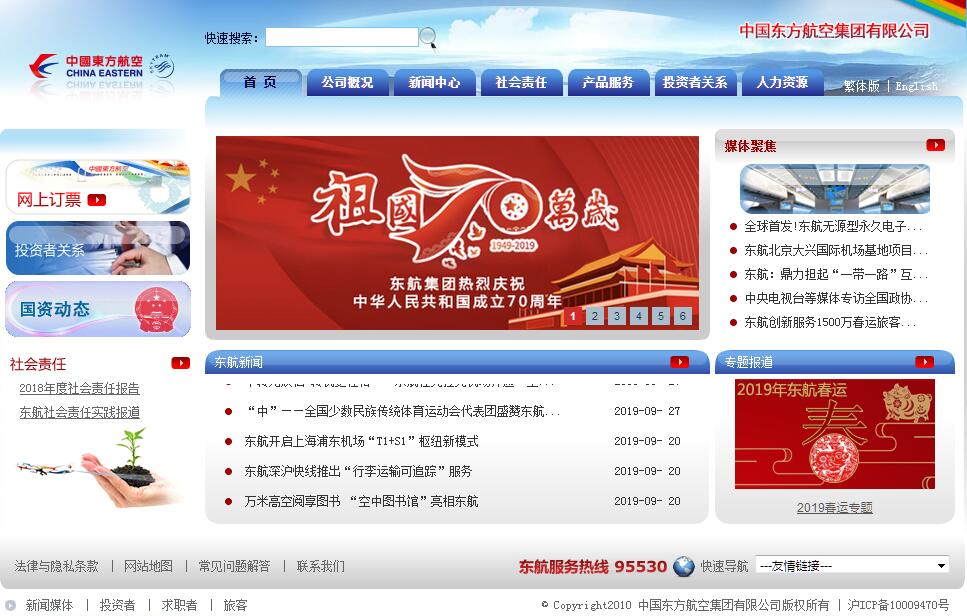 中國東方航空集團有限公司總部位于上海,是我國三大國有骨干航空運輸集團之一,前身可追溯到1957年1月上海成立的第一支飛行中隊。截至2017年底,東航集團總資產超過2760億元,形成以航空客運為核心主業(yè),以航空物流、航空金融、航空地產、航空食品、融資租賃、進出口貿易、航空傳媒、實業(yè)發(fā)展、產業(yè)投資等為相關協(xié)同產業(yè)的“1+9”現(xiàn)代航空服務集成體系。作為集團核心主業(yè)的中國東方航空股份有限公司,1997年成為首家在紐約、香港、上海三地上市的中國航企。借助天合聯(lián)盟,東航構建起以上海為核心樞紐、通達全球177個國家1074個目的地的航線網絡,年旅客運輸量超過1.1億人,位列全球第七, “東方萬里行”常旅客可享受天合聯(lián)盟20家航空公司的會員權益及全球超過600間機場貴賓室。公司運營著超過650架、平均機齡5.39年的全球最年輕大型機隊,擁有中國規(guī)模最大、商業(yè)和技術模式領先的75架互聯(lián)網寬體機隊,在中國民航首家開放手機等便攜式設備使用。東航致力于以精致、精準、精細服務為全球旅客創(chuàng)造精彩旅行體驗,近年來榮獲中國民航飛行安全最高獎——“飛行安全鉆石獎”,連續(xù)7年獲評全球品牌傳播集團WPP“最具價值中國品牌”前50強,連續(xù)3年入選品牌評級機構Brand Finance“全球品牌價值500強”,在運營品質、服務體驗、社會責任等領域屢獲國際國內殊榮。