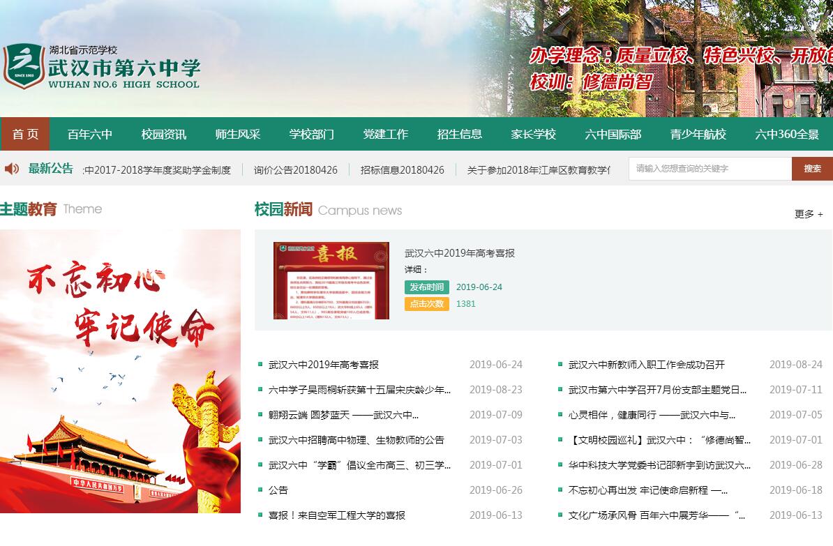 武漢六中位于漢口球場路64號,其前身是1903年由德國人創(chuàng)辦的德華學堂。近年來,學校秉承“修德尚智”的校訓,遵循 “質量立校、特色興校、開放包容、追求卓越”的辦學理念,深入研究辦學規(guī)律,頂層設計學校發(fā)展,不斷提升辦學品位、辦學層次,先后被評為“全國科研興校示范基地”、“全國百強特色學校”、“全國信息技術創(chuàng)新與實踐活動先進單位”、“全國勤工儉學先進單位”、“全國貫徹學校體育衛(wèi)生條例先進學?!?、“國家體育項目傳統(tǒng)學?!?、“全國創(chuàng)新名?!薄ⅰ爸袊嗌倌晁刭|教育實踐研究基地”、“全國中小學知識產權教育試點學校”、“全國創(chuàng)新名校聯(lián)盟成員單位”、“宋慶齡少年兒童科技發(fā)明示范基地”、“全國首批優(yōu)秀財經(jīng)素養(yǎng)教育基地”、“全國七所中學共青團改革直接聯(lián)系示范學校之一”、“湖北省示范學校”、“湖北省最佳文明單位”。教師團隊精英云集。學校師資雄厚,通過“制度創(chuàng)新工程”、“骨干培養(yǎng)工程”、“師德建設工程”打造了一大批觀念創(chuàng)新、業(yè)務精湛、甘于奉獻、業(yè)績突出的專家型教師,先后有18人被授予省特級教師稱號,1人被評為武漢市首批“十大名師”,10余人享受國務院及省、市政府津貼,20余人獲省、市優(yōu)秀中青年專家榮譽稱號,15人獲國家級、省級骨干教師榮譽稱號,學校共有市、區(qū)學科帶頭人75人,市、區(qū)優(yōu)秀青年教師91人。六中教師在國家級、省、市級刊物上發(fā)表論文兩千余篇,出版專著幾千萬字。資優(yōu)學生碩果累累。近年來,武漢六中教育教學成績斐然,涌現(xiàn)出一批頂尖級人才,獲得國際奧林匹克競賽金牌的夏煜、賀卓然及銅牌的段志勇,獲得中國數(shù)學奧林匹克競賽一等獎的顏公旺、獲得全省文、理狀元稱號的黃明、余慶、丁捷,獲得全市理科狀元稱號的牟陟、彭維方等都是六中學生的優(yōu)秀代表。每年均有大量學生在全國數(shù)學、物理、化學、生物、信息學、英語、地理競賽中獲獎,連續(xù)多屆楚材作文競賽特等獎獲得者均是六中學生。學校省級理科實驗班高考成績突出,多次被媒體稱為湖北省“最牛班”,每年高考均有多名學生進入省、市前十名,多年以來600分以上的學生人數(shù)穩(wěn)居全市前列,為國內名校清華、北大、人大、復旦等輸送了大量人才,十余名學生被中科大少年班錄取,累計錄取人數(shù)位居全省第一。 藍天雛鷹六中啟航。2011年,經(jīng)空軍政治部批準,華中地區(qū)唯一的飛行員早期培訓基地落戶我校,對外稱空軍武漢飛行少年軍校。2015年,在空軍擴點建設中,更名為空軍青少年航空學校。中國人民解放軍空軍政治部領導及省市相關領導隆重出席了飛行基地班揭牌儀式。在軍地雙方的共同努力下,幾年來,空飛軍校即實現(xiàn)了招收的學員不僅身體素質優(yōu)良,而且學習成績優(yōu)異的飛躍,為打造現(xiàn)代化的空軍,真正實現(xiàn)空天一體、攻防兼?zhèn)涞膰朗聵I(yè)做出了積極貢獻。迄今為止近70名空飛班學員光榮成為空軍航空大學飛行學員,其中3人入選空軍與清華大學、北京大學合作開辦的飛行員班,六中空飛班的辦學模式和成績示范全軍,被譽為“全國最??诊w班”。中央電視臺、人民日報、解放軍報等多次作過專題報道。2017年,六中空飛班榮獲“武漢市工人先鋒號”稱號。開放辦學成績卓著。2012年,武漢六中與著名美國教育集團合作,引入美國高中課程及其他優(yōu)質國際教育資源,開設湖北省首個中美雙文憑直升班,實行半軍事化管理,培養(yǎng)具有國際視野的中國公民和具有中國情懷的世界公民。六中國際部已成為美國官方認證的湖北省公辦學校中唯一的AP教學中心,是中國教育部國際交流協(xié)會中學分會湖北省唯一理事單位,也是小托福考點。國際部專任教師中,海外學歷教師12人、畢業(yè)于國內985重點院校11人、碩士學歷教師28人。美方學術校長畢業(yè)于美國傳奇名校深泉學院、康奈爾大學,曾任SOHO中國總裁行政助理。國際化教育在六中已成為中國基礎教育改革的試驗田,在全國率先實施走班制、選課制,其課程涵蓋茶藝國學、琴棋書畫、馬術、高爾夫、青年MBA等,真正實現(xiàn)了中西合璧。武漢六中國際部每年被世界排名前50名大學錄取的學生多達80%,被世界排名前30大學錄取的學生占30%,越來越多的國際部學生被英國劍橋大學、倫敦大學、美國哥倫比亞大學、麻省理工學院等英美澳加世界百強大學以高額獎學金錄取,每名國際部畢業(yè)生平均獲得十余份世界知名大學錄取通知書,超過一半的畢業(yè)生年均獲得1-3萬美元獎學金,刷新了湖北學生赴美留學本科階段獲獎學金的歷史??萍冀逃I跑全國。學校將創(chuàng)新教育納入常規(guī)教學,編寫《智慧之光——我們的小發(fā)明》、《發(fā)明創(chuàng)新與設計》、《防災救護》等5本校本教材,指導學生編撰并出版了十余期《六中科技報》和一本《智慧之光——學生學術論文集》。帶領學生走進醫(yī)院、走進社區(qū),在生活的實踐中開鑿智慧的火花。迄今為止我校申請國家發(fā)明專利及實用新型專利5000余項,是名符其實的“全國專利第一?!?。我校學生先后獲國際發(fā)明大賽金獎、銀獎、銅獎40余項,參加全國青少年科技創(chuàng)新大