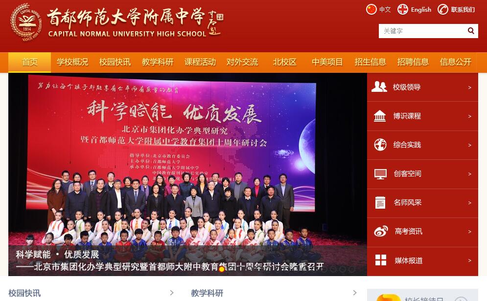首都師大附中坐落在京西古道的起點阜外八里莊,與慈壽寺永安萬壽塔(明萬歷四年建)為鄰,同碧波蕩漾的昆玉河相伴。昆玉河“秀甲京城”,給首師大附中注入了睿智的靈動 ,帶來了勃勃生機;慈壽寺塔“輝騰日月”,為首師大附中平添了歷史的厚重,見證了赫赫功績。鐘靈毓秀,人杰地靈,一百年來,首師大附中培養(yǎng)的英才數(shù)以萬計,遍布海內(nèi)外,他們都在各自的領(lǐng)域取得了卓越的成績,可以這樣說,首師大附中是社會中堅成長的沃土,是培育祖國棟梁的搖籃。首師大附中始建于1914年,由北洋政府陸軍部次長、西北籌邊使兼西北邊防軍總司令徐樹錚創(chuàng)辦,始命名為正志中學(xué)。新疆布政使王樹楠、北平首任市長何其鞏、中華民國首任教育總長蔡元培、北洋政府教育總長傅曾湘、交通總長葉公綽、財政總長吳鼎昌以及周作民、朱光潛、焦菊隱、齊思和等,均曾擔(dān)任過學(xué)校董事長或校長。學(xué)校后因種種歷史原因先后更名為成達中學(xué)、第三十八中學(xué)、第四十二中學(xué)、北京師范學(xué)院附屬中學(xué)。1992年更名為首都師范大學(xué)附屬中學(xué),接受北京市教委和首都師范大學(xué)的雙重領(lǐng)導(dǎo),是北京市首批市級重點中學(xué)和示范性高中校。首師大附中秉承北平首任市長何其鞏先生“成徳達才”的育人理念,恪守“自覺、勤奮、求實、創(chuàng)新”的校訓(xùn),在將近一百年的辦學(xué)歷程中,經(jīng)過一代代附中人的不懈努力,抓住了一次次難得的歷史機遇,取得了一個又一個驕人的成績。1978年,中國迎來了教育的春天,首師大附中作為高等師范院校的教育科研和教育實習(xí)基地,憑借其一流的師資隊伍、一流的教學(xué)水平和一流的教學(xué)成績,輕而易舉地摘取了北京市首批重點中學(xué)的桂冠。進入到九十年代,我國開始全面實施素質(zhì)教育,首師大附中在取得已有成績的基礎(chǔ)上,不斷深化教育教學(xué)改革,在推進素質(zhì)教育的征途中取得了長足發(fā)展,受到黨和國家領(lǐng)導(dǎo)人的高度重視。2002年,北京市教委為了落實《北京市人民政府貫徹國務(wù)院關(guān)于基礎(chǔ)教育改革與發(fā)展決定的意見》,在全市范圍內(nèi)展開了高中示范校評選工作,首師大附中憑借其驕人的教育教學(xué)成績和在國內(nèi)外的廣泛影響,在眾多參評學(xué)校中脫穎而出,被首批認定為北京市示范性高中校。2007年,北京市開始全面實施課程改革,首師大附中又憑借其深厚的文化底蘊、頂尖的師資隊伍、先進的管理理念和豐富的辦學(xué)經(jīng)驗成為北京市課程改革的領(lǐng)跑者,被人事部、教育部授予“全國教育系統(tǒng)先進集體”光榮稱號。2011年,首師大附中又進入到了一個難得的發(fā)展機遇期,教育教學(xué)專家、數(shù)學(xué)特級教師沈杰校長憑借其敏銳的頭腦、開闊的視野、淵博的學(xué)識、學(xué)者的氣質(zhì)和人格的魅力,讓社會各界對首師大附中有了更高的期望。沈校長秉承“人本、和諧、創(chuàng)新”的管理理念,堅守“愛國、科學(xué)、人文”的教育理念,把對“人”的培養(yǎng)作為教育的終極目標(biāo),因材施教,努力提升學(xué)生的精神素養(yǎng),培育厚德博學(xué)的創(chuàng)新人才。目前,精誠團結(jié)、銳意進取的附中人在沈校長的率領(lǐng)下,已經(jīng)拉開了首都師大附中百年校慶的序幕,以“百年樹人、成徳達才、薪火相傳、再鑄輝煌”為主題,決心三年跨越三大步——打造精品課程,建造精致校園,培養(yǎng)精英人才,實現(xiàn)“國內(nèi)領(lǐng)先、國際一流”的辦學(xué)目標(biāo),為100周年校慶獻禮。