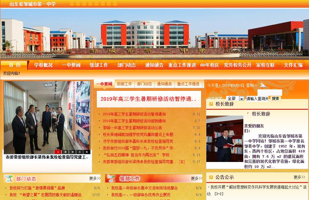 鄒城一中始建于1952年10月,原名鄒縣中學(xué),歷經(jīng)三遷,2001年,新校區(qū)遷至現(xiàn)新址—鄒城市東城新區(qū)太平東路1868號。學(xué)?,F(xiàn)分為南北兩個(gè)校區(qū),占地總面積410畝,擁有7.6萬平方米的建筑面積和完善的現(xiàn)代化教學(xué)設(shè)施,綠化面積約10萬平方米?,F(xiàn)有123個(gè)教學(xué)班,在校學(xué)生6456名。建校59年來,學(xué)校擁有國家級、省市級模范教師、優(yōu)秀教師、特級教師、拔尖人才36人;高、中級教師238人,中青年專家、杏壇名師、“十佳”教師、市級以上骨干教師、學(xué)科帶頭人、教學(xué)能手69人。一代代名師弘文勵教,培養(yǎng)了三萬多名合格畢業(yè)生,數(shù)以萬計(jì)的優(yōu)秀學(xué)子成為國家棟梁,近幾年教育質(zhì)量不斷跨越增長,成為濟(jì)寧市教育教學(xué)工作先進(jìn)學(xué)校和優(yōu)秀生培養(yǎng)、藝體生培養(yǎng)先進(jìn)學(xué)校。靜謐優(yōu)雅的校園環(huán)境,精美獨(dú)特的建筑設(shè)計(jì),現(xiàn)代一流的教育教學(xué)裝備,人文科學(xué)的學(xué)校管理,為鄒城一中全面實(shí)施素質(zhì)教育,創(chuàng)建全國家知名高中奠定了基礎(chǔ)。學(xué)校以素質(zhì)教育為主線,抓住新課程改革機(jī)遇,依據(jù)多元智能理論,大力推進(jìn)實(shí)施素質(zhì)教育;以教師專業(yè)發(fā)展為主抓手,深入開展“新理念、新課程、新技術(shù)”教師培訓(xùn),建設(shè)具有特色的教師文化,想方設(shè)法提供平臺促進(jìn)教師專業(yè)發(fā)展,培養(yǎng)一批學(xué)者型、創(chuàng)新型名師;先后投入巨資,加強(qiáng)教育技術(shù)裝備建設(shè),專任教師每人一臺筆記本電腦,裝備了5口數(shù)字化實(shí)驗(yàn)室和120多口多媒體教室,建成了多網(wǎng)合一的現(xiàn)代校園網(wǎng),實(shí)現(xiàn)了學(xué)校教學(xué)、管理、辦公等信息交流網(wǎng)絡(luò)化管理、多媒體教學(xué)班班通目標(biāo)。以課堂改革為突破口,注重發(fā)揮學(xué)生的主體作用,實(shí)行“自主學(xué)習(xí)、合作探究”的教學(xué)模式,實(shí)現(xiàn)課堂三維目標(biāo)。加強(qiáng)學(xué)校文化建設(shè),注重發(fā)揮孔孟故里思想文化教育的優(yōu)勢,在實(shí)踐中積淀特色文化;依據(jù)當(dāng)今世界文化碰撞、優(yōu)秀文化相融相通的趨勢,建設(shè)民主科學(xué)的校園文化,塑造具有傳統(tǒng)美德、現(xiàn)代文明習(xí)慣、“博愛、博學(xué)、博雅、博才”的學(xué)生和“有思想、有專長”施教有方的教師。針對嚴(yán)峻的競爭與挑戰(zhàn),學(xué)校以民主管理為動力,實(shí)施“質(zhì)量立校、科研強(qiáng)校、特色興?!钡陌l(fā)展戰(zhàn)略, “單項(xiàng)工作爭第一,總體工作創(chuàng)一流”,堅(jiān)持依法治校,以德治校,規(guī)范管理,人本管理,把學(xué)校事業(yè)發(fā)展和師生充分全面發(fā)展結(jié)合起來,構(gòu)建以人為本的校本管理模式,實(shí)現(xiàn)“教師、學(xué)生、學(xué)校三者一體提升,全面和諧持續(xù)發(fā)展”的管理目標(biāo),促進(jìn)學(xué)校發(fā)展提速增效,鑄就了“天下為己任,規(guī)矩成方圓”的校訓(xùn)、“崇尚科學(xué)、追求卓越”的校風(fēng)。伴隨著推進(jìn)實(shí)施素質(zhì)教育,鄒城一中站在歷史的新起點(diǎn),全校團(tuán)結(jié)實(shí)干,科學(xué)發(fā)展,努力把鄒城一中建設(shè)成為和諧一中、民主一中、陽光一中、生態(tài)一中、法制一中、嚴(yán)謹(jǐn)一中、高雅一中、愛心一中、高效一中、專家一中、卓越一中、幸福一中,全社會人民滿意的一中。學(xué)校作為山東省規(guī)范化學(xué)校,是全國高級中學(xué)校長委員會會員學(xué)校、山東大學(xué)優(yōu)秀人才輸送基地、第19屆全國物理奧賽金牌學(xué)校,先后獲山東省文明單位、山東省教書育人先進(jìn)單位、山東省德育工作先進(jìn)集體、山東省田徑傳統(tǒng)項(xiàng)目學(xué)校、山東省綠色學(xué)校、山東省依法治校示范校、山東省校務(wù)公開民主管理先進(jìn)單位、山東省食品衛(wèi)生A級單位、山東省教學(xué)示范學(xué)校等殊榮,并與國內(nèi)外友好學(xué)校建立了廣泛的聯(lián)系和交流。