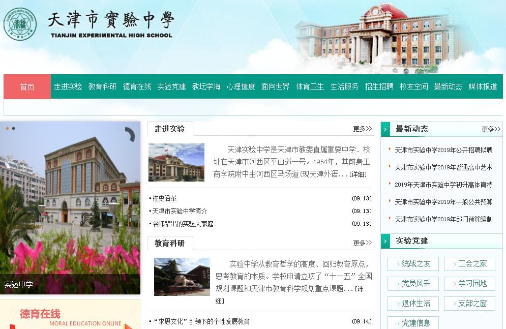 天津市實驗中學(xué)是一所具有90余年歷史的老校。創(chuàng)建于1923年,前身是由法國天主教耶穌教會創(chuàng)辦的天津市工商學(xué)院附屬中學(xué),是天津市一所知名的老校。1954年遷入現(xiàn)址天津市河西區(qū)平山道一號。1981年改名為天津市實驗中學(xué),是天津市教育委員會直屬重點中學(xué)之一。學(xué)校始終繼承著“敬業(yè)、愛生、嚴謹、探求”的教風(fēng)和“勤學(xué)、善問、博聞、務(wù)實”的學(xué)風(fēng),為祖國培養(yǎng)了大批棟梁人才,如世界著名核物理學(xué)家袁家騮博士、著名紅學(xué)專家周汝昌、藝術(shù)家沈湘、歌唱家婁乾貴、中國工程院院士著名醫(yī)學(xué)家石學(xué)敏、中國工程院院士郭應(yīng)祿以及現(xiàn)任國務(wù)院新聞辦公室主任趙啟正、體操運動健將鮑乃健、世界網(wǎng)壇冠軍劉樹華等,被譽為“津門名校、沽上之光”。 學(xué)校把“為學(xué)生終身發(fā)展奠基”作為辦學(xué)理念,大膽探索,1998年在天津市政府、市教委的支持下,率先進行示范校建設(shè),至今已形成占地約7公頃、總建筑面積80000平方米的規(guī)模。學(xué)校擁有國內(nèi)一流的數(shù)字網(wǎng)絡(luò)教學(xué)系統(tǒng)、多媒體閉路電視教學(xué)系統(tǒng)、電子政務(wù)辦公系統(tǒng);擁有數(shù)字圖書館庫和藏書15萬余冊的圖書館、多功能數(shù)字演播廳、各類多媒體專用教室和先進的理化生實驗室、創(chuàng)新實驗室、心理健康服務(wù)中心;擁有設(shè)計人性化、設(shè)備現(xiàn)代化的普通教室;擁有10000多平方米的體育藝術(shù)館和鋪有塑膠跑道、人工草皮的室外田徑場。校園環(huán)境優(yōu)美、高雅,為培養(yǎng)個性特長突出且全面發(fā)展的合格人才提供了堅實的基礎(chǔ)。 為實現(xiàn)“為學(xué)生終身發(fā)展奠基”的辦學(xué)理念,實驗中學(xué)不斷錘煉教師隊伍。截至2014年,擁有分布在6個學(xué)科的12名特級教師,有已獲得或正在攻讀碩士學(xué)位的教師87名,有研究生課程班畢業(yè)的教師90余位。有市級學(xué)科帶頭人12名。擁有市十佳青年教師5人,市十佳班主任3名,有全國優(yōu)秀教師2名。1994年成立了以著名數(shù)學(xué)特級教師王連笑為首的數(shù)學(xué)奧林匹克教練組,經(jīng)中國數(shù)學(xué)奧委會評定,現(xiàn)有高級教練員2名、一級教練員6名、二級教練員4名,名列天津市之首,其實力在全國的中學(xué)處于領(lǐng)先地位,數(shù)學(xué)組還被評為全國勞動模范先進集體、天津市“工人先鋒號”。為培養(yǎng)個性特長突出且全面發(fā)展的合格人才提供了雄厚的師資力量。為實現(xiàn)“為學(xué)生終身發(fā)展奠基”的辦學(xué)理念,學(xué)校不斷探索素質(zhì)教育模式,設(shè)立有數(shù)學(xué)、英語、藝術(shù)特長班,中新合作雙語班、IB國際文憑項目實驗班;組建有全市較高水平的各類學(xué)生藝術(shù)社團10余個;開設(shè)有種類繁多、內(nèi)容新穎的活動課、選修課近百項,為培養(yǎng)個性特長突出且全面發(fā)展的合格人才創(chuàng)設(shè)了豐厚的物質(zhì)環(huán)境。共有11人進入中國數(shù)學(xué)奧林匹克冬令營,90余人被北京大學(xué)、清華大學(xué)、浙江大學(xué)、上海交通大學(xué)、南開大學(xué)、天津大學(xué)等全國名牌高校提前保送錄取,400余人通過大學(xué)英語四級考試,在全國數(shù)學(xué)、物理、化學(xué)、生物、計算機 等奧林匹克競賽中一等獎獲獎總?cè)藬?shù)始終位于全市前列。2011年后,高考本科一次上線率達100%,重點大學(xué)上線率達95%以上。同時還培養(yǎng)了大批富有專長的體育、藝術(shù)、科技人才,先后被北京大學(xué)、人民大學(xué)、浙江大學(xué)、中山大學(xué)、天津大學(xué)、南開大學(xué)等著名高校破格錄取。 為實現(xiàn)“為學(xué)生終身發(fā)展奠基”的辦學(xué)理念,向國際一流水平學(xué)校邁進,在全市最先成立了國際部,至今已與26個國家和地區(qū)的29所學(xué)校建立了友好關(guān)系,每年有十幾位教師和百余名學(xué)生出國學(xué)習(xí)訪問。曾成功舉辦了三屆國際教育論壇,并創(chuàng)辦了對外漢語教學(xué)“泰國分?!?,為培養(yǎng)新世紀全面發(fā)展的合格人才搭建了通向世界的平臺。 實驗中學(xué)正朝著建設(shè)“高質(zhì)量、有特色、開放型、現(xiàn)代化、國內(nèi)一流、國際知名的優(yōu)質(zhì)名牌中學(xué)”的宏偉目標,大步前進。