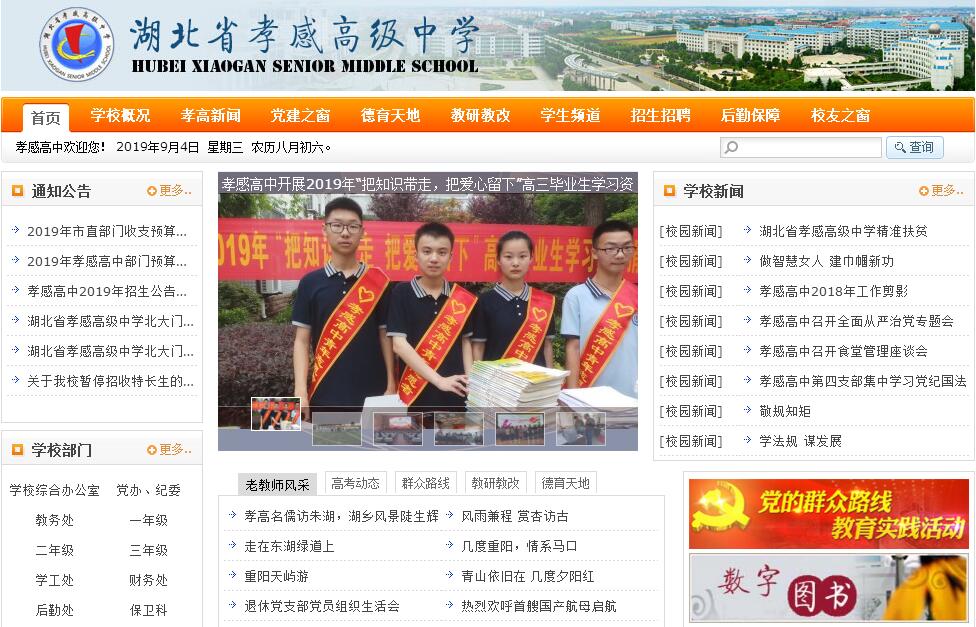 湖北省孝感高中位于湖北省孝感市,解放初期就是省級重點中學(xué),是湖北省示范學(xué)校、湖北省教育科學(xué)研究實驗中學(xué),湖北八校聯(lián)考成員。學(xué)校成立于1946年,1978年恢復(fù)重建,1998年被湖北省政府教育督導(dǎo)室評為“省級示范學(xué)?!薄?002年9月,整體搬遷至交通西路。截至2011年5月,學(xué)校占地300畝,建筑面積10萬余平方米,共有在崗教職工386人,在校學(xué)生6000人,開辦90個教學(xué)班,專職教師306人。截至2015年1月,學(xué)校每個教室配有空調(diào)、多媒體設(shè)備,擁有各種學(xué)生活動室、功能室;學(xué)校建有學(xué)生宿舍4棟、學(xué)生公寓4人一間,普通宿舍6-8人,均配有書桌、書櫥、盥洗間、空調(diào)、熱水器等設(shè)施。截至2013年10月,學(xué)校圖書館建筑面積2000多平方米,館內(nèi)除設(shè)有基藏書庫、外借書庫、學(xué)生閱覽室、教工閱覽室、過刊資料室、相關(guān)管理室等成龍配套的功能庫室,館外還交叉配有電子閱覽室、教材室等。共有紙質(zhì)圖書62000余冊、電子圖書50萬冊、報刊雜志160多種,各閱覽室(含電子閱覽室)座位總計520個。每年還新增紙質(zhì)圖書生均超1冊。2016年高考,普通文理科過一本線人數(shù)共計1092人。其中理科過一本線1006人,文科過一本線86人;600分以上411人;獲孝感市文理狀元;同時,孝感市理科前十名占9名,文科前十名占7名。2010年,在全國高中數(shù)學(xué)競賽中,1名學(xué)生獲得全國一等獎、10名同學(xué)獲全國二等獎、7名同學(xué)獲全國三等獎。在孝感市首屆中小學(xué)生作文擂臺賽中,7名同學(xué)獲一等獎、5名同學(xué)獲二等獎、4名同學(xué)獲三等獎。1名學(xué)生湖北省第三屆中學(xué)生英語口語競賽中獲高二組一等獎。在2010年全國高中化學(xué)競賽中1名學(xué)生獲全國一等獎、6名同學(xué)獲全國二等獎、2名同學(xué)獲全國三等獎。在2010年全國中學(xué)生生物聯(lián)賽中,2名同學(xué)獲全國二等獎、6名同學(xué)獲全國三等獎。在2010年全國中學(xué)生地理奧林匹克競賽中,4名同學(xué)獲省一等獎、2名同學(xué)獲省二等獎。在2010年全國信息學(xué)奧林匹克競賽中,1名學(xué)生獲全國一等獎。2名學(xué)生獲第25屆湖北省青少年科技創(chuàng)新大賽青少年科技創(chuàng)新成果一等獎。2014年5月,4名教師參加市“課內(nèi)比教學(xué)”比武活動獲一等獎。6月28-30日,學(xué)校承擔(dān)的教育部課程教材研究所“十二五”規(guī)劃重點課題高中子課題《新課程高中化學(xué)教科書實驗改進(jìn)的研究》取得成果29件,獲得省級獎項5項,經(jīng)課題鑒定小組研究鑒定,認(rèn)為學(xué)?;瘜W(xué)課題成果達(dá)到一級水平。