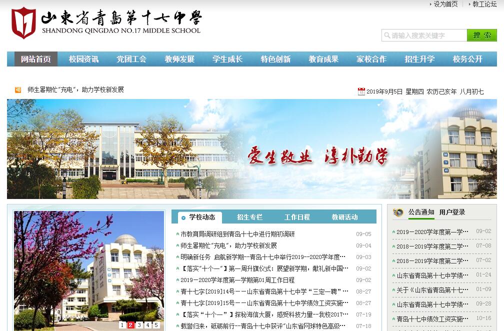 山東省青島第十七中學(xué)是一所全日制普通高中,創(chuàng)建于1954年,1961年被評為省重點(diǎn)中學(xué),1996年被評為省規(guī)范化學(xué)校,是青島市最早的對外開放學(xué)校。學(xué)校先后獲得“教育部中小學(xué)校長培訓(xùn)項(xiàng)目基地”、“教育部普通高中特色建設(shè)項(xiàng)目學(xué)?!薄ⅰ吧綎|省教書育人先進(jìn)單位”、“山東省藝術(shù)教育示范學(xué)校”、“山東省職業(yè)道德先進(jìn)單位”“山東省五.四紅旗團(tuán)委”、“山東省花園式學(xué)?!?、山東省文明單位、山東省“富民興魯勞動獎狀”、山東省“推行協(xié)商民主、強(qiáng)化社會責(zé)任”示范單位、山東省教育信息化示范單位、“山東省餐飲安全示范學(xué)校食堂”、青島市普通高中特色辦學(xué)項(xiàng)目先進(jìn)學(xué)校、青島市事業(yè)單位人事管理示范點(diǎn)、青島市“文明校園”、青島市“雷鋒學(xué)?!?、清華大學(xué)“生源基地實(shí)驗(yàn)學(xué)?!?、“青島市文明單位標(biāo)兵”、“青島市先進(jìn)基層黨組織”、“青島市教科研先進(jìn)單位”、“青島市德育工作先進(jìn)單位”、“青島市職工職業(yè)道德建設(shè)十佳單位”、 “青島市教科研先進(jìn)單位” 、“青島市中小學(xué)校本培訓(xùn)示范學(xué)?!薄⑶鄭u市績效考核優(yōu)秀等級學(xué)校等四百余項(xiàng)市級以上各級各類榮譽(yù)稱號。學(xué)校占地42500平米,建筑面積20733平米,綠化面積逾10000平方米,風(fēng)景秀麗,環(huán)境優(yōu)美,是市區(qū)著名的花園式學(xué)校?,F(xiàn)代化的教學(xué)樓、實(shí)驗(yàn)樓、綜合樓、宿舍樓、餐廳樓、藝術(shù)樓、圖書館及電視臺、天文臺、閱覽室、錄像教室、微機(jī)教室、舞蹈教室、語音教室、地理教室、歷史教室、機(jī)器人教室等專用教室,整飭一新的塑膠跑道、體育館、籃球場、足球場,為同學(xué)們提供了舒適的學(xué)習(xí)和活動場所。教學(xué)設(shè)備全面更新,“班班通”、校園網(wǎng)、電子白板、智慧課堂等,課堂教學(xué)與網(wǎng)絡(luò)資源、現(xiàn)代化技術(shù)裝備有機(jī)整合,課堂效率大幅提高。進(jìn)入新世紀(jì)特別是學(xué)校首批實(shí)施新課程改革以來,學(xué)校認(rèn)真貫徹落實(shí)國家教育方針,秉承傳統(tǒng)優(yōu)勢,樹立“遵循規(guī)律,以教育家情懷辦學(xué)育人”的理念,進(jìn)一步更新教育觀念,堅(jiān)持內(nèi)涵發(fā)展、特色發(fā)展,辦學(xué)條件、師資隊(duì)伍、課程建設(shè)、評價機(jī)制有了長足進(jìn)步,學(xué)校辦學(xué)得到市教育局、社會各界和廣大學(xué)生家長的高度認(rèn)可。以美育人、求真求善”的學(xué)校文化、特色課程體系和育人模式,美育特色凸顯。學(xué)?!案2手旅靼唷薄ⅰ案2拾唷币詢?yōu)質(zhì)的教育教學(xué)質(zhì)量贏得政府和社會各界的關(guān)心和支持,成為自強(qiáng)不息、報(bào)國為民的品牌,成為學(xué)校德育工作的寶貴資源,成為享譽(yù)島城的優(yōu)質(zhì)教育品牌。學(xué)校建立完善、科學(xué)的美術(shù)課程體系和教育模式,美術(shù)班辦學(xué)走上“精品化、高水平”的發(fā)展道路,培養(yǎng)了大批“德藝雙馨”的美術(shù)專門人才,成為在全省乃至全國享有很高聲譽(yù)的美術(shù)專業(yè)“精品屋”。2015年,學(xué)校依托理科傳統(tǒng)師資和教學(xué)優(yōu)勢,借助高校資源,招收“未來卓越工程師”理科實(shí)驗(yàn)班,讓有志于此的學(xué)生提早規(guī)劃,并享受先進(jìn)的教學(xué)資源,增強(qiáng)合作探究能力,為未來科學(xué)之路發(fā)展奠定雄厚的基礎(chǔ)。2016年起學(xué)校開設(shè)福彩自招班,繼續(xù)拓展福彩班文化內(nèi)涵。學(xué)校深化“理工見長、美育突出、和諧發(fā)展”辦學(xué)特色,依托生涯規(guī)劃課程建設(shè),最早在島城開展與高校聯(lián)合育人的探索與實(shí)踐研究,借助高校在科研和教育資源上的領(lǐng)先優(yōu)勢,突破了現(xiàn)有制度對人才培養(yǎng)模式的束縛,改革了普高育人模式,助推了學(xué)生綜合素質(zhì)的提升以及學(xué)生個性化、特色化的發(fā)展,有力拓寬了學(xué)校拔尖創(chuàng)新人才的培養(yǎng)。2012年,學(xué)校與青島理工大學(xué)正式簽訂聯(lián)合育人項(xiàng)目協(xié)議,以校本課程開發(fā)為核心,進(jìn)一步探索在課程設(shè)置、師資配置、學(xué)生綜合素質(zhì)評價等方面的合作。2016年,學(xué)校進(jìn)一步加大聯(lián)合育人合作力度,與青島科技大學(xué)材料科學(xué)與工程學(xué)院簽署《“未來工程師”合作培養(yǎng)計(jì)劃協(xié)議書》。2015年底《普通高中與高校聯(lián)合育人實(shí)踐研究》課題正式申報(bào)“十二五”全國教育科學(xué)規(guī)劃課題并順利獲批。學(xué)校充分挖掘和利用高校資源,與中國海洋大學(xué)、中車集團(tuán)、海爾、海信、阿里巴巴青島總部、青島水務(wù)集團(tuán)等名校名企簽訂了11個實(shí)踐基地,為學(xué)生提供了豐富的實(shí)踐資源與研究課題,促進(jìn)了學(xué)生的個性發(fā)展、主動發(fā)展和優(yōu)勢發(fā)展。學(xué)校深化與全國學(xué)校的合作,與全國范圍內(nèi)理工特色高中共建理工特色聯(lián)盟。目前,已與西安交大附中、上海同濟(jì)大學(xué)二附中、
