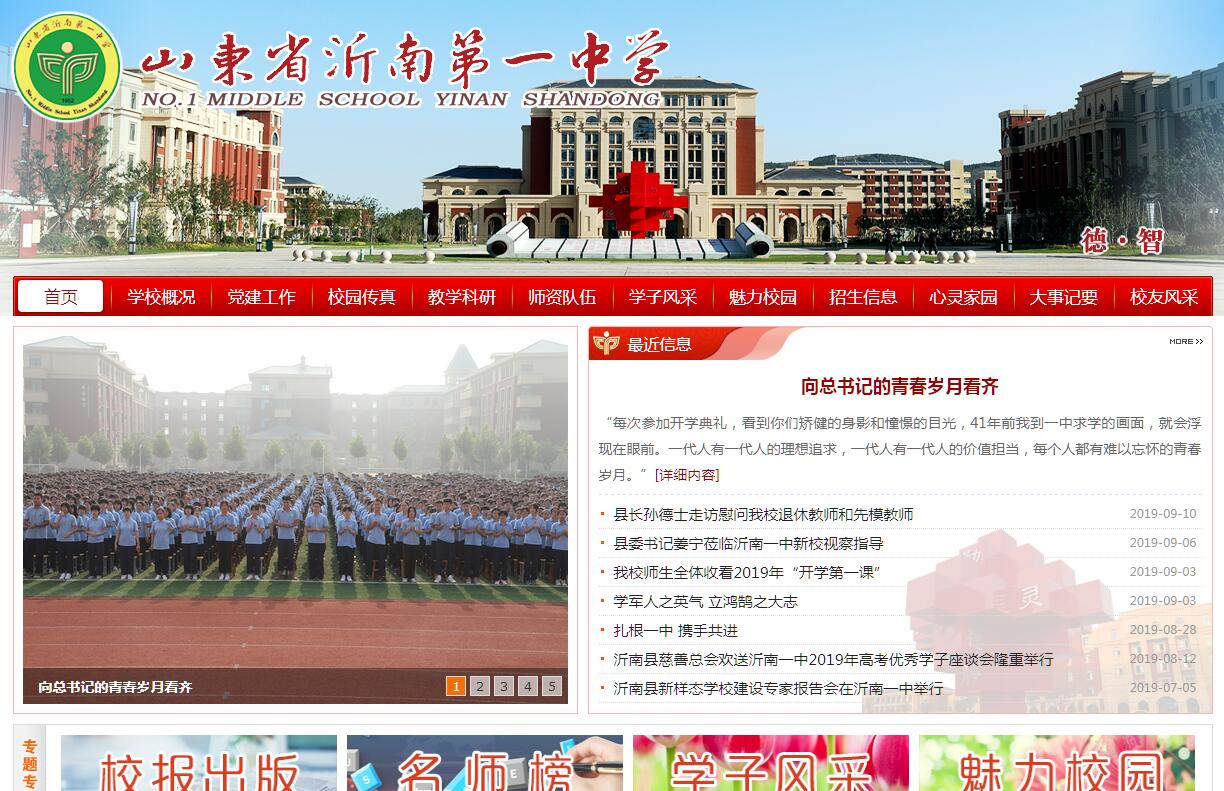 山東省沂南第一中學(xué)坐落在智圣諸葛亮的故里山東沂南,始創(chuàng)于1952年11月,1953年遷入現(xiàn)在校址——沂南縣界湖鎮(zhèn)文化路19號。學(xué)校占地54669平方米,建筑面積66401平方米。在職教職工563人,在校學(xué)生近7000人。擁有高級教師130人,中級教師211人,碩士研究生學(xué)歷20人。2004年被評為山東省規(guī)范化學(xué)校,并先后被授予"山東省綠化先進單位" 等幾十項榮譽稱號。2015年12月,縣教體局發(fā)布公示:沂南一中新校址選定于縣城西外環(huán)以東、北外環(huán)以南、縣城關(guān)中學(xué)(界湖一中)以西,占地約400畝。目前,新校建設(shè)正在緊張籌備中。學(xué)校建有集教學(xué)、會議、演出為一體的大型多功能廳。開通寬帶網(wǎng),建有教學(xué)網(wǎng)絡(luò)平臺、教學(xué)資源庫。微機室、實驗室、閱覽室、體育館等功能室一應(yīng)俱全,電子監(jiān)控安全網(wǎng)絡(luò)覆蓋全校。學(xué)校構(gòu)建“德·智”校園文化體系,重視文化引領(lǐng),以文化人。打造校宣傳欄文化、教室文化、宿舍文化、餐廳文化、樓道文化、教研組辦公室文化體系,重建學(xué)校網(wǎng)站,創(chuàng)辦《沂南第一中學(xué)報》,制作學(xué)校宣傳片,創(chuàng)作畢業(yè)歌、校歌,錄制校歌MTV。學(xué)校建有一支敬業(yè)奉獻、嚴謹執(zhí)教、愛生善導(dǎo)、團結(jié)協(xié)作、以身立教的良好教師隊伍。擁有省人大代表1人、省優(yōu)秀教師5人、市勞動模范2人、市優(yōu)秀教師6人、沂蒙名師4人、市優(yōu)秀教研組長8人、市優(yōu)秀班主任4人、市教學(xué)能手、教學(xué)新秀47人、市政府首屆教學(xué)成果獎24人、縣勞動模范2人、沂南名師13人、縣十大杰出青年6人、縣首屆最美教師1人、縣政府記集體記三等功3次,受縣政府個人記功7人、縣政府首屆教學(xué)成果獎49人。沂南一中新校位于縣城西北方向,北外環(huán)以南、西外環(huán)以東、玉泉路以北、規(guī)劃英才路以西,四面環(huán)路,交通順暢;南北望山,西面向水,毗鄰汶河濕地公園和西山公園,地理位置優(yōu)越。新校占地面積444.6畝,校舍建筑面積13.99萬平方米,共有21個建筑單體、兩個運動場、三個大門,總投資約4.58億元;辦學(xué)規(guī)模達到141個教學(xué)班,可容納7000余名學(xué)生就讀。是沂南縣一次性投資最大的民生工程。新校功能布局科學(xué)合理,教學(xué)管理設(shè)施先進齊全。分為教學(xué)區(qū)、生活服務(wù)區(qū)、景觀休閑區(qū)、綜合會議區(qū)、校內(nèi)外停車區(qū)等功能區(qū)。設(shè)有3座教學(xué)組團樓、1座科技樓、8座宿舍樓、2座餐廳樓、1座藝術(shù)樓、1座體育館、1座圖書綜合樓、1座大禮堂、1座生活服務(wù)樓、1座浴室樓以及衛(wèi)生室、理發(fā)廳、超市等生活服務(wù)用房。新校規(guī)劃設(shè)計高端定位。同濟大學(xué)承擔(dān)規(guī)劃設(shè)計,山東大衛(wèi)國際建筑設(shè)計。以前庭后院的景觀結(jié)構(gòu)、環(huán)狀流暢的交通體系、自由錯落的建筑布局、疊山引水的景觀特色為設(shè)計理念,塑造文化濃厚、山水園林園式學(xué)校。先后有32名學(xué)生被清華大學(xué)和北京大學(xué)錄取,曾連續(xù)兩年摘取山東省文科狀元的桂冠,每年都有一大批學(xué)生升入“985”、“211”重點名校,先后被山東大學(xué)、山東經(jīng)濟學(xué)院、山東體育學(xué)院確定為"優(yōu)秀人才輸送基地"。近年來,有近兩千人次在各學(xué)科奧賽,各類比賽、競賽中和青少年科技創(chuàng)新大賽中獲獎。學(xué)校先后被授予“中國西部教育顧問單位”,“山東省規(guī)范化學(xué)?!?、“山東省綠色學(xué)校”等省級榮譽,“臨沂市普通高中教學(xué)工作先進單位”、“臨沂市師德建設(shè)十佳單位”等市級榮譽,并因開展各類競賽榮獲“臨沂市青少年科技創(chuàng)新市長獎組織獎”等稱號。校食堂獲稱“臨沂市學(xué)校餐飲服務(wù)食品安全示范食堂”。