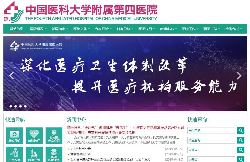 中國醫(yī)科大學(xué)附屬第四醫(yī)院是集醫(yī)療、教學(xué)、科研于一體的大型綜合性三級甲等醫(yī)院。醫(yī)院始建于1909年,在歲月的長河中幾經(jīng)變遷,曾名為日本赤十字會社奉天病院、中國紅十字會遼寧醫(yī)院、中國醫(yī)科大學(xué)內(nèi)科學(xué)院、沈陽鐵路局中心醫(yī)院。2004年10月10日正式回歸中國醫(yī)科大學(xué)管理,成為中國醫(yī)科大學(xué)第四臨床學(xué)院、中國醫(yī)科大學(xué)附屬第四醫(yī)院。在一百多年的風(fēng)雨中,中國醫(yī)大四院形成了“誠信至上,以人為本”的理念,把“敬業(yè)、仁愛、團結(jié)、超越”作為院訓(xùn),時刻提醒著中國醫(yī)大四院人,向“構(gòu)建國內(nèi)知名、東北先進的創(chuàng)新型、學(xué)院式大學(xué)附屬醫(yī)院”的全新目標(biāo)穩(wěn)步邁進。中國醫(yī)大四院以外科微創(chuàng)治療、眼科、心腦血管介入治療及腫瘤疾病綜合治療為特色,由崇山院區(qū)(院本部)及下轄的和平院區(qū)、棋盤山院區(qū)組成。占地面積近12萬平方米,建筑面積14.3萬平方米,編制床位數(shù)1800張。全院共有77個臨床醫(yī)輔科室, 11個醫(yī)技科室,20個教研室和9個臨床專業(yè)實驗室。全院教職員工 2245人,有高級職稱人員200余人,國務(wù)院政府特貼5人,國家級百千萬人才百人層次2人,遼寧省百千萬人才工程百人層次6人,遼寧名醫(yī)3人,博士研究生導(dǎo)師17人,碩士研究生導(dǎo)師85人。醫(yī)院面向全國公開招聘學(xué)科帶頭人,先后有40余位學(xué)科帶頭人加盟。近年來,醫(yī)院適時調(diào)整學(xué)科建設(shè)發(fā)展戰(zhàn)略,整合優(yōu)勢資源。在原有省級重點學(xué)科、??频幕A(chǔ)上,成立減重、代謝類疾病診療為重點的減重代謝病學(xué)科群,突出普通外科和內(nèi)分泌代謝內(nèi)科診療技術(shù)特色,多學(xué)科滲透協(xié)作,進一步提升了醫(yī)院的學(xué)科實力。目前醫(yī)院擁有眼科學(xué)(眼科)、泌尿外科學(xué)(泌尿外科)和神經(jīng)病學(xué)(神經(jīng)內(nèi)科)三個省級重點學(xué)科;普通外科、眼科、心血管內(nèi)科、泌尿外科、腫瘤放射治療科、肝膽外科以及結(jié)直腸肛門外科先后獲批為省級臨床重點??啤at(yī)院擁有兩個遼寧省重點實驗室和十余個遼寧省專業(yè)治療中心。醫(yī)院尊重傳承百年的優(yōu)秀歷史文化,重視技術(shù)進步,加強學(xué)科建設(shè)和人才培養(yǎng),不斷提升醫(yī)院的醫(yī)療綜合服務(wù)能力。打造優(yōu)勢學(xué)科,社會聲譽與影響力不斷攀升。醫(yī)院被授予全國衛(wèi)生系統(tǒng)先進集體、全國百姓放心示范醫(yī)院、國家衛(wèi)計委互聯(lián)互通標(biāo)準(zhǔn)化成熟度“四級甲等”、遼寧省衛(wèi)生系統(tǒng)“誠信服務(wù)杯”競賽標(biāo)兵單位、沈陽市先進單位、沈陽市“白求恩杯”競賽標(biāo)兵單位、沈陽公共服務(wù)單位百姓口碑榜評選金榜單位、沈陽市十佳醫(yī)院等榮譽稱號。