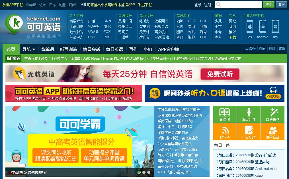 可可英語創(chuàng)辦于2005年,致力于打造集實(shí)用性,互動(dòng)性,娛樂性為一體的專業(yè)公益性英語學(xué)習(xí)平臺(tái),建站至今,已經(jīng)贏得越來越多英語學(xué)習(xí)者的信任與支持。在百度搜索中“英語口語”關(guān)鍵字排名第一位。Alexa世界排名3.7萬,日PV達(dá)到100多萬。 在眾多網(wǎng)友心中,可可是她們每天必上的學(xué)習(xí)網(wǎng)站。在這里您可以:1.收聽到最新的英語聽力資訊和進(jìn)行英語聽寫訓(xùn)練;2.收聽到精彩的英語口語學(xué)習(xí)節(jié)目,找到您的口語對(duì)練伙伴;3.能看到輕松時(shí)尚的精美文章和雙語講解的英文名著;4.能聽到精心挑選的英文歌曲,也能分享您喜歡的歌曲;5.能看到精彩的雙語字幕電影,最新的影視資訊和影視學(xué)習(xí)專題;6.體驗(yàn)可可地盤個(gè)人空間、學(xué)習(xí)群組、相冊(cè)、背單詞、在線測(cè)試等功能??煽捎⒄Z的受眾群體,百分之九十以上都是為在校學(xué)生、在職人員或白領(lǐng)階層,并具有高技能、高素質(zhì)、高消費(fèi)的特點(diǎn)。專業(yè)的定位能夠有效的保證宣傳效果,非常適合各類招生或培訓(xùn)公司宣傳公司形象,發(fā)布招生培訓(xùn)信息,推廣各類教育學(xué)習(xí)產(chǎn)品與消費(fèi)類產(chǎn)品。