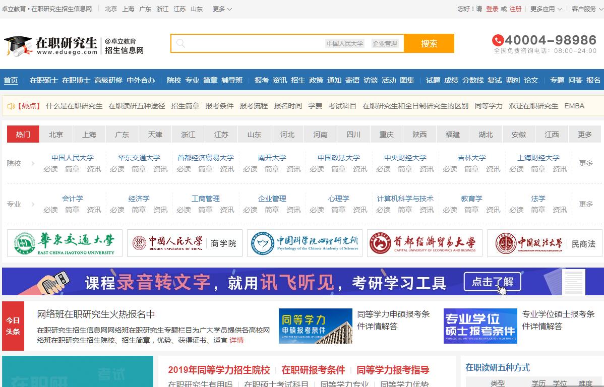 卓立教育 ? 在職研究生招生信息網(wǎng)創(chuàng)立于2010年;隸屬于北京大成卓立教育科技有限公司,是國內(nèi)前沿的在職研究生領(lǐng)域綜合性門戶網(wǎng)站。卓立教育 ? 在職研究生招生信息網(wǎng)是全國在職研究生網(wǎng)上報(bào)名服務(wù)平臺,既是各在職研究生招生單位的宣傳咨詢平臺,主要及時提供全國各大院校在職碩士(同等學(xué)力申碩、在職專業(yè)碩士)、在職博士、高級研修、中外合作辦學(xué)等高端教育項(xiàng)目的招生動態(tài),為求學(xué)者免費(fèi)提供及時、準(zhǔn)確、全面的教育資訊信息,以及為求學(xué)者提供快捷的網(wǎng)上在線咨詢服務(wù),為廣大學(xué)員搭建一個與全國各招生單位進(jìn)行交流的橋梁。卓立教育 ? 在職研究生招生信息網(wǎng)貫穿在職研究生招生宣傳、招生咨詢、考試提醒、在校報(bào)名、生源調(diào)劑、開課通知等整個工作流程,實(shí)現(xiàn)了在職研究生服務(wù)一體化。為學(xué)員提供專業(yè)的報(bào)前咨詢服務(wù),為學(xué)員分析適合的學(xué)校與專業(yè),為各個在職研究生招生單位提供精準(zhǔn)有效的廣告投放服務(wù)。