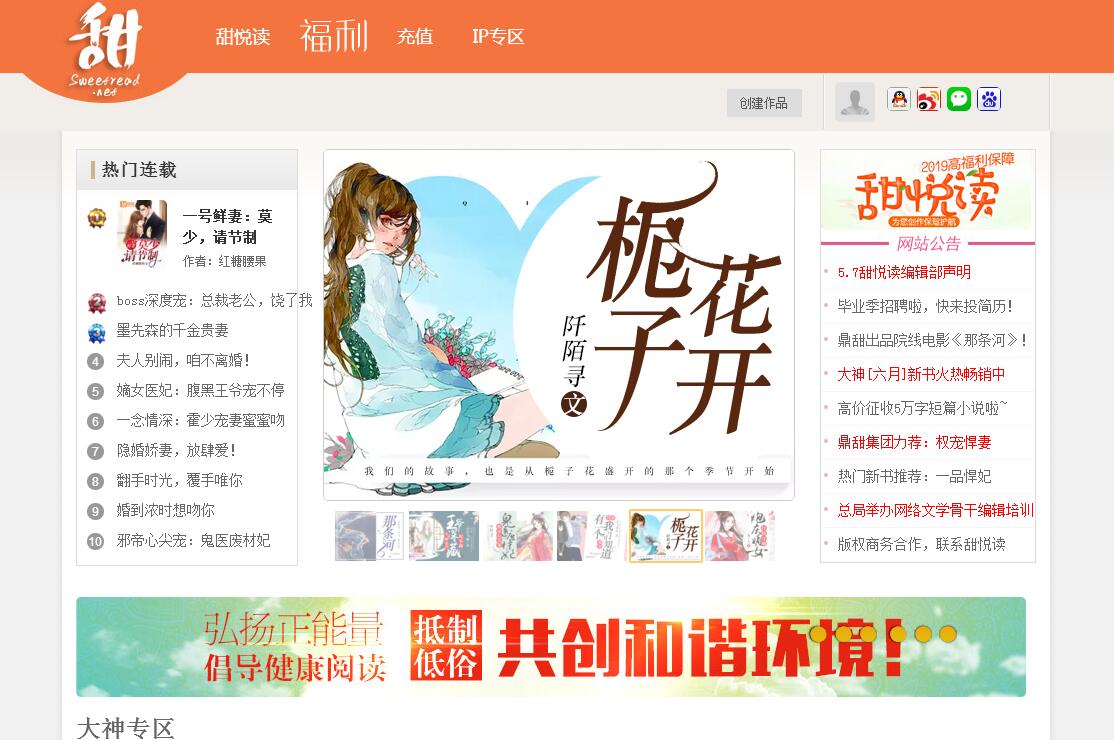 甜悅讀是于2014年2月在上海鼎甜科技有限公司注資下,成立的國內(nèi)文學市場先鋒閱讀品牌。甜悅讀由行業(yè)內(nèi)資深內(nèi)容運營團隊組成,背靠強大資本進行有效戰(zhàn)略方向布局,目前核心主體為互聯(lián)網(wǎng)(PC)、移動互聯(lián)網(wǎng)(無線wap+app)綜合的數(shù)字閱讀\出版業(yè)務,提出了“讓閱讀來點滋味”的口號。目前,甜悅讀已吸引數(shù)百位無線知名實力原創(chuàng)作者加盟,為塑立公司的整體品牌價值,將甜悅讀打造成為國內(nèi)原創(chuàng)文學領(lǐng)域優(yōu)秀閱讀品牌,公司主體閱讀業(yè)務已建立一條“精品版權(quán)資源引入——線上版權(quán)價值運營(包括海外)——線下版權(quán)拓展(包括海外)——下游版權(quán)形態(tài)自主或合作開發(fā)”完整的新運行生態(tài)機制,使作品版權(quán)得到最大程度的價值。在成立一年之際,甜悅讀在業(yè)內(nèi)擁有良好的口碑,單月在站內(nèi)過萬的作品有多部。在互聯(lián)網(wǎng)上,甜悅讀已與中國移動三大運營商和閱讀、沃閱讀、天翼閱讀達成合作,并同時和騰訊文學、百度文學、塔讀文學、久邦文學、鳳凰讀書、網(wǎng)易云閱讀、掌閱ireader等眾多平臺攜手?;诰W(wǎng)絡原創(chuàng)文學具備多種版權(quán)的特質(zhì),由優(yōu)質(zhì)作品內(nèi)容上延伸出去的多渠道、多版權(quán),將逐漸主導整個互聯(lián)網(wǎng)的娛樂模式,成為互聯(lián)網(wǎng)娛樂產(chǎn)業(yè)鏈條的最上游。游戲、影視、動漫、出版等多種下游形態(tài),都在被這個領(lǐng)域里的內(nèi)容輻射覆蓋。甜悅讀已與國內(nèi)多家知名影視集團、動漫集團和游戲開發(fā)商及發(fā)行商合作,如《我的合租老婆》等優(yōu)質(zhì)作品,已開始籌備網(wǎng)絡劇拍攝的前期工作。其他重要作品也將陸續(xù)改編影視劇和網(wǎng)絡游戲。甜悅讀網(wǎng)站在這個時候上線,未來的發(fā)展計劃,也定位于此。以優(yōu)質(zhì)內(nèi)容為基點,著重打造作家明星,擴大作品、作家、網(wǎng)站三者的品牌名譽度,形成閉環(huán)大IP戰(zhàn)略工作,做好粉絲經(jīng)濟商業(yè)模式,達成共贏。為努力創(chuàng)建可以涵蓋整個版權(quán)的產(chǎn)業(yè)鏈條,真正成為國內(nèi)原創(chuàng)文學領(lǐng)域先鋒閱讀品牌,甜悅讀最終將會成為一個基于移動終端的集閱讀、創(chuàng)作、銷售、互動等多項功能于一體的大型綜合原創(chuàng)文學+數(shù)字出版開放式平臺。2016年,甜悅讀引進了《梔子花開》、《有一個地方只有我們知道》等優(yōu)秀影視作品,承制了網(wǎng)絡大電影《異能事務所之嗜血判官》,并與各大影視、出版社、游戲、動漫公司建立良好的合作關(guān)系。2017年5月,我們參與出品了由王慶祥、遲蓬、張楊果而等主演的院線電影《那條河》,同名小說也在甜悅讀首發(fā),預計2018年在各大院線上映。2017年11月,我們獨家出品的漫畫《侍器人》在騰訊動漫首發(fā)更新6話后,點擊突破1千萬,收藏破2萬。部分優(yōu)秀作品:《我的合租老婆》、《閃婚老公不靠譜》、《買一送一:嫁給億萬首席》、《我的床上有只鬼》、《陪安東尼度過漫長的歲月》等。