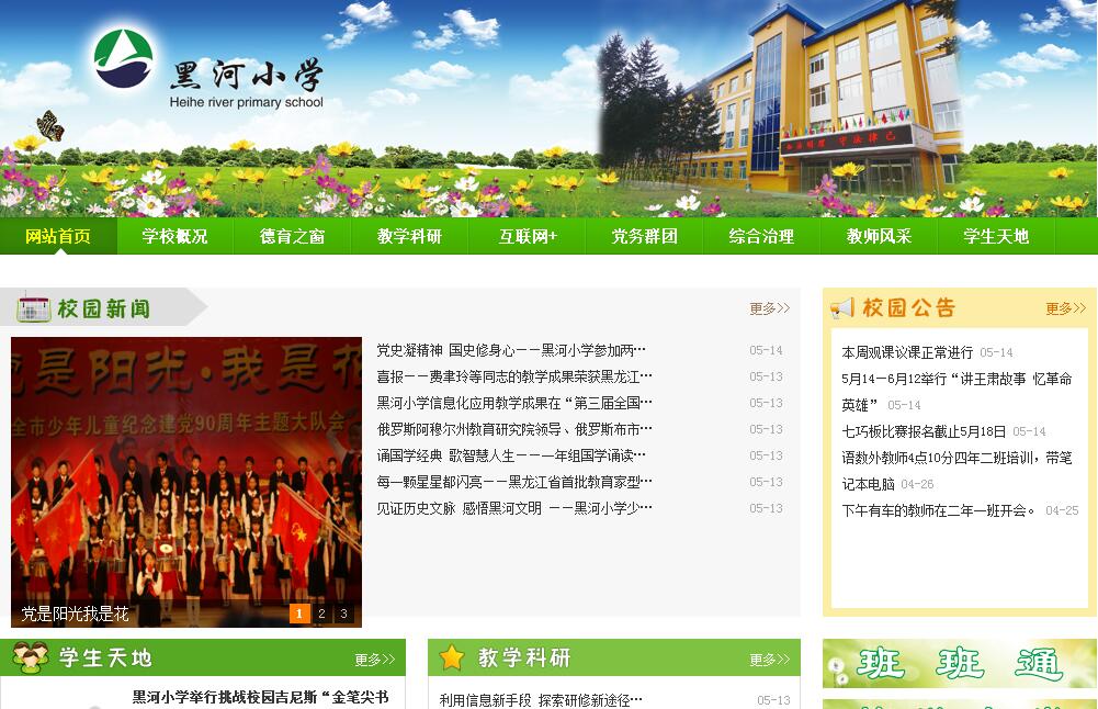 黑河小學創(chuàng)建于2007年9月,現有教職工74人。學校實施小班化教學,班額在25-36人之間。以“全納、適宜、精致、優(yōu)質”為價值追求,秉承“每一顆星星都閃亮”的辦學理念,實施“教育個性化、教育親情化、教育特長化”的辦學策略。小班化教育中實現對師生生命的高度關注,對學生的個別化教育,學校堅持立德樹人,不斷加強校園文化建設、課程建設、隊伍建設,實施多元評價,開展課題研究,深化課堂教學改革,為學生的成長扎下終身發(fā)展的愿望之根、能力之根、品質之根。作為黑河地區(qū)唯一一所教育部第一批信息化試點小學,學校加大信息化建設投入力度建設高速互聯的校園網,高效實用的“班班通”、高質便捷的“人人通”,創(chuàng)建微課制作室、智動課堂、云課堂、專遞課堂、錄播教室、智高教室,實現虛擬化辦公,折射出了信息化助推學生個性發(fā)展的良好格局。建校八年來學校實現了跨越式發(fā)展:學校被授予國家教育部門首批信息化試點學校、國家語言文字規(guī)范化示范校、全國生態(tài)道德教育示范校、全國語文特色校、全國優(yōu)秀少先大隊、省首批義務教育標準化先進學校、省行風建設群眾最滿意學校等榮譽稱號。
