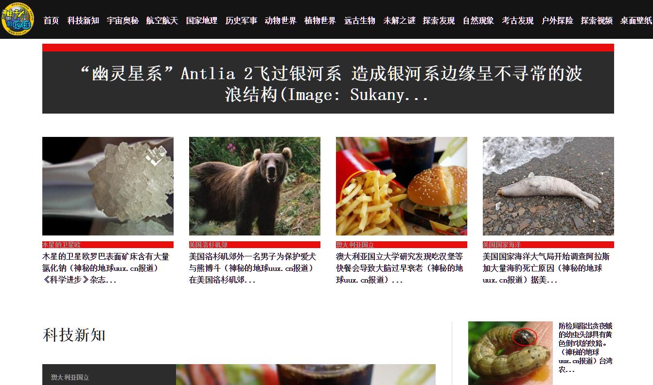 | 網(wǎng)站簡介: 神秘的地球網(wǎng)站內(nèi)容涉及宇宙奧秘、航空航天、動物世界、植物世界、遠古生物、考古發(fā)現(xiàn)、自然現(xiàn)象、未解之謎、UFO、水怪、野人、奇聞怪事、國家地理、旅游探險、歷史軍事、探索發(fā)現(xiàn)、科技新知等等。 |