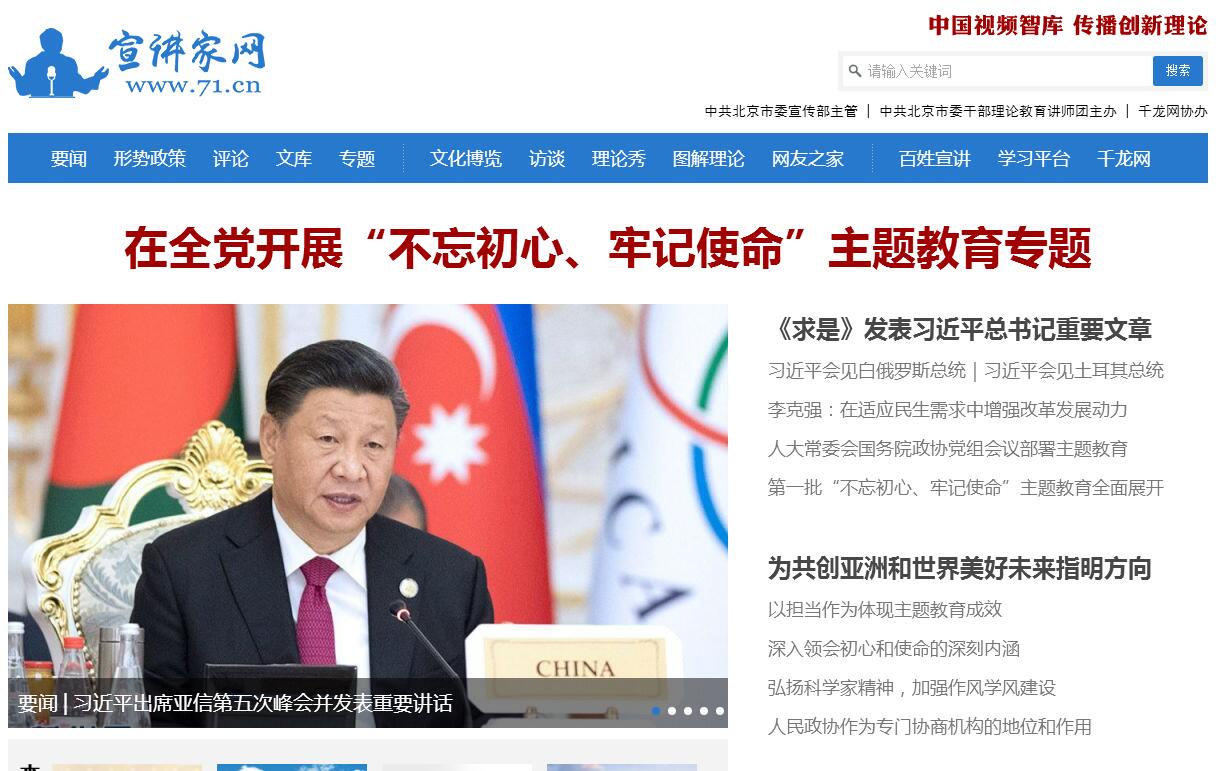 | 網(wǎng)站簡(jiǎn)介: 宣講家網(wǎng)站(www.71.cn)是由中共北京市委宣傳部主管、中共北京市委干部理論教育講師團(tuán)主辦、千龍網(wǎng)協(xié)辦的學(xué)習(xí)型、服務(wù)型、創(chuàng)新型網(wǎng)站。網(wǎng)站創(chuàng)辦于2006年10月,是中共北京市委干部理論教育講師團(tuán)開(kāi)展馬克思主義網(wǎng)絡(luò)傳播的重要探索成果,是全黨全國(guó)第一家政治性、理論性、思想性為主導(dǎo)的公益性質(zhì)的視頻網(wǎng)站。宣講家網(wǎng)站始終堅(jiān)持高舉中國(guó)特色社會(huì)主義偉大旗幟,以馬克思列寧主義、毛澤東思想、鄧小平理論、“三個(gè)代表”重要思想、科學(xué)發(fā)展觀、習(xí)近平新時(shí)代中國(guó)特色社會(huì)主義思想為指導(dǎo),深入貫徹落實(shí)黨的十八大精神及其歷次全會(huì)精神,深入學(xué)習(xí)宣傳貫徹黨的十九大精神,深入學(xué)習(xí)宣傳貫徹習(xí)近平總書(shū)記系列重要講話(huà)精神,全力為首都政治中心、文化中心、科技創(chuàng)新中心、國(guó)際交流中心和京津冀協(xié)同發(fā)展的戰(zhàn)略任務(wù)提供精神動(dòng)力、思想保證和智力支持,為實(shí)現(xiàn)國(guó)家富強(qiáng)、民族振興、人民幸福的中國(guó)夢(mèng)而努力奮斗。宣講家網(wǎng)站以弘揚(yáng)主旋律、傳播正能量為己任,全力傳播有說(shuō)服力、吸引力和感染力的思想政治理論、解讀形勢(shì)政策、普及人文科學(xué)、宣傳英模事跡等宣講報(bào)告。主旨是“中國(guó)視頻智庫(kù),傳播創(chuàng)新理論”。傳播馬克思主義中國(guó)化時(shí)代化大眾化的創(chuàng)新理論,有效地加強(qiáng)和推進(jìn)黨的理論武裝工作,輔導(dǎo)廣大黨員干部群眾學(xué)習(xí)科學(xué)理論、學(xué)習(xí)貫徹黨的理論和路線(xiàn)方針政策,深刻了解把握國(guó)內(nèi)國(guó)際兩個(gè)大局的發(fā)展變化,提高思想理論素養(yǎng),增強(qiáng)人文知識(shí)底蘊(yùn),培養(yǎng)高尚道德情操,鍛造民族精神和時(shí)代精神,用互聯(lián)網(wǎng)新媒體傳播黨的創(chuàng)新理論,鞏固馬克思主義在意識(shí)形態(tài)領(lǐng)域指導(dǎo)地位、鞏固全黨全國(guó)人民團(tuán)結(jié)奮斗的共同思想基礎(chǔ),弘揚(yáng)社會(huì)主義核心價(jià)值觀。網(wǎng)站是中共北京市委干部理論教育講師團(tuán)職能任務(wù)在互聯(lián)網(wǎng)上的展示和延伸。眼前一亮、心中一動(dòng)、抓住眼球和耳朵”——堅(jiān)持正確導(dǎo)向,既有理論深度有品味,又通俗易懂、信息豐富,有說(shuō)服力、吸引力、感染力,讓網(wǎng)民愿意聽(tīng)、坐得住、聽(tīng)得懂、記得牢、用得上,充分展示視頻理論報(bào)告的魅力。質(zhì)量第一、內(nèi)容為王、精品戰(zhàn)略”——堅(jiān)持思想強(qiáng)、知識(shí)好、理念新。從每年3000多部精品輔導(dǎo)報(bào)告中,精選出經(jīng)濟(jì)、政治、黨建、文化、社會(huì)、生態(tài)等20余類(lèi)400多部?jī)?yōu)秀報(bào)告上網(wǎng)。“權(quán)威宣講、解疑釋惑”——圍繞網(wǎng)民普遍關(guān)心的國(guó)內(nèi)國(guó)際與民生熱點(diǎn)難點(diǎn)問(wèn)題,邀請(qǐng)高層領(lǐng)導(dǎo)、職能部門(mén)負(fù)責(zé)人和著名專(zhuān)家學(xué)者進(jìn)行解讀輔導(dǎo)?!罢腺Y源,信息共享”——網(wǎng)站主要通過(guò)整合優(yōu)化首都思想理論界和中央國(guó)家機(jī)關(guān)豐厚的優(yōu)質(zhì)宣講資源,同時(shí)聯(lián)手各省、自治區(qū)、直轄市的黨委宣傳部、講師團(tuán),匯集全國(guó)的名人、名家、名報(bào)告,薈萃宣講精品、彰顯宣講優(yōu)勢(shì)、打造宣講品牌、共享宣講成果?!吧疃乳_(kāi)發(fā),延伸服務(wù)”——精選報(bào)告講稿,辦好《大講堂》內(nèi)部刊物,辦好首都大講堂在線(xiàn)學(xué)習(xí)平臺(tái)、手機(jī)客戶(hù)端《宣講智庫(kù)》、微信公眾號(hào)“宣講家”、官方微博等新媒體,滿(mǎn)足不同崗位的黨務(wù)、宣傳、理論工作者及各級(jí)領(lǐng)導(dǎo)干部和黨員干部群眾不同層次的學(xué)習(xí)需求。權(quán)威解讀,網(wǎng)民好評(píng)。宣講家網(wǎng)站是理論武裝工作在網(wǎng)絡(luò)媒體的新陣地;是在互聯(lián)網(wǎng)上宣傳普及黨中央和北京市委市政府一系列重大戰(zhàn)略思想的新舉措;是黨的思想理論宣傳教育大眾化、通俗化、普及化、網(wǎng)絡(luò)化的新路徑。網(wǎng)站以網(wǎng)絡(luò)世界為講堂,以網(wǎng)民為聽(tīng)眾,邀請(qǐng)權(quán)威專(zhuān)家,對(duì)黨的創(chuàng)新理論、黨的路線(xiàn)方針政策和時(shí)政形勢(shì)進(jìn)行宣講解讀,逐漸形成了一個(gè)特點(diǎn)鮮明的宣講“視頻智庫(kù)”網(wǎng)站。宣講家上線(xiàn)以來(lái),堅(jiān)持每天上傳1至2部視頻報(bào)告、1至2篇講稿、1至2套PPT和大量最新理論文章,庫(kù)存海量文獻(xiàn)資料。截至目前,已累積播發(fā)視頻講座16000余部,文獻(xiàn)級(jí)、史料級(jí)、資料級(jí)文字資料500億字節(jié)。從網(wǎng)站上線(xiàn)到日瀏覽率最高達(dá)3300多萬(wàn)次,在全球最高排名為2000多位,在國(guó)內(nèi)排名最高為200多位。從初始階段的“無(wú)人問(wèn)津”,到日常有10多萬(wàn)獨(dú)立IP同時(shí)在線(xiàn)學(xué)習(xí)收看報(bào)告、講稿和文章,頁(yè)面點(diǎn)擊量累計(jì)達(dá)