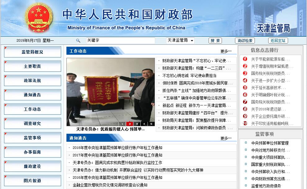 財(cái)政部天津監(jiān)管局主要職責(zé):一、貫徹落實(shí)黨中央關(guān)于財(cái)經(jīng)工作的方針政策和決策部署,在履行職責(zé)過程中堅(jiān)持和加強(qiáng)黨對財(cái)政工作的集中統(tǒng)一領(lǐng)導(dǎo),履行全面從嚴(yán)治黨責(zé)任。二、調(diào)查研究屬地經(jīng)濟(jì)發(fā)展形勢和財(cái)政運(yùn)行狀況。根據(jù)財(cái)政部授權(quán)管理屬地中央各項(xiàng)財(cái)政收支,承擔(dān)財(cái)稅法規(guī)和政策在屬地的執(zhí)行情況、預(yù)算管理有關(guān)監(jiān)督工作,向財(cái)政部提出相關(guān)政策建議。三、對屬地中央預(yù)算單位預(yù)決算編制情況進(jìn)行評估并向財(cái)政部提出審核意見。根據(jù)財(cái)政部授權(quán)對屬地中央預(yù)算單位預(yù)算執(zhí)行情況進(jìn)行監(jiān)控及分析預(yù)測。組織對中央重大財(cái)稅政策和專項(xiàng)轉(zhuǎn)移支付在屬地的執(zhí)行情況進(jìn)行績效評價(jià),提出相關(guān)改進(jìn)措施建議并跟蹤落實(shí)。四、根據(jù)財(cái)政部授權(quán)對地方政府債務(wù)實(shí)施監(jiān)控,嚴(yán)控法定限額內(nèi)債務(wù)風(fēng)險(xiǎn),防控隱性債務(wù)風(fēng)險(xiǎn),發(fā)現(xiàn)風(fēng)險(xiǎn)隱患及時(shí)提出改進(jìn)和處理意見并向財(cái)政部、地方人民政府反映報(bào)告。五、按規(guī)定權(quán)限審核審批屬地中央行政事業(yè)單位國有資產(chǎn)配置、處置等事項(xiàng)。根據(jù)財(cái)政部授權(quán)監(jiān)管屬地中央金融企業(yè)執(zhí)行財(cái)務(wù)制度等情況。六、根據(jù)財(cái)政部統(tǒng)一部署,承擔(dān)有關(guān)會(huì)計(jì)信息質(zhì)量、注冊會(huì)計(jì)師行業(yè)執(zhí)業(yè)質(zhì)量、資產(chǎn)評估行業(yè)執(zhí)業(yè)質(zhì)量監(jiān)督檢查工作,參與跨境會(huì)計(jì)監(jiān)管合作。七、完成財(cái)政部交辦的其他任務(wù)。