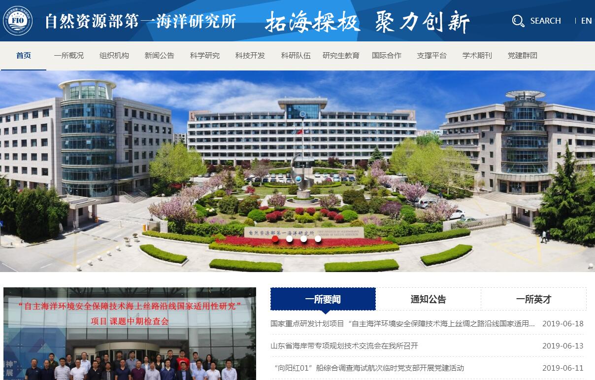 自然資源部第一海洋研究所(簡稱海洋一所),現(xiàn)隸屬于自然資源部,始建于1958年,為海軍第四海洋研究所,1964年整建制劃歸原國家海洋局,更名為國家海洋局第一海洋研究所,2018年并入自然資源部,更名為自然資源部第一海洋研究所,是從事基礎(chǔ)研究、應(yīng)用基礎(chǔ)研究和社會公益服務(wù)的綜合性海洋研究所,共占地170余畝,擁有嶗山所區(qū)和鰲山所區(qū)(在建)。研究所以促進(jìn)海洋科技進(jìn)步,為海洋資源環(huán)境管理和海洋經(jīng)濟(jì)發(fā)展服務(wù)為宗旨,是國家科技創(chuàng)新體系的重要海洋科研實體。主要研究領(lǐng)域為中國近海、大洋和極地海域自然環(huán)境要素分布及變化規(guī)律,包括海洋資源與環(huán)境地質(zhì);海洋災(zāi)害發(fā)生機(jī)理及預(yù)測方法;海氣相互作用與氣候變化;海洋生態(tài)環(huán)境變化規(guī)律和海島海岸帶保護(hù)與綜合利用等。建所60余年來,自然資源部第一海洋研究所已發(fā)展成為國內(nèi)外知名的海洋科研機(jī)構(gòu),已擁有近600人的科學(xué)研究、技術(shù)支撐和業(yè)務(wù)管理隊伍,其中高級職稱180余人;設(shè)有8個主要學(xué)科領(lǐng)域,涉及海洋科學(xué)32個研究方向;牽頭組建了青島海洋科學(xué)與技術(shù)國家實驗室的2個功能實驗室,建有5個部級重點(diǎn)實驗室、9個國際科技合作機(jī)構(gòu);擁有2艘國際領(lǐng)先的大洋級海洋科學(xué)綜合考察船及國際一流水平的海洋調(diào)查測量設(shè)備、實驗測試設(shè)備和科研輔助設(shè)施;參與并完成了一大批國家重大海洋專項、973項目、863計劃項目、國家科技支撐項目、國家自然科學(xué)基金項目、國際合作項目和海洋開發(fā)項目,獲省部級及以上科技獎勵250余項,其中主持完成100余項;制定推薦性國家標(biāo)準(zhǔn)10項;獲得國家發(fā)明專利授權(quán)168項,獲得國際專利授權(quán)7項,為我國海洋科學(xué)事業(yè)的發(fā)展和海洋經(jīng)濟(jì)建設(shè)做出了突出的貢獻(xiàn)。