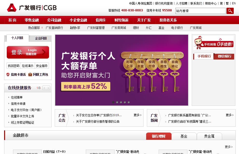 廣發(fā)銀行成立于1988年,是國內(nèi)首批組建的股份制商業(yè)銀行之一。本行秉持“誠信、責(zé)任、創(chuàng)新、篤行”的核心價(jià)值觀,牢記“服務(wù)客戶、回報(bào)股東、成就員工、奉獻(xiàn)社會(huì)”的歷史使命,踐行“相知相伴、全心為您”的服務(wù)理念,朝著實(shí)現(xiàn)“全國一流商業(yè)銀行”的戰(zhàn)略目標(biāo)奮勇前進(jìn)。本行致力于為客戶提供高質(zhì)量、高效率、全方位的綜合金融服務(wù)。在北京、天津、河北、山西、遼寧、吉林、黑龍江、上海、江蘇、浙江、安徽、福建、江西、山東、河南、湖北、湖南、廣東、廣西、重慶、四川、云南、陜西、新疆等境內(nèi)24個(gè)?。ㄖ陛犑?、自治區(qū))100個(gè)地級(jí)及以上城市和澳門特別行政區(qū)設(shè)立了44家直屬分行、862家營業(yè)機(jī)構(gòu),并與全球100多個(gè)國家和地區(qū)的1,319家金融機(jī)構(gòu)建立了SWIFT密押關(guān)系,為30多萬對(duì)公客戶、3,700多萬個(gè)人客戶、4,600多萬信用卡客戶和3,600多萬移動(dòng)金融客戶提供優(yōu)質(zhì)、全面的金融服務(wù)。