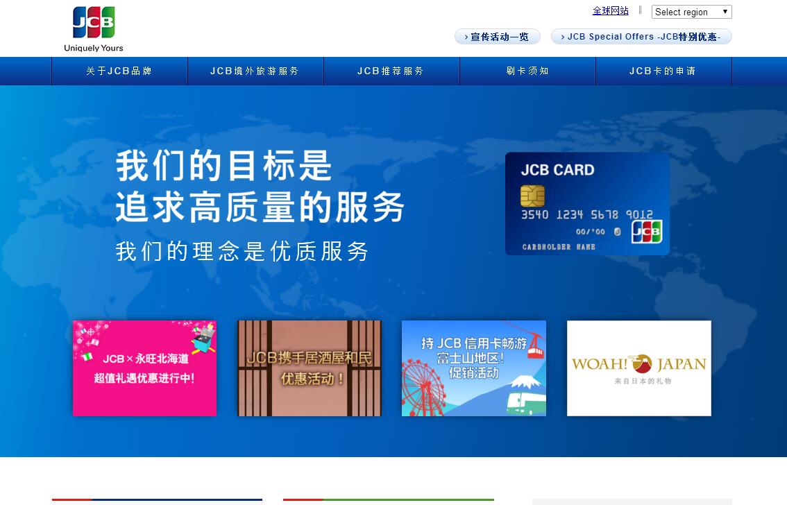 從1981年開始,JCB以開創(chuàng)世界通用的JCB信用卡為目標(biāo),推進(jìn)發(fā)展。JCB始終堅(jiān)持通過JCB卡的拓展,將能夠滿足所有會(huì)員需求的高質(zhì)量及高附加值服務(wù)向全世界普及。目前,JCB已經(jīng)通行于世界190個(gè)國家和地區(qū),更在海外設(shè)有大概30個(gè)分支機(jī)構(gòu)和代理機(jī)構(gòu),全世界業(yè)務(wù)協(xié)作機(jī)構(gòu)的數(shù)量已經(jīng)擴(kuò)大到350家以上。JCB之所以獲得了如此巨大成功,是因?yàn)镴CB在日本作為旅游和娛樂用信用卡所提供的優(yōu)質(zhì)服務(wù)獲得了高度評(píng)價(jià)。我們制定了宏偉的目標(biāo),推進(jìn)發(fā)展,奠定了JCB作為信用卡品牌的堅(jiān)實(shí)地位。JCB始終是日本信用卡行業(yè)的開路先鋒,是該行業(yè)首屈一指的品牌。目前,JCB擁有10,100萬名會(huì)員,遍布各個(gè)行業(yè)的特約商戶數(shù)量達(dá)3,200萬家,JCB的年銷售額達(dá)25兆5,001億日元。這些數(shù)據(jù)明確地顯示了JCB的實(shí)力。當(dāng)然,取得這些杰出的成績與各位會(huì)員、特約商戶·業(yè)務(wù)協(xié)作機(jī)構(gòu)對(duì)JCB的巨大支持是分不開的。今后,除了以信用卡代替現(xiàn)金完成結(jié)算的功能之外,JCB更將重視開發(fā)客戶的各種需求,開辟新型服務(wù),使得JCB卡成為在市場(chǎng)上擁有高附加值、充滿魅力的信用卡。