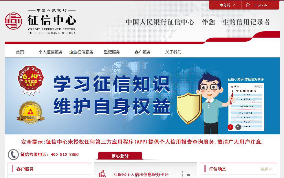 2006年3月,經(jīng)中編辦批準,中國人民銀行設立中國人民銀行征信中心,作為直屬事業(yè)單位專門負責企業(yè)和個人征信系統(tǒng)(即金融信用信息基礎數(shù)據(jù)庫,又稱企業(yè)和個人信用信息基礎數(shù)據(jù)庫)的建設、運行和維護。同時為落實《物權法》關于應收賬款質(zhì)押登記職責規(guī)定,征信中心于2007年10月1日建成應收賬款質(zhì)押登記系統(tǒng)并對外提供服務。2008年5月,征信中心正式在上海舉行了掛牌儀式,注冊地為上海市浦東新區(qū)。2013年3月15日施行的《征信業(yè)管理條例》(簡稱《條例》),明確了征信系統(tǒng)是由國家設立的金融信用信息基礎數(shù)據(jù)庫定位。目前,征信中心在全國31個省和5個計劃單列市設有征信分中心。作為專業(yè)化征信機構,征信中心依法履職,積極推進征信系統(tǒng)建設,保障系統(tǒng)安全穩(wěn)定運行,加快系統(tǒng)升級優(yōu)化,深入推進服務轉型,加強產(chǎn)品研發(fā)與應用,切實維護信息主體合法權益,充分發(fā)揮征信系統(tǒng)作為我國重要金融基礎設施作用,為推動社會信用體系建設做出了積極的貢獻。建成全球規(guī)模最大的征信系統(tǒng)。1997年,人民銀行開始籌建銀行信貸登記咨詢系統(tǒng)(企業(yè)征信系統(tǒng)的前身)。自2004年至2006年,人民銀行組織金融機構建成全國集中統(tǒng)一的企業(yè)和個人征信系統(tǒng)。今天的征信系統(tǒng),已經(jīng)建設成為世界規(guī)模最大、收錄人數(shù)最多、收集信息全面、覆蓋范圍和使用廣泛的信用信息基礎數(shù)據(jù)庫,基本上為國內(nèi)每一個有信用活動的企業(yè)和個人建立了信用檔案。截至2015年4月底,征信系統(tǒng)收錄自然人8.6億多,收錄企業(yè)及其他組織近2068萬戶。征信系統(tǒng)全面收集企業(yè)和個人的信息。其中,以銀行信貸信息為核心,還包括社保、公積金、環(huán)保、欠稅、民事裁決與執(zhí)行等公共信息。接入了商業(yè)銀行、農(nóng)村信用社、信托公司、財務公司、汽車金融公司、小額貸款公司等各類放貸機構;征信系統(tǒng)的信息查詢端口遍布全國各地的金融機構網(wǎng)點,信用信息服務網(wǎng)絡覆蓋全國。形成了以企業(yè)和個人信用報告為核心的征信產(chǎn)品體系,征信中心出具的信用報告已經(jīng)成為國內(nèi)企業(yè)和個人的“經(jīng)濟身份證”。征信系統(tǒng)應用廣泛、成效顯著。征信系統(tǒng)已經(jīng)在金融機構信用風險管理中廣泛應用,有效解決了信息不對稱問題,提高了社會公眾融資的便利性,創(chuàng)造了更多的融資機會,促進了信貸市場發(fā)展。征信系統(tǒng)的廣泛應用,顯著提高了社會信用意識,在全社會形成“守信激勵、失信懲戒”的激勵約束機制。今后,征信中心將繼續(xù)深化服務轉型,全面提升可持續(xù)發(fā)展的能力和水平,把征信系統(tǒng)建設好,努力為全社會提供更加優(yōu)質(zhì)高效的征信產(chǎn)品和服務,繼續(xù)為我國金融體系穩(wěn)定、社會信用環(huán)境改善發(fā)揮作用。
