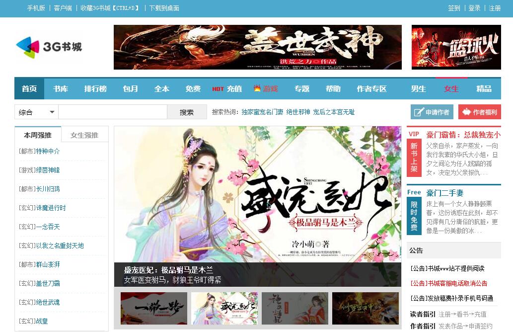 3G書(shū)城隸屬于廣州市久邦數(shù)碼科技有限公司旗下網(wǎng)站,始創(chuàng)于2005年,也是3G門(mén)戶的獨(dú)立運(yùn)營(yíng)大型閱讀集群平臺(tái)和大型原創(chuàng)文學(xué)網(wǎng)站。經(jīng)過(guò)五年的積累,3G書(shū)城已經(jīng)有包括玄幻、仙俠、言情、都市等幾十個(gè)類(lèi)別的超過(guò)近萬(wàn)部原創(chuàng)作品,每日更新字?jǐn)?shù)超過(guò)三千萬(wàn),日均點(diǎn)擊超過(guò)1.7億,日活躍用戶超過(guò)500萬(wàn)。同時(shí)創(chuàng)造了單部作品《校園風(fēng)流邪神》7億點(diǎn)擊閱讀的手機(jī)互聯(lián)網(wǎng)神話。2010年8月3G書(shū)城隆重推出網(wǎng)站,推出“移動(dòng)+互聯(lián)=自由自在的閱讀”新口號(hào),打造移動(dòng)閱讀新格局。憑借雄厚的公司背景和平臺(tái)資源,迅速成長(zhǎng)為國(guó)內(nèi)頂尖的原創(chuàng)文學(xué)網(wǎng)站。