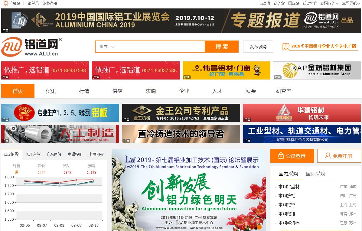 | 網(wǎng)站簡(jiǎn)介: 鋁道網(wǎng) China Aluminium Network,成立于2002年,是杭州商易信息技術(shù)有限公司(http://www.needindex.com)全力為鋁行業(yè)打造的鋁行業(yè)垂直門戶網(wǎng)站,旗下有中文站(www.ALU.cn)和國(guó)際站(www.ALU.com.cn )同時(shí)也是行業(yè)網(wǎng)絡(luò)媒體,主要欄目:行情、咨詢、供應(yīng)、求購、企業(yè)、人才、展會(huì)、研究室等,16年聚焦“互聯(lián)網(wǎng)+鋁業(yè)”,鋁道網(wǎng)致力于打造鋁生態(tài)圈互聯(lián)網(wǎng)鋁產(chǎn)業(yè)上下游,并為鋁行業(yè)企業(yè)提供一站式互聯(lián)網(wǎng)解決方案。 |