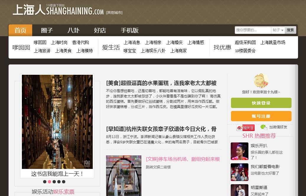| 網(wǎng)站簡介: 上海19樓是上海最大的城市社區(qū)門戶,是本地人討論美食、旅游、購物、交友、結婚、育兒、租房、招聘等話題的首選網(wǎng)站。 |