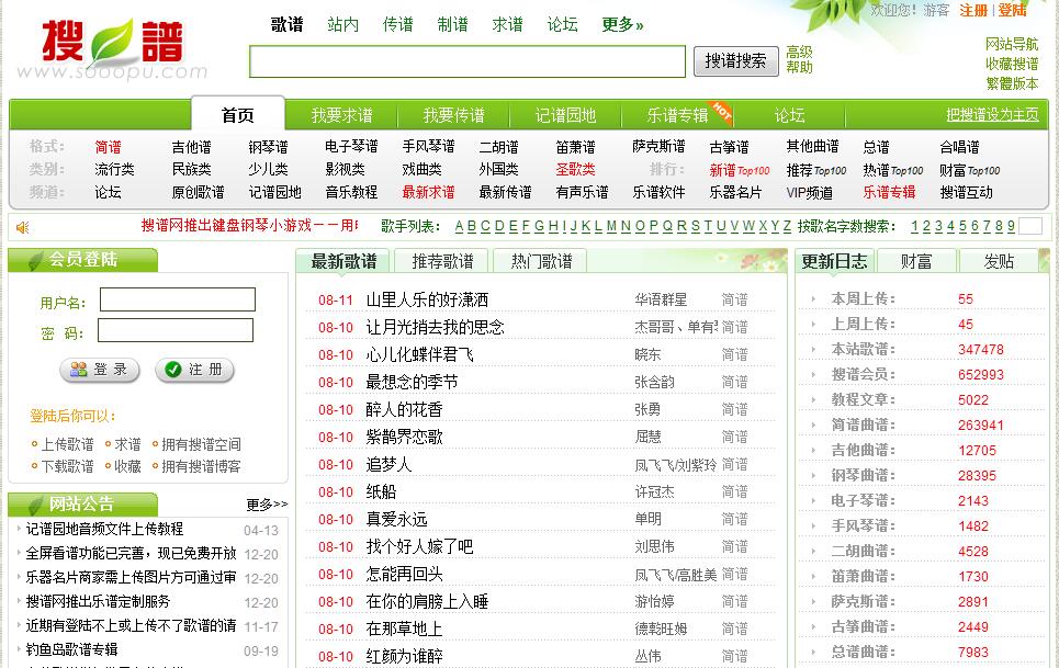 搜譜,一個(gè)免費(fèi)的歌譜網(wǎng)站,打造全國(guó)最大的歌譜搜索引擎! 搜譜成立的初衷是想讓更多音樂(lè)和樂(lè)器愛好者帶來(lái)方便,因?yàn)楸救艘彩且粋€(gè)樂(lè)器愛好者,曾為了彈奏自己喜歡的音樂(lè)買了很多歌本,其中買來(lái)的歌本有大部份是因?yàn)槠渲杏幸粌墒资亲约赫嬲矚g的,而其他的都重復(fù)了,有些浪費(fèi),而目前網(wǎng)上歌譜資源還是不多的,有些歌譜站還是要收費(fèi)的,為此,決心做一個(gè)全國(guó)最大的免費(fèi)歌譜搜索引擎!搜譜于2006年4月正式推出,在推出不到一個(gè)月的時(shí)間里,歌譜總量已突破一萬(wàn),平均每天都有幾千人訪問(wèn),來(lái)索譜的人也越來(lái)越多。目前搜譜網(wǎng)還處于一個(gè)起步階段,很多功能還在開發(fā)當(dāng)中,希望得到更多朋友的支持和幫助,相信搜譜會(huì)越來(lái)越完善!