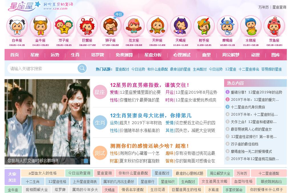 星座屋(www.xzw.com)是廣東酷樂互娛科技股份有限公司的主打產(chǎn)品,創(chuàng)建與2011年6月1日,是一個集合中西方占星文化、命理推算文化、心理測試文化、星座周邊產(chǎn)品為一體的綜合性星座網(wǎng)站。通過3年的成長,星座屋已經(jīng)居于星座垂直網(wǎng)站流量第1位,有多個星座相關APP產(chǎn)品上線百度,360,等大型搜索網(wǎng)站,并且成功上線了星座屋APP(安卓版),星座屋APP(蘋果版)。星座屋已經(jīng)形成了自己的星座形象與星座產(chǎn)品,網(wǎng)站信息涵蓋了每日運勢、12星座詳解、生肖詳解、星座配對、星座測算、心理測驗、星盤占卜、血型分析、周公解夢、風水命理、星座圖庫等部分,通過官方微博,微信與飛信,每日為用戶提供占星、推算、測試等全方位的服務。星座屋還致力于數(shù)據(jù)平臺的開放,已為國內(nèi)多家大型導航網(wǎng)站(例如:好123,百度,360導航等)提供API接口平臺,讓更多的用戶可以通過星座屋獲取到相關信息,并實現(xiàn)對信息進行定制與推送。致力與打造新一代星座形象品牌,以最好的用戶體驗服務廣大用戶,讓你在生活之余可以體驗和認知新的人生,了解更多的星座信息,通過星座屋平臺結識更多的伙伴,讓我們一起在星座屋的世界里遨游。星座屋提倡的宗旨是:準確!實用!免費!