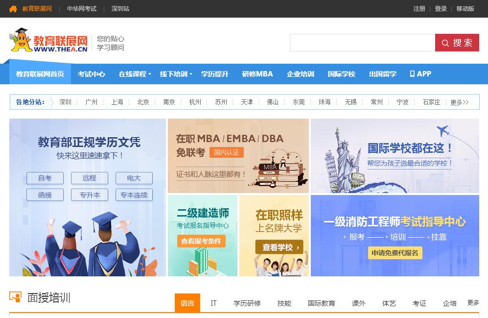 教育聯(lián)展網(wǎng)(thea.cn)十年專注于培訓(xùn)考試行業(yè),為您提供最專業(yè)的考試資料、培訓(xùn)課程、在線考試、網(wǎng)絡(luò)課堂、企業(yè)培訓(xùn)等,助你學(xué)業(yè)、事業(yè)成功!深圳市諾達(dá)教育股份有限公司成立于2006年,位于深圳南山科技園長園新材料港,是一家教育行業(yè)中集信息、技術(shù)、咨詢、服務(wù)為一體的互聯(lián)網(wǎng)企業(yè)。公司將互聯(lián)網(wǎng)電子商務(wù)和教育培訓(xùn)行業(yè)融入一體,傾力打造了中國極具競爭力的教育培訓(xùn)門戶——教育聯(lián)展網(wǎng)、中華網(wǎng)考試、培訓(xùn)碼頭、培訓(xùn)吧等大型課程服務(wù)網(wǎng)站,并有眾多優(yōu)質(zhì)的培訓(xùn)合作機(jī)構(gòu)提供強(qiáng)有力的后盾和支持。目前,在北京、上海、廣州、杭州、南京、蘇州和深圳設(shè)有多家分/子公司及辦事處。團(tuán)隊由一群熱愛互聯(lián)網(wǎng)事業(yè),樂于服務(wù),積極向上的年輕人組成,公司氛圍活躍,朝氣蓬勃,以科學(xué)的管理理念和優(yōu)秀的技術(shù)人才構(gòu)筑公司極其寶貴的財富和極具競爭優(yōu)勢的資源,已形成一支集技術(shù)平臺開發(fā)和教育培訓(xùn)服務(wù)為一體的優(yōu)秀團(tuán)隊。